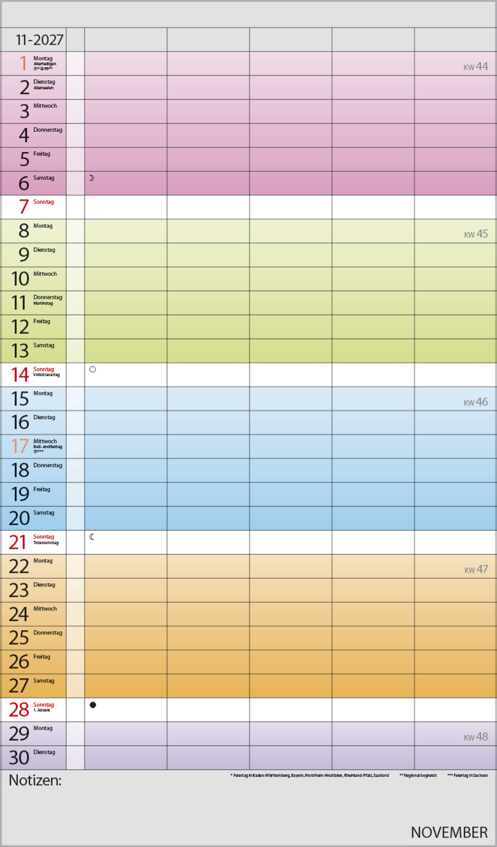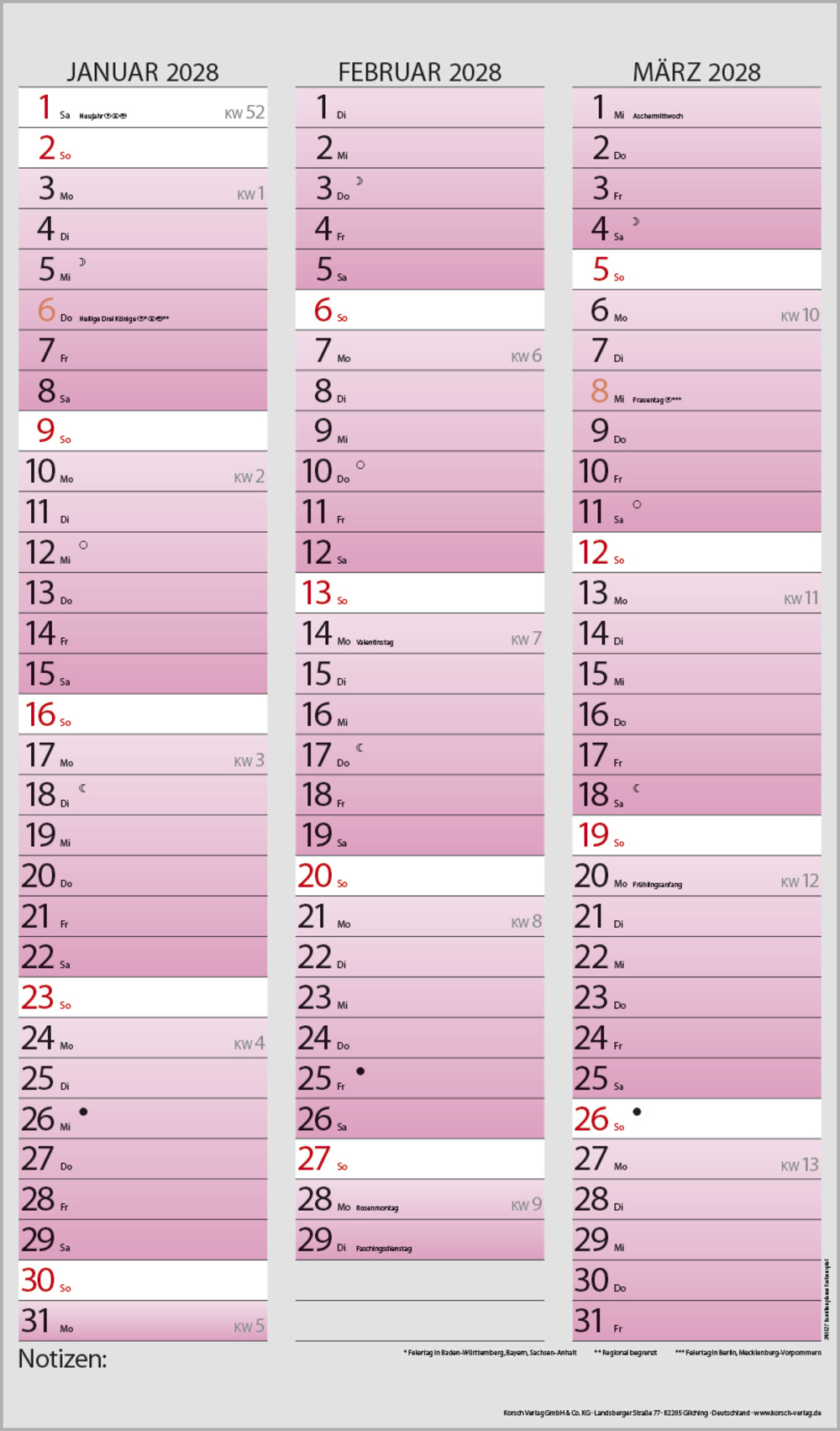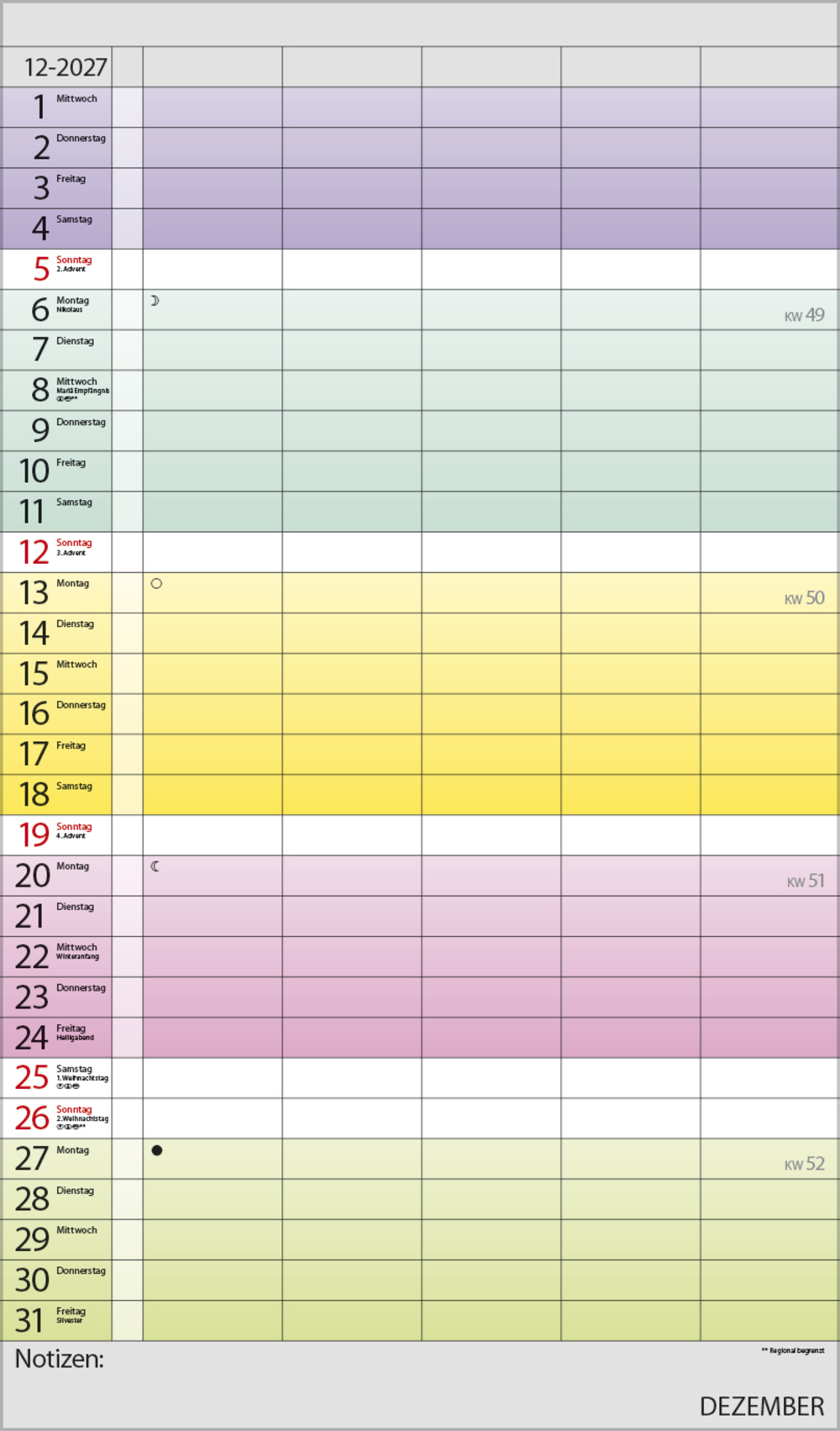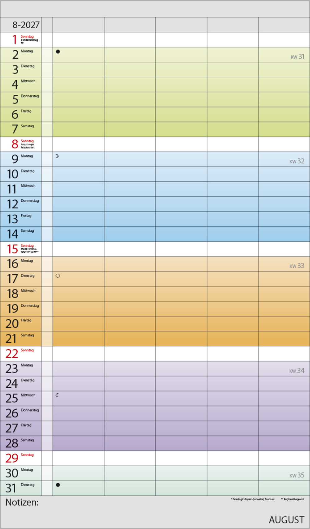 Hinzu kommen farblich hervorgehobene Sonn- und Feiertage, sowie die Anzeige der Zeitumstellung, damit kein Termin mehr übersehen wird. Weitere Informationen wie Mondphasen, Ferientermine und Feiertage (auch regionale) sowie deutlich lesbare Kalenderwochen runden den Kalender ab und sorgen für einen vollständigen Überblick Ihres Jahres.