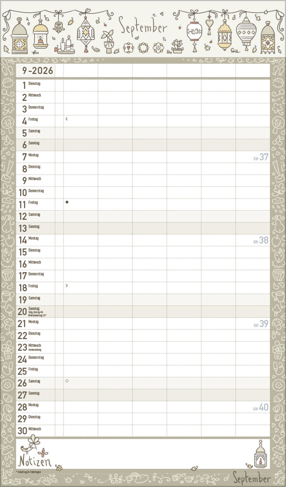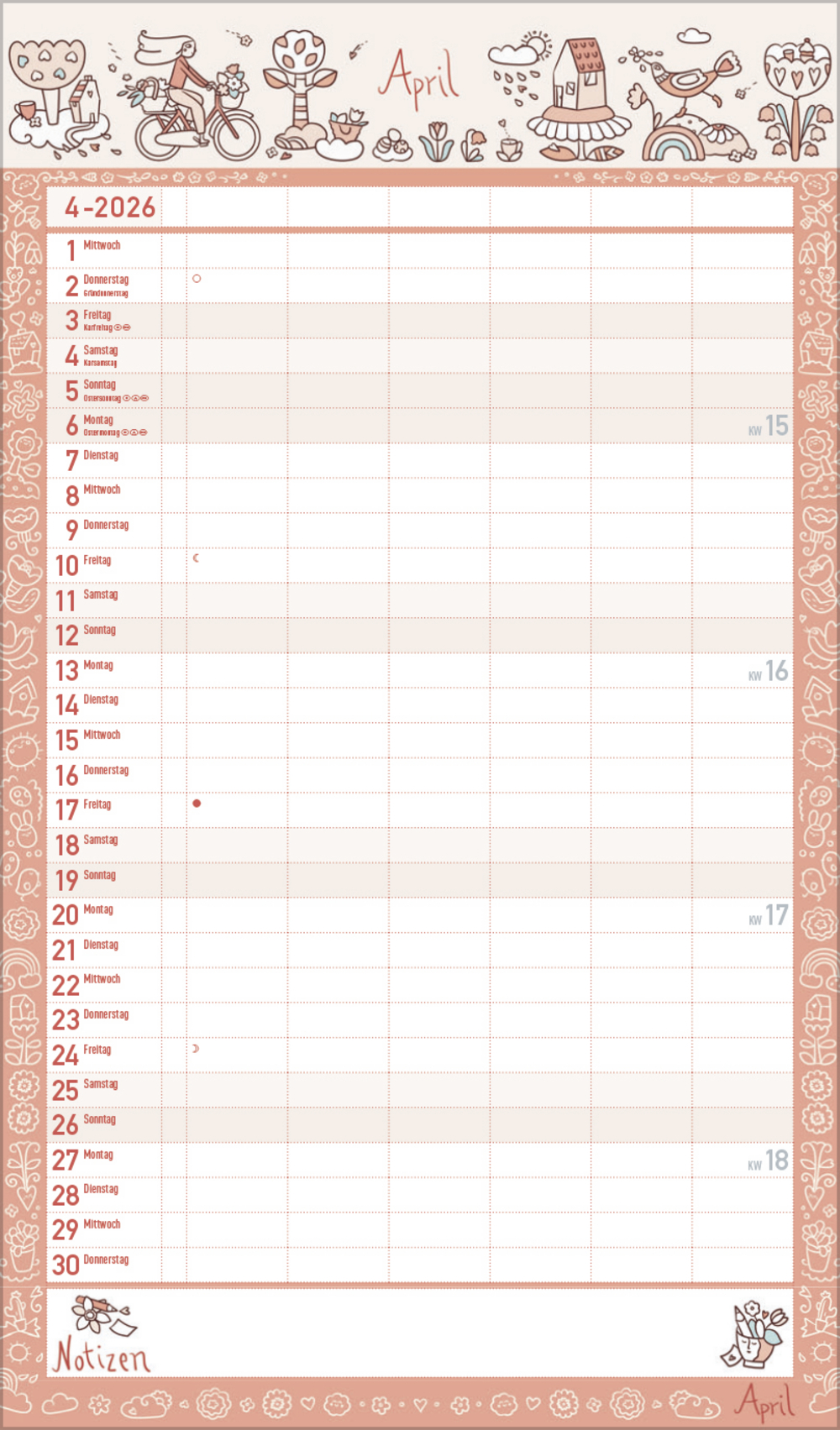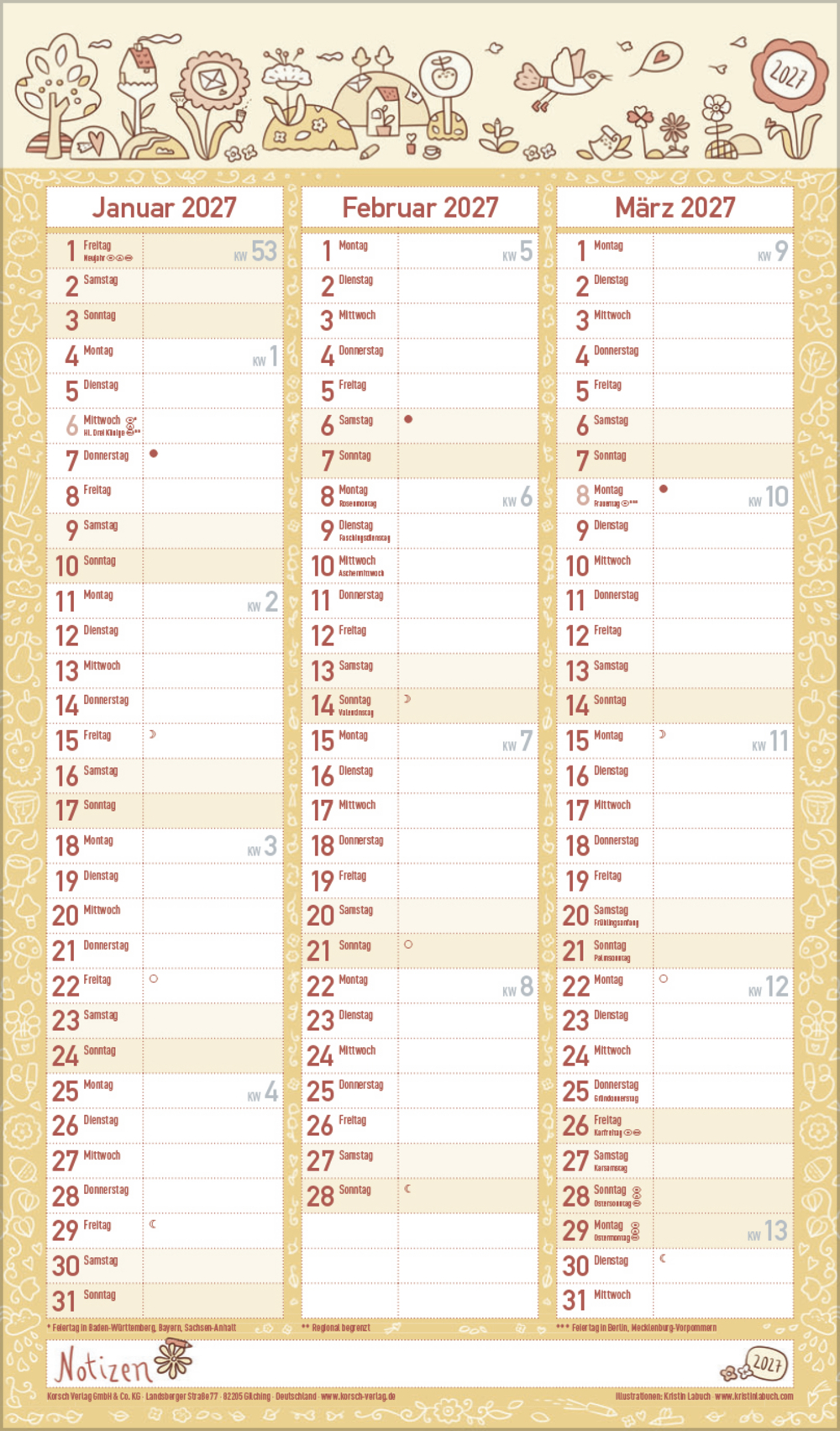 Lieblingspläne und sonstige Termine finden ausreichend Platz in diesem liebevoll und exklusiv für Korsch gestalteten Familienplaner. Daneben gibt es viel zu entdecken, denn Kristin Labuch aus Münster hat unzählige kleine Figuren und Elemente handgezeichnet und zu herzerwärmenden kleinen Szenen verwoben, getaucht in harmonische, ruhige Farbwelten. Sechs Spalten plus Müllspalte und eine Vorschau ins nächste Jahr sowie Ferientermine helfen bei der Planung.