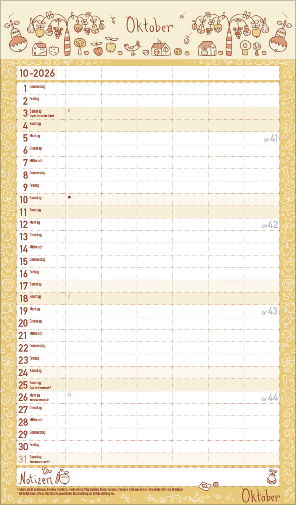 - Farblich hervorgehobene Sonn- und Feiertage, sowie Anzeige der Zeitumstellung