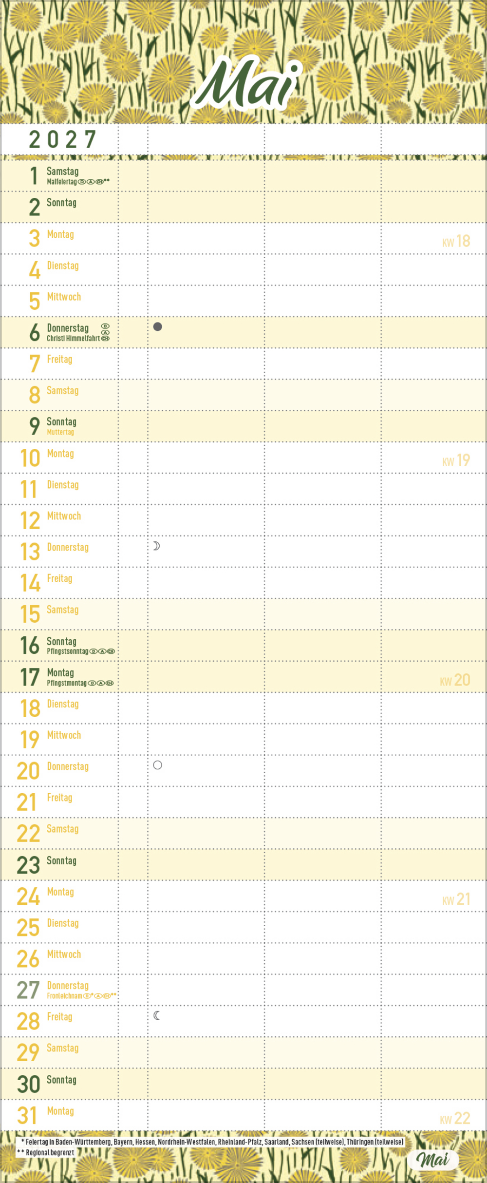Ein Gute-Laune-Planer für alle, die nicht so viel Platz an der Wand haben. Florale Muster und bunte Motive geben jedem Monat einen fröhlichen Rahmen, in drei Spalten und einer Müllspalte kann geplant und eingetragen werden, was wichtig ist. Mit Ferienterminen und Vorschau bis März des Folgejahres.
