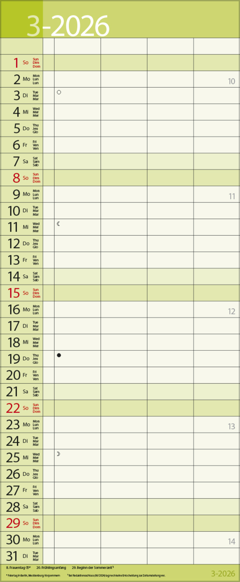 - Farblich hervorgehobene Sonn- und Feiertage, sowie Anzeige der Zeitumstellung