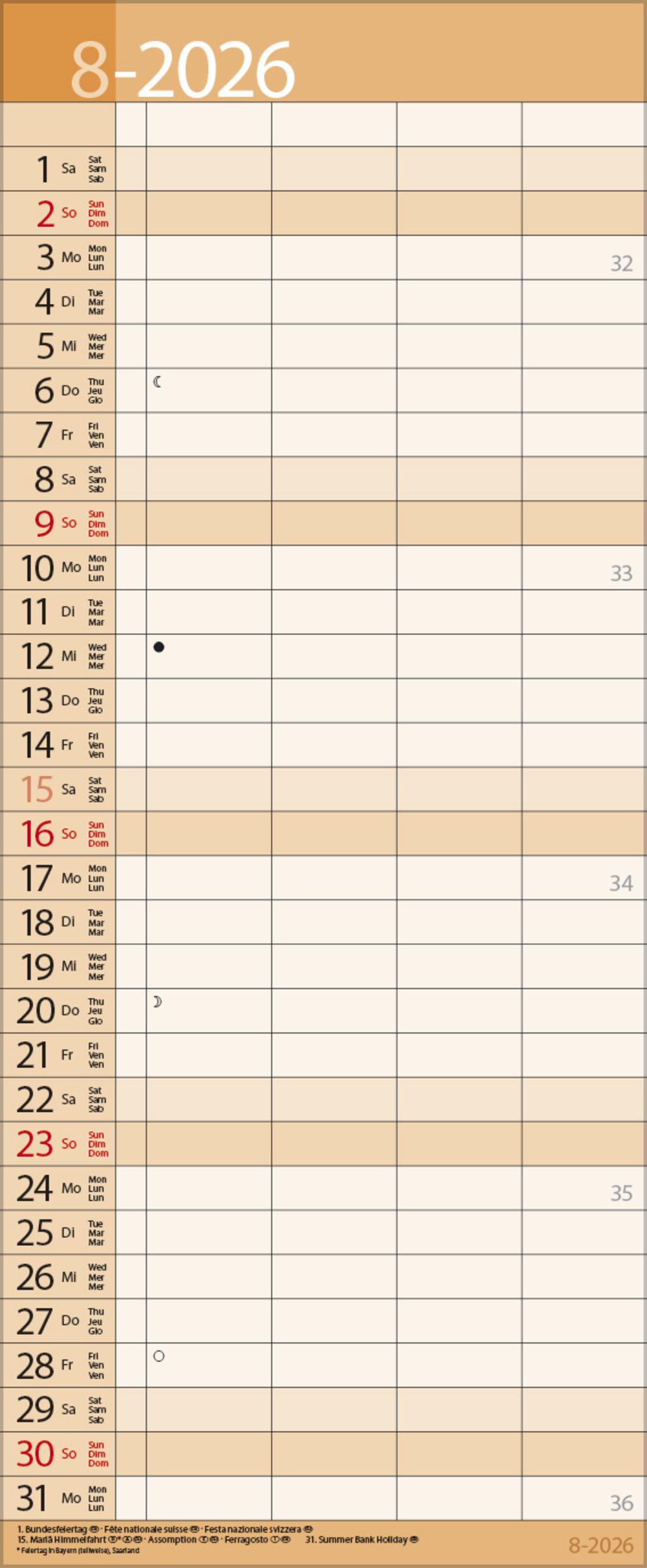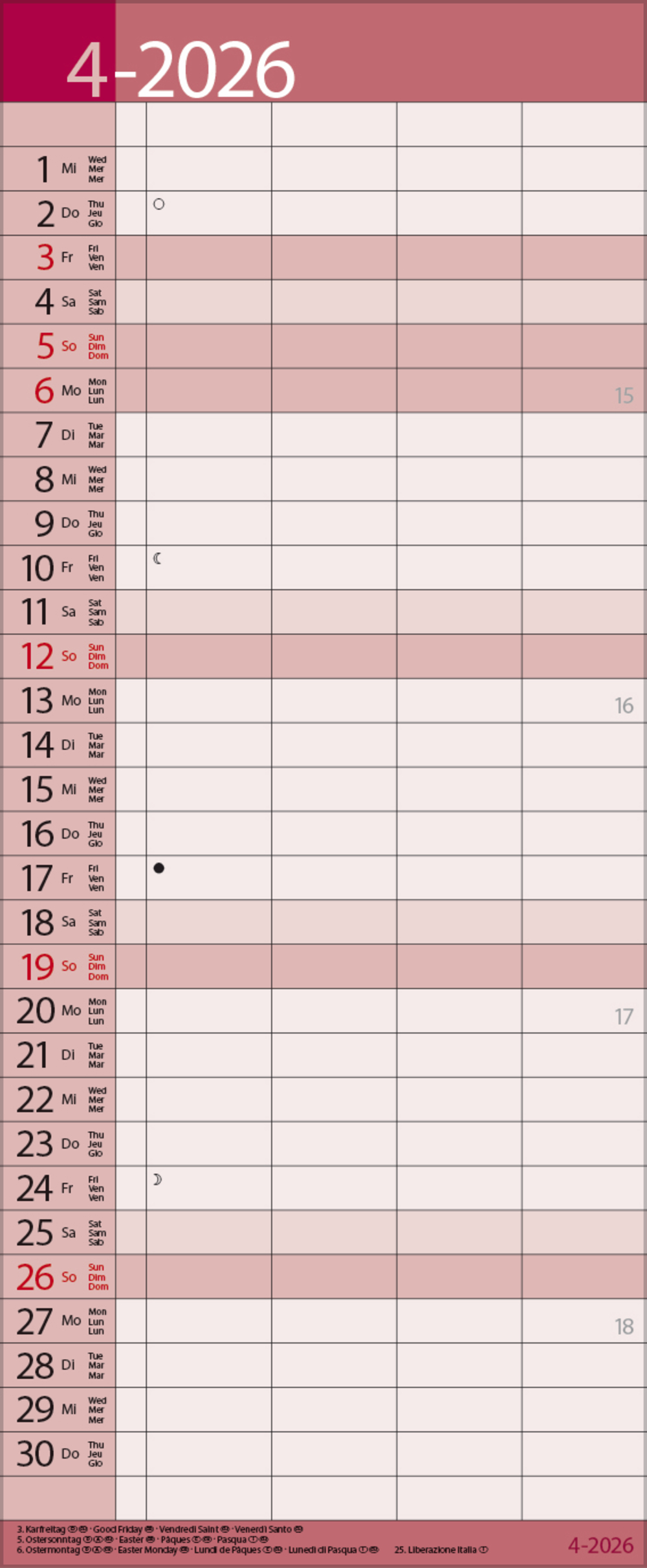 - Mehrsprachiges Kalendarium (d,e,f,i) mit regionalen Feiertagen für Deutschland, Österreich und Schweiz