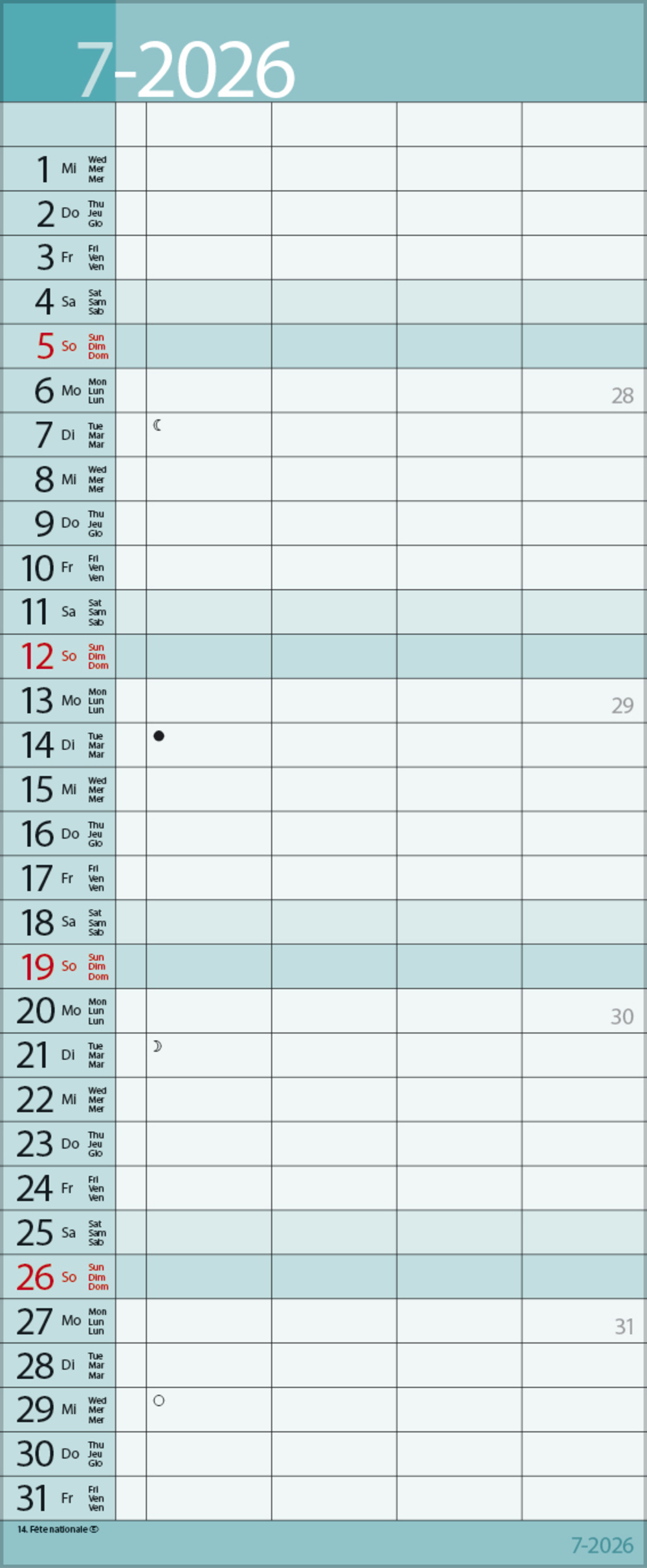 Weitere Informationen wie Mondphasen, Ferientermine und Feiertage (auch regionale) sowie deutlich lesbare Kalenderwochen runden den Kalender ab und sorgen für einen vollständigen Überblick Ihres Jahres.