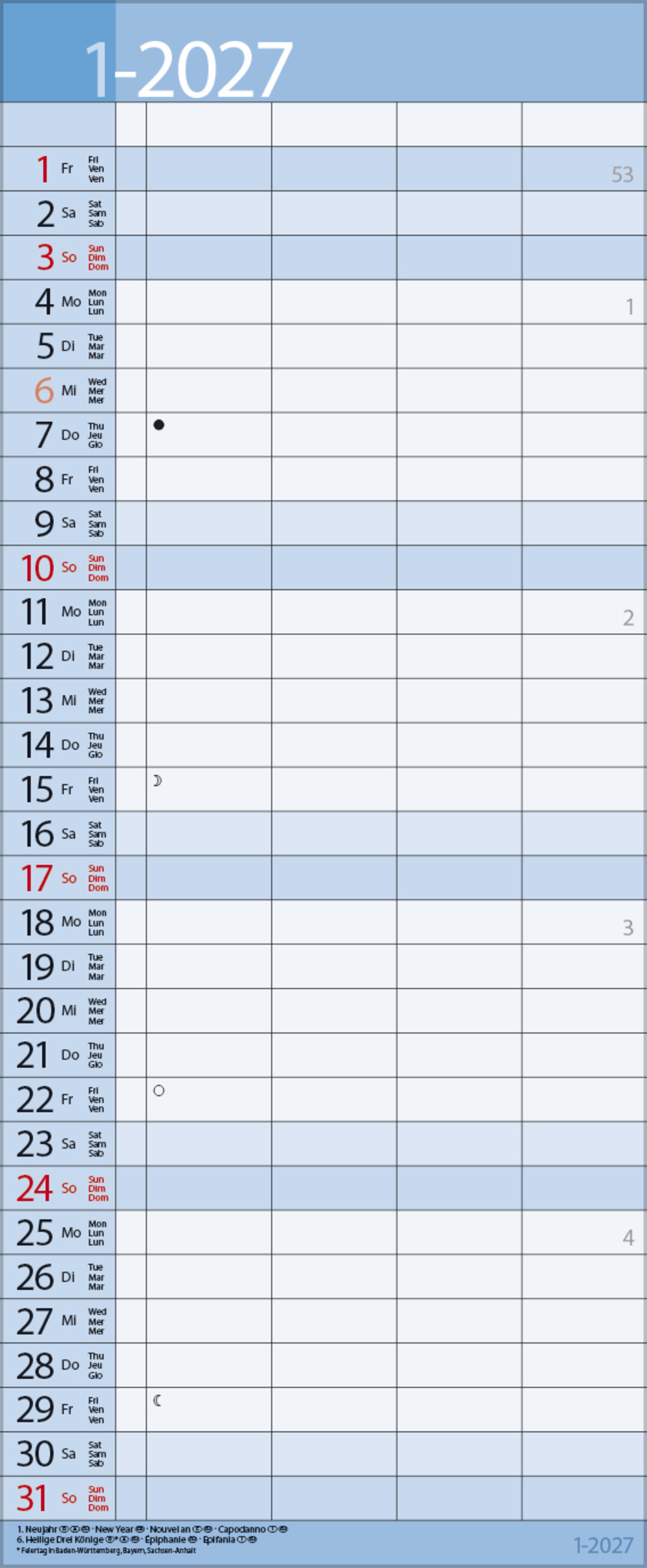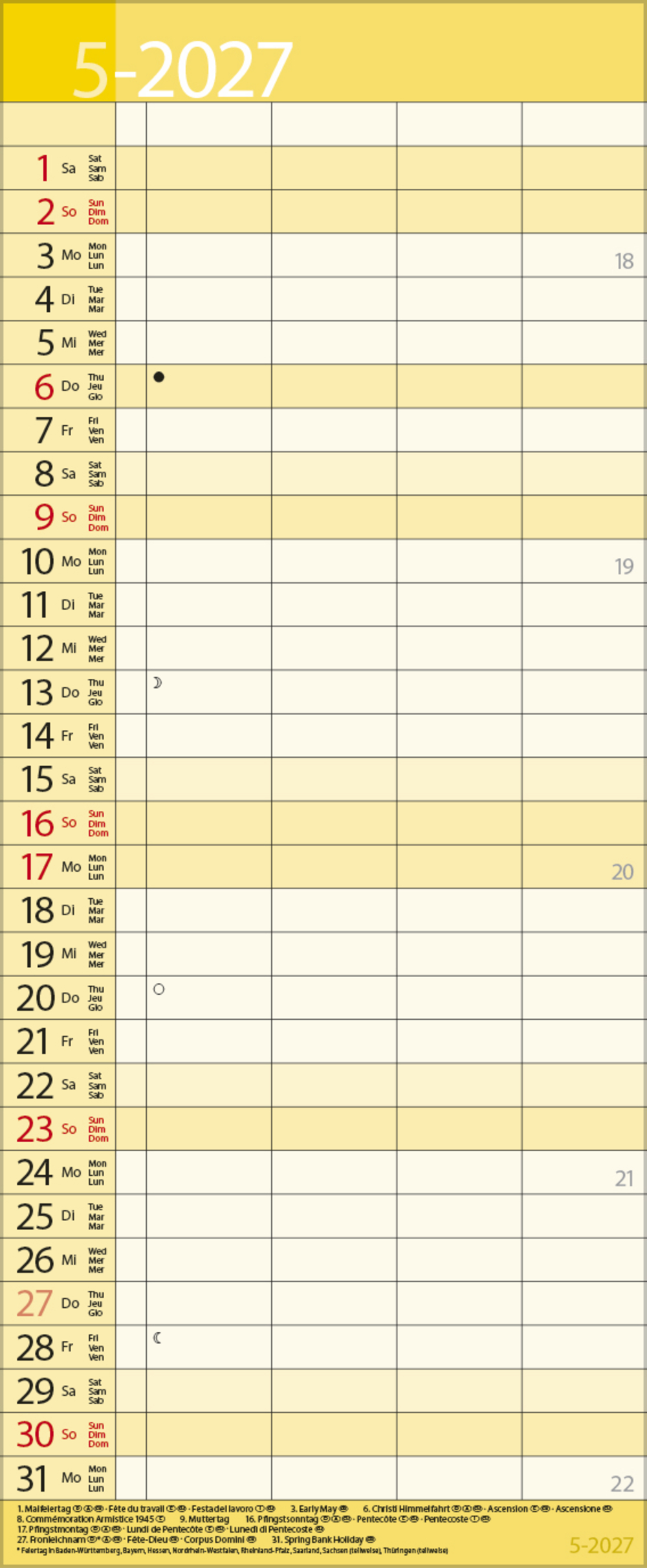 - Mehrsprachiges Kalendarium (d,e,f,i) mit regionalen Feiertagen für Deutschland, Österreich und Schweiz
