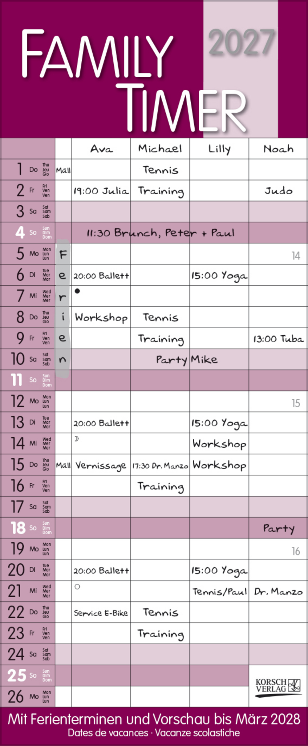 Dieser Wandkalender hilft Ihnen dabei alle wichtigen Termine stets im Blick zu haben. Mit vier Spalten zum Eintragen von Geburtstagen, Terminen und Erinnerungen bietet dieser Jahreskalender viel Platz für Notizen. Dadurch ist es auch möglich mehrere Termine in einen Tag zu schreiben. Er eignet sich perfekt für die Organisation des Ehe- oder Familienlebens. Neben dem gesamten Kalenderjahr enthält der Wandplaner auch eine Vorschau bis März des Folgejahres.