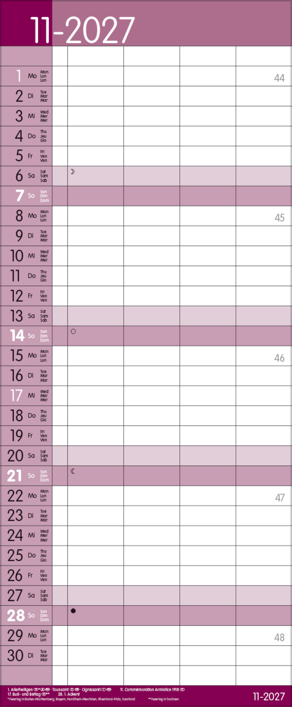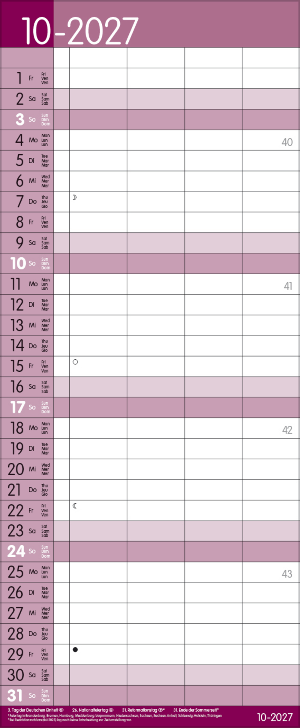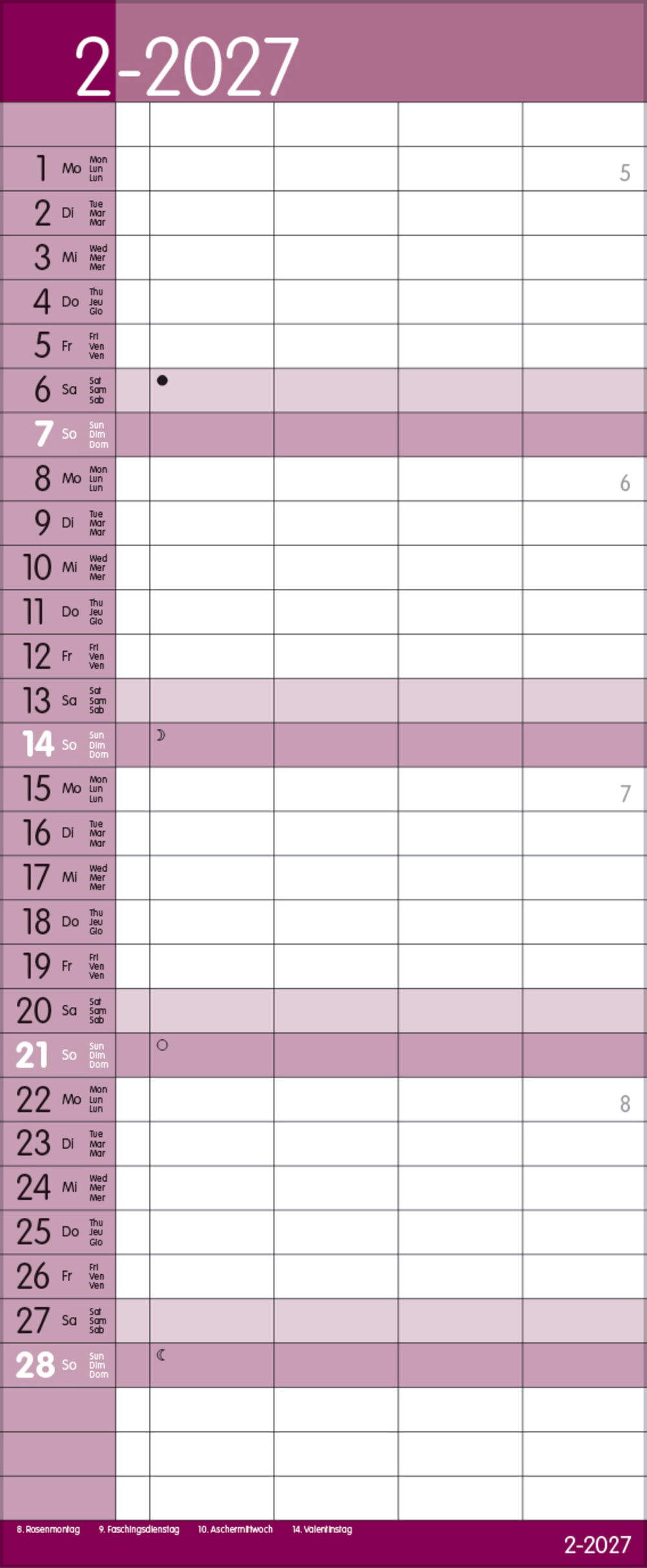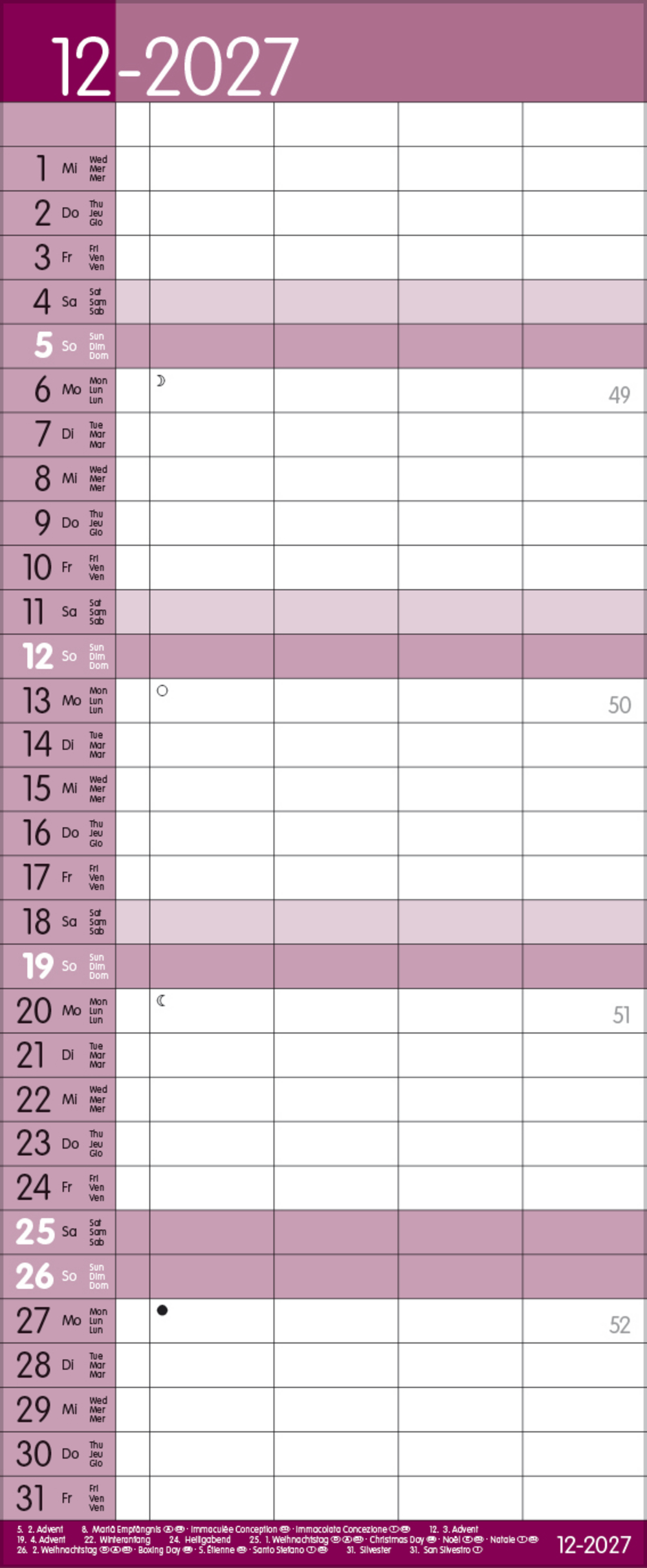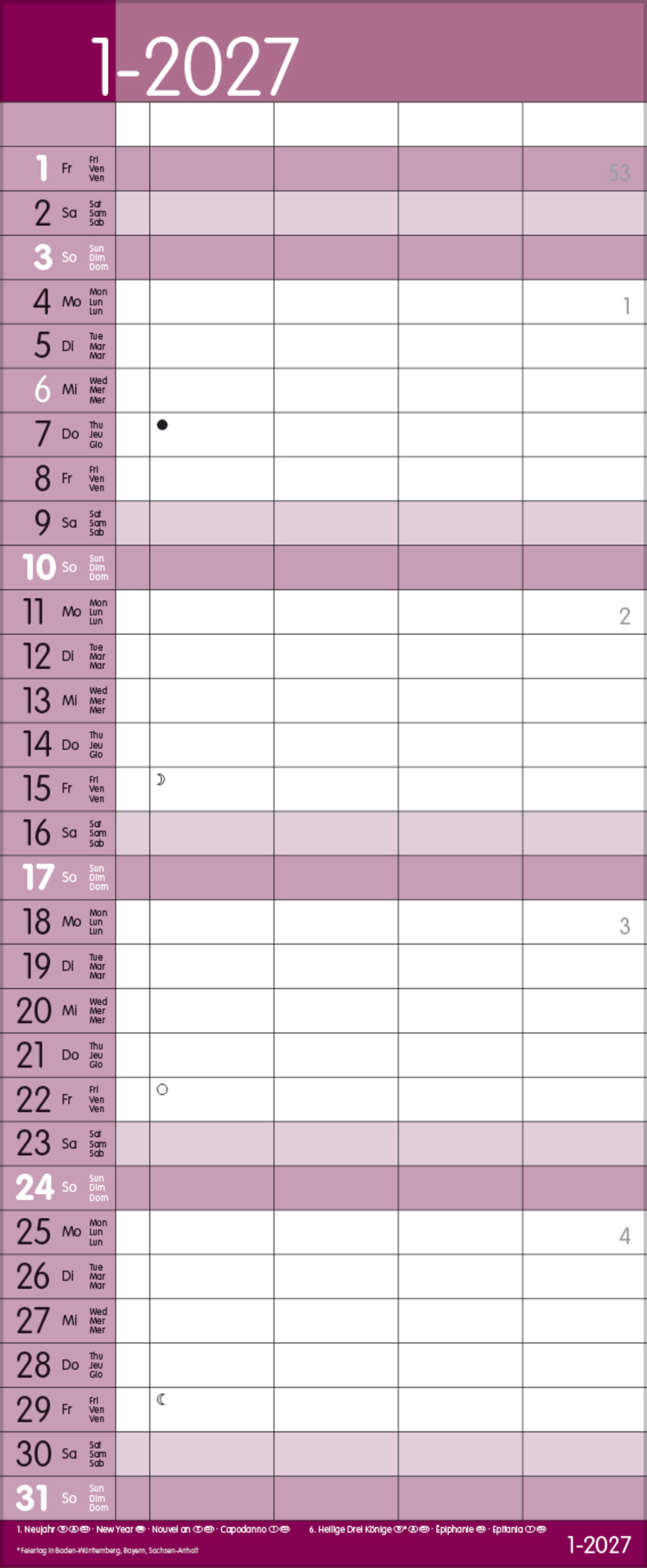 Weitere Informationen wie Mondphasen, Ferientermine und Feiertage (auch regionale) sowie deutlich lesbare Kalenderwochen runden den Kalender ab und sorgen für einen vollständigen Überblick Ihres Jahres.