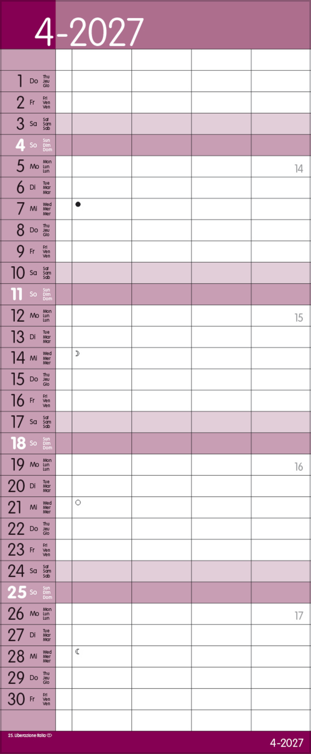 - Mehrsprachiges Kalendarium (d,e,f,i) mit regionalen Feiertagen für Deutschland, Österreich und Schweiz
