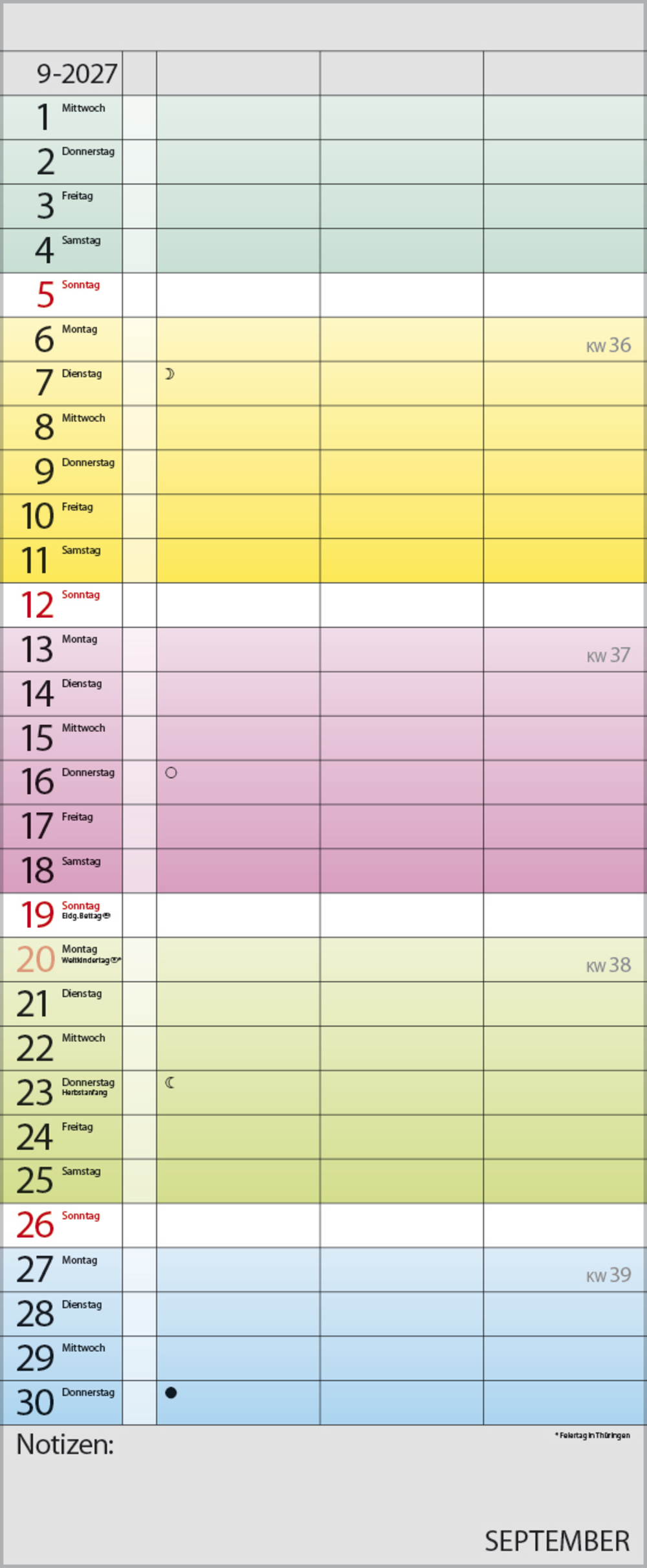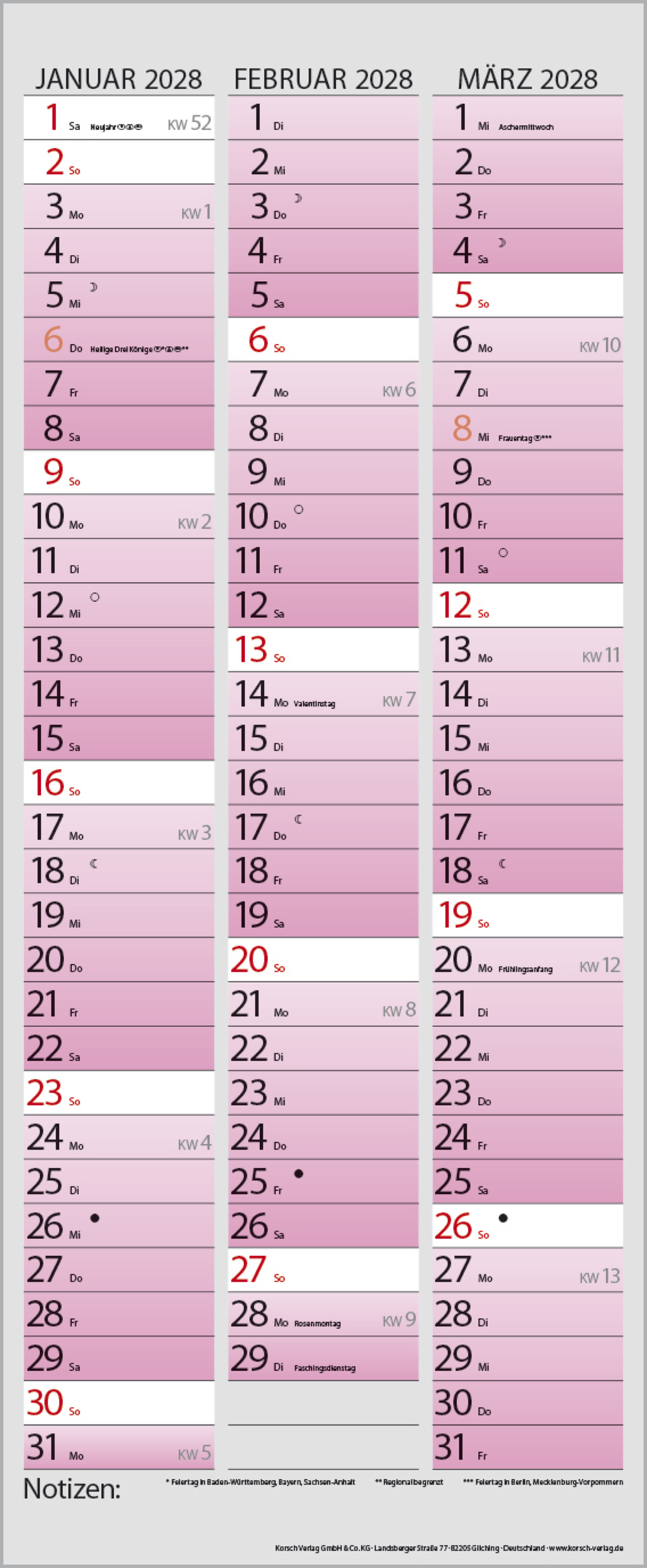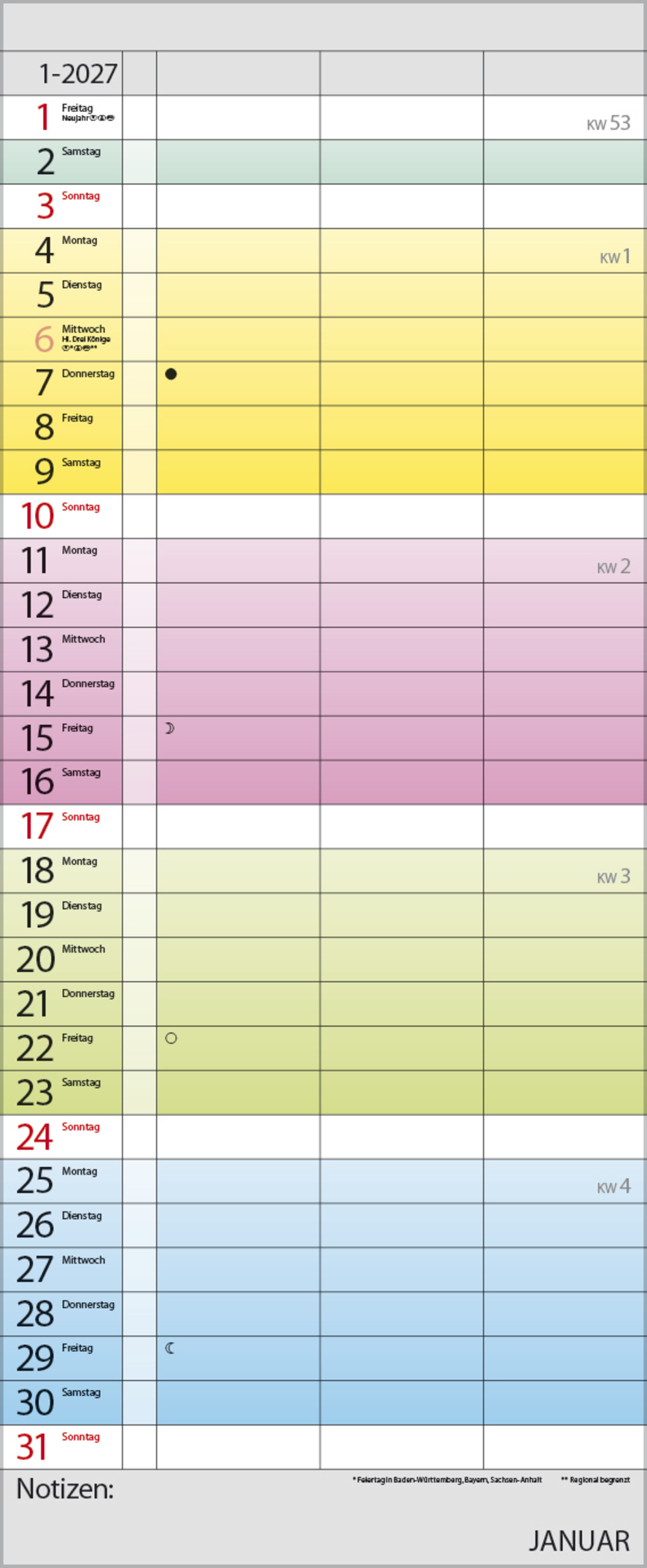Praktischer Timer mit 3 Spalten und frischem Design. Jede Woche in einem anderen modernen Farbton für noch mehr übersichtlichkeit. Mit Müllspalte, Ferienterminen und Vorschau bis März des Folgejahres. Kalendarium deutsch.