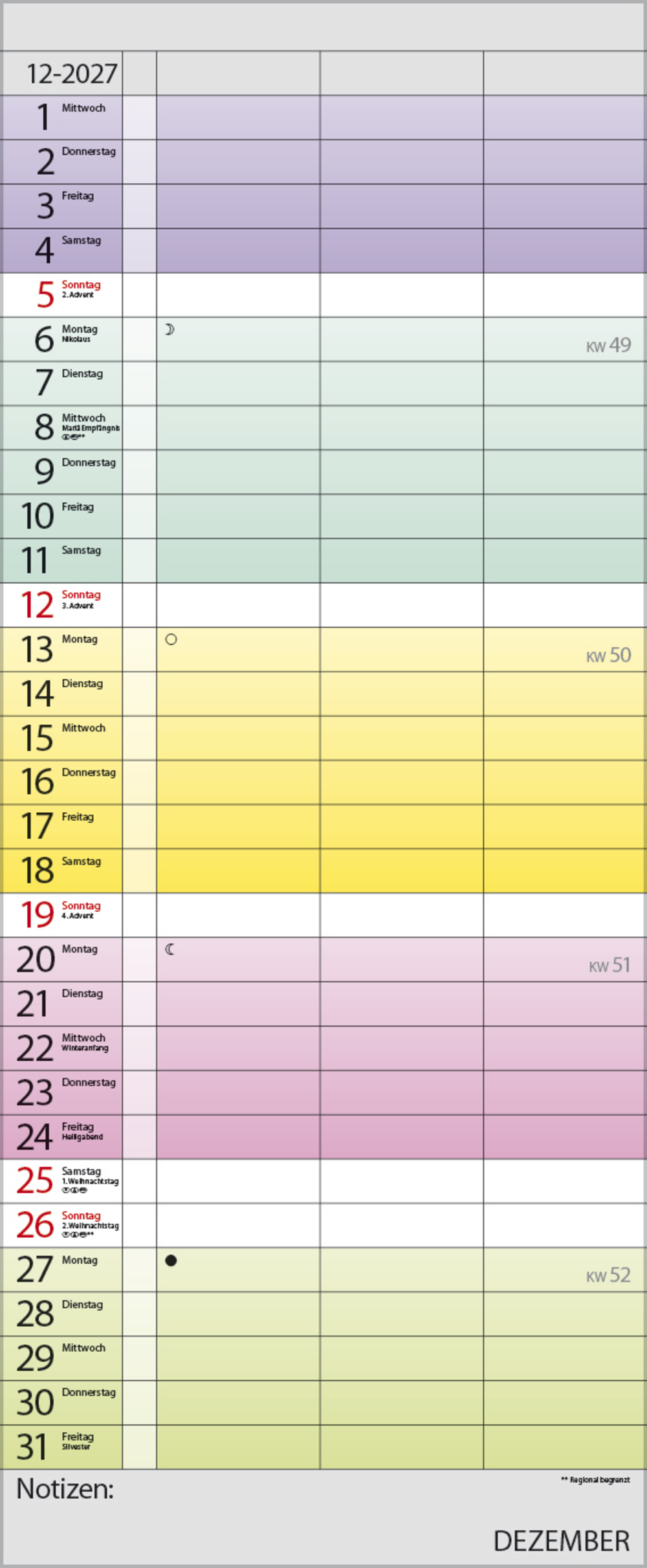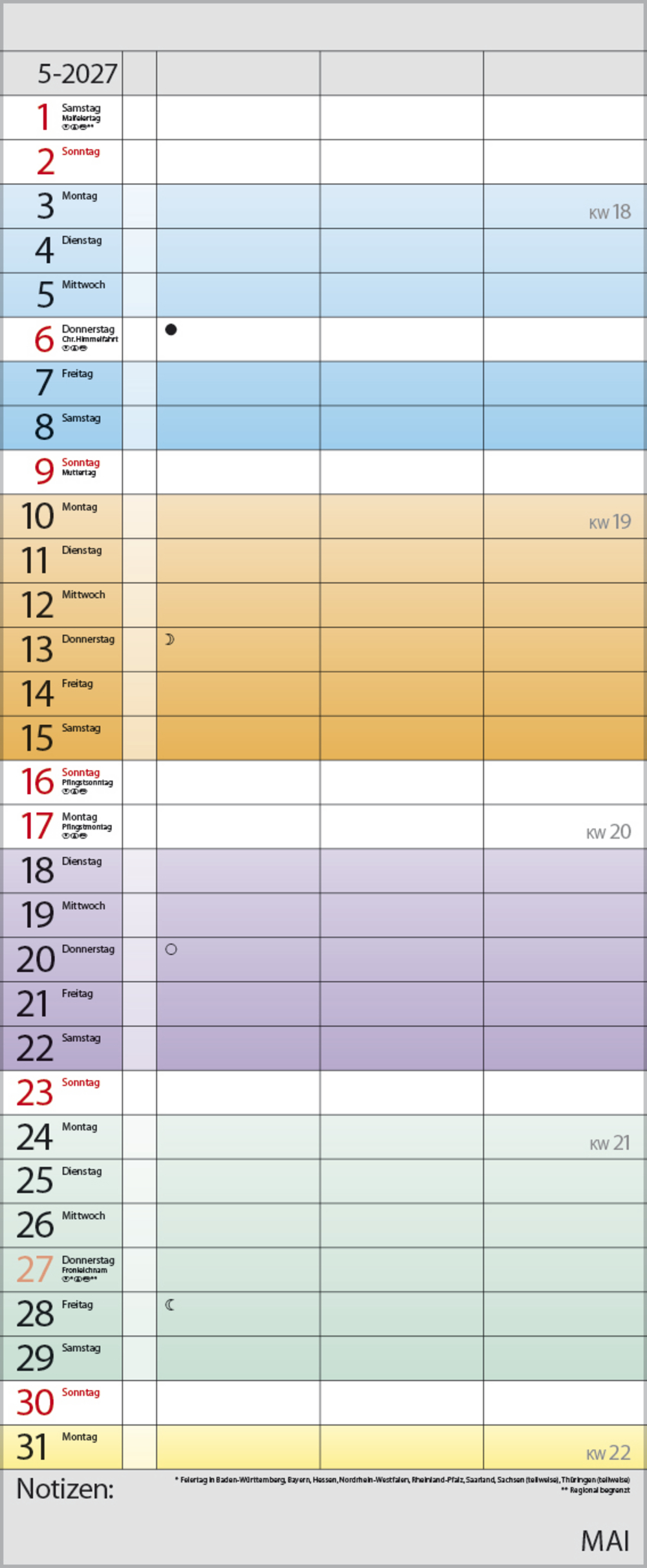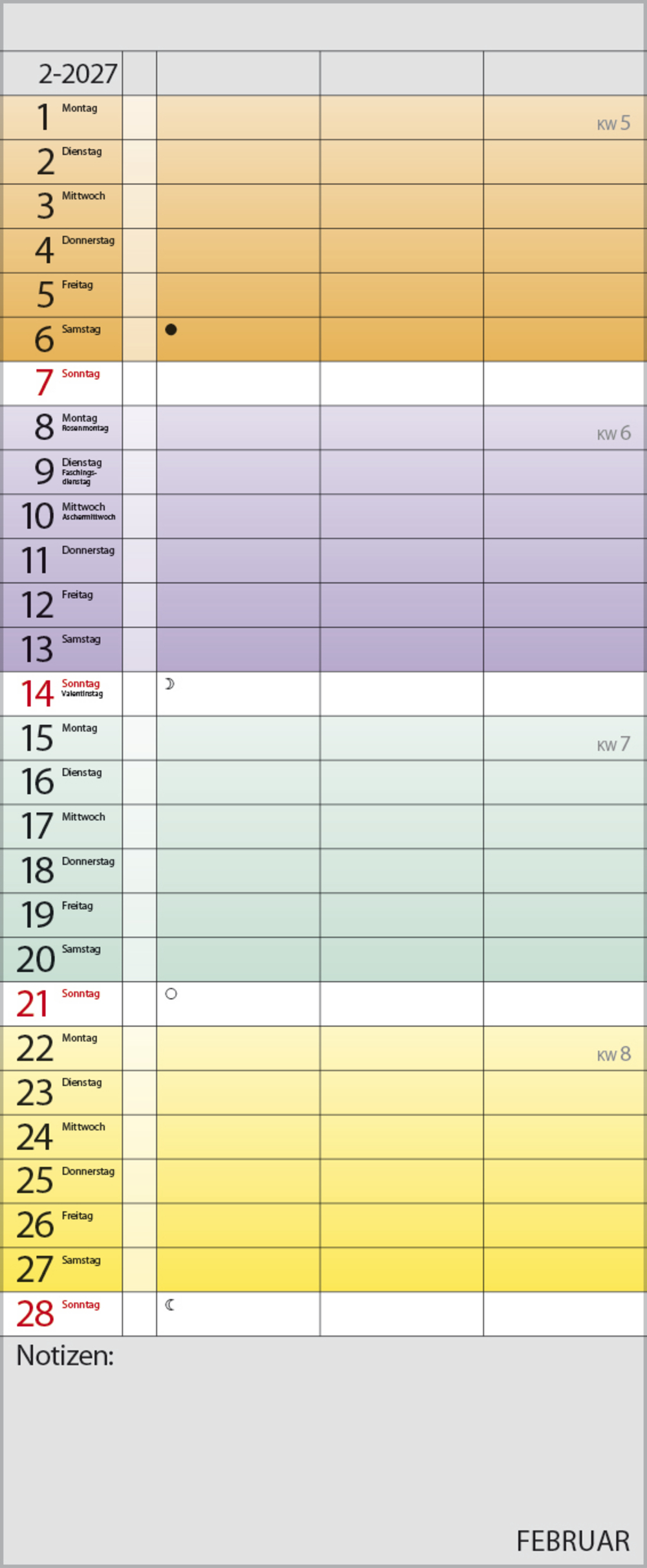 Praktischer Timer mit 3 Spalten und frischem Design. Jede Woche in einem anderen modernen Farbton für noch mehr übersichtlichkeit. Mit Müllspalte, Ferienterminen und Vorschau bis März des Folgejahres. Kalendarium deutsch.