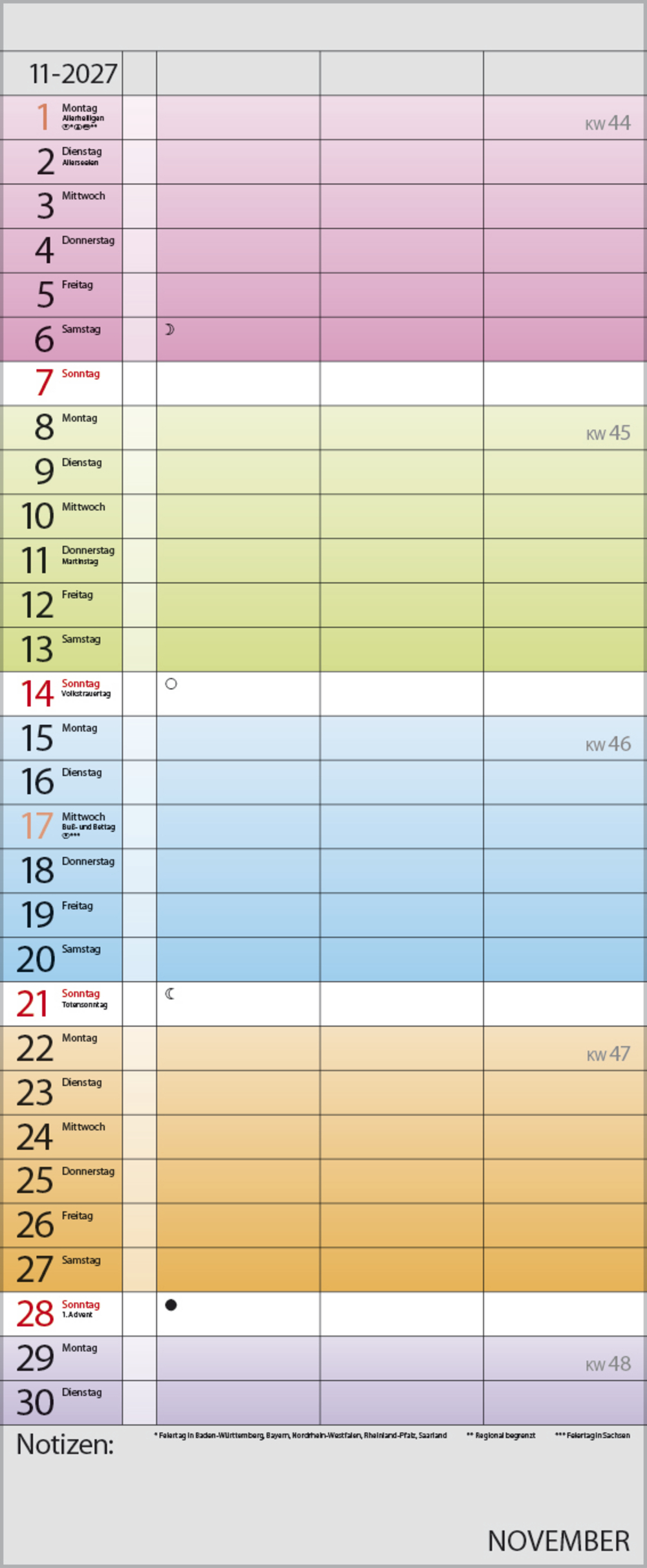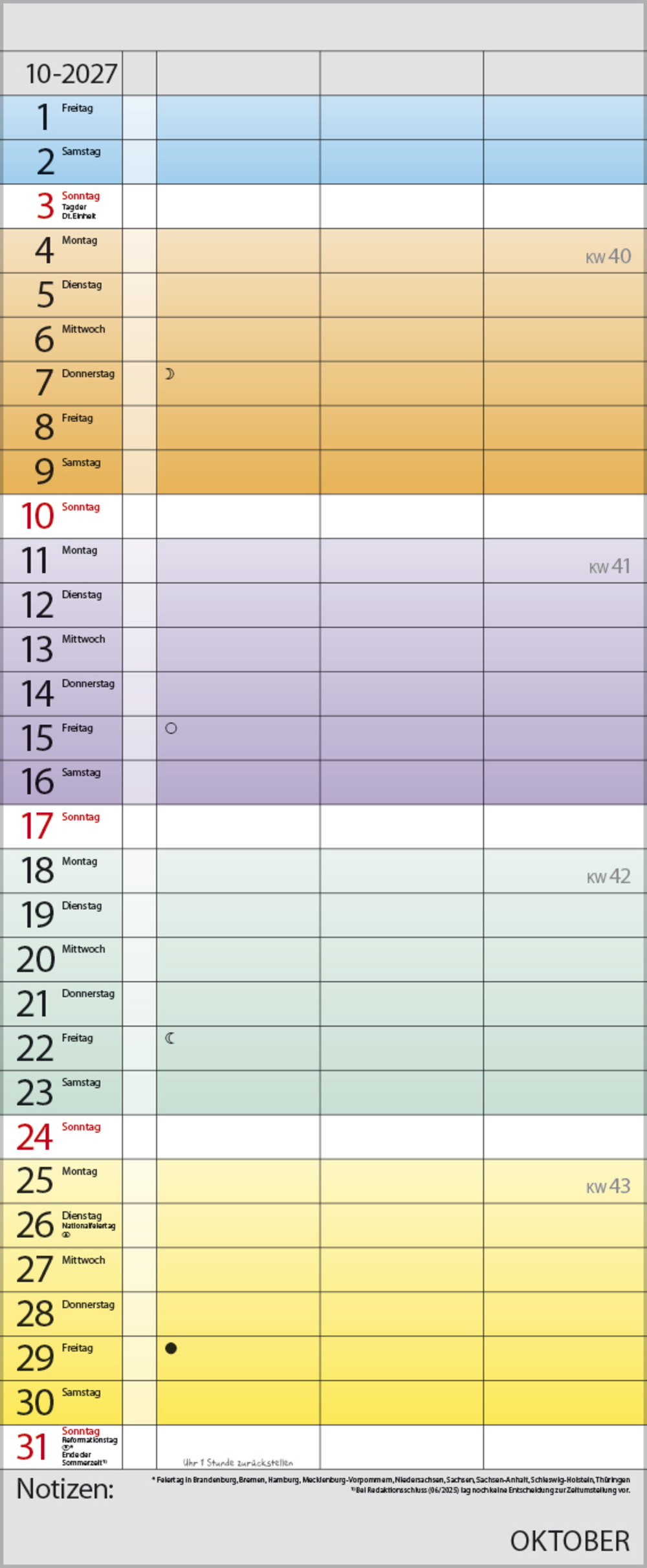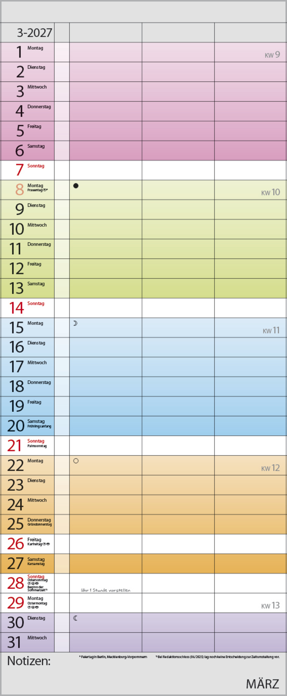 • Farblich hervorgehobene Sonn- und Feiertage, Anzeige der Zeitumstellung
