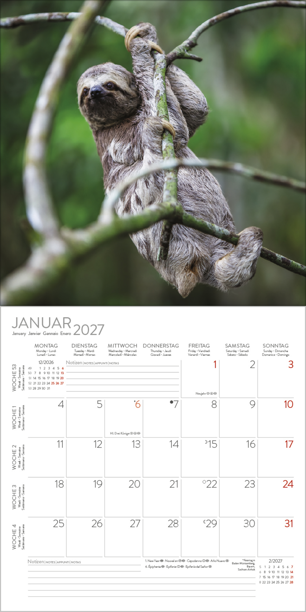 - Jede Kalenderseite mit großem Bild und viel Platz im Kalendarium für Notizen und Termine