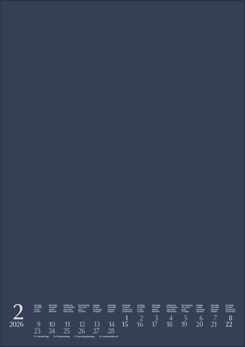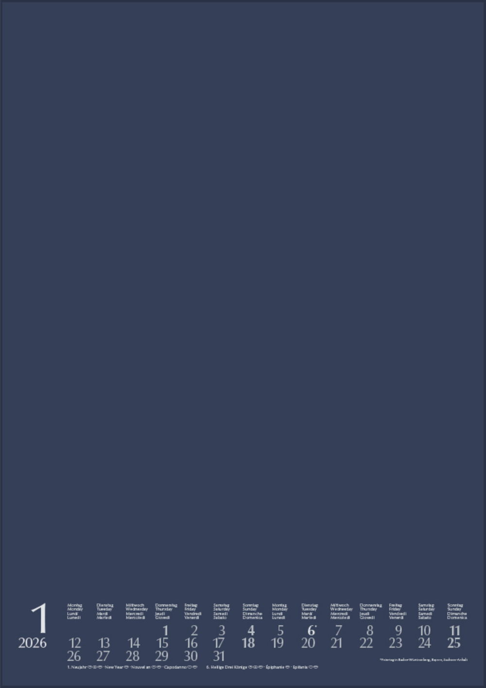 • Mehrsprachiges Kalendarium mit Feiertagen für Deutschland, Österreich und Schweiz