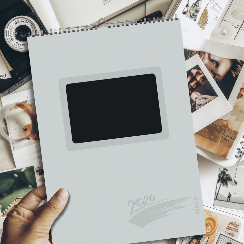 Hochwertiger Kalender mit silbernem Deckblatt, ausgestanztem Fenster und schwarzem Karton