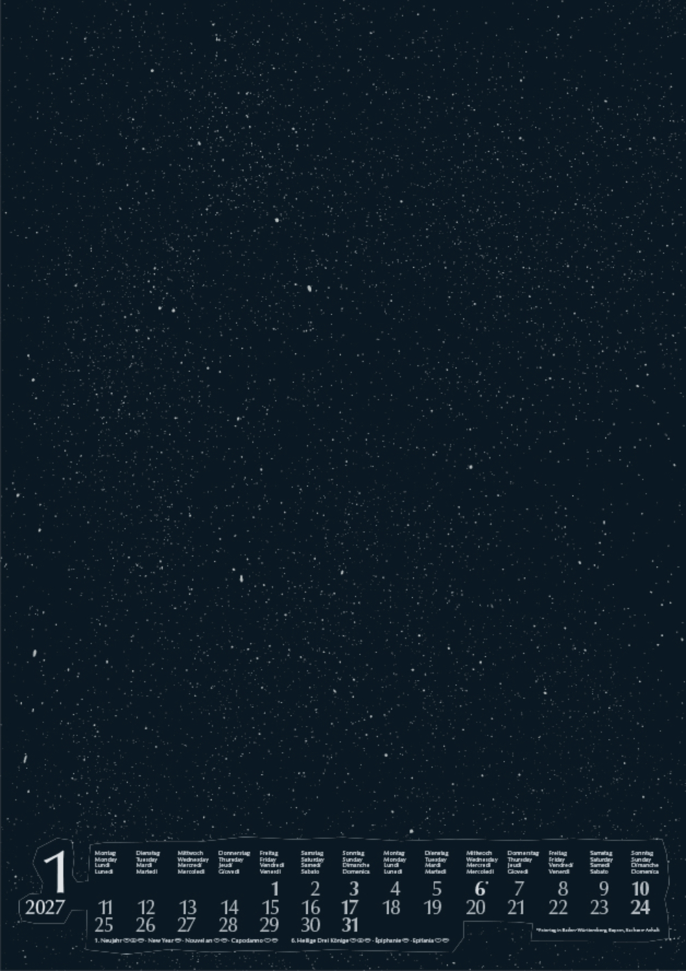 Hochwertiger Kalender mit silbernem Deckblatt, ausgestanztem Fenster und schwarzem Karton