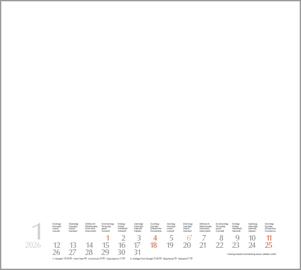 • Mehrsprachiges Kalendarium mit Feiertagen für Deutschland, Österreich und Schweiz