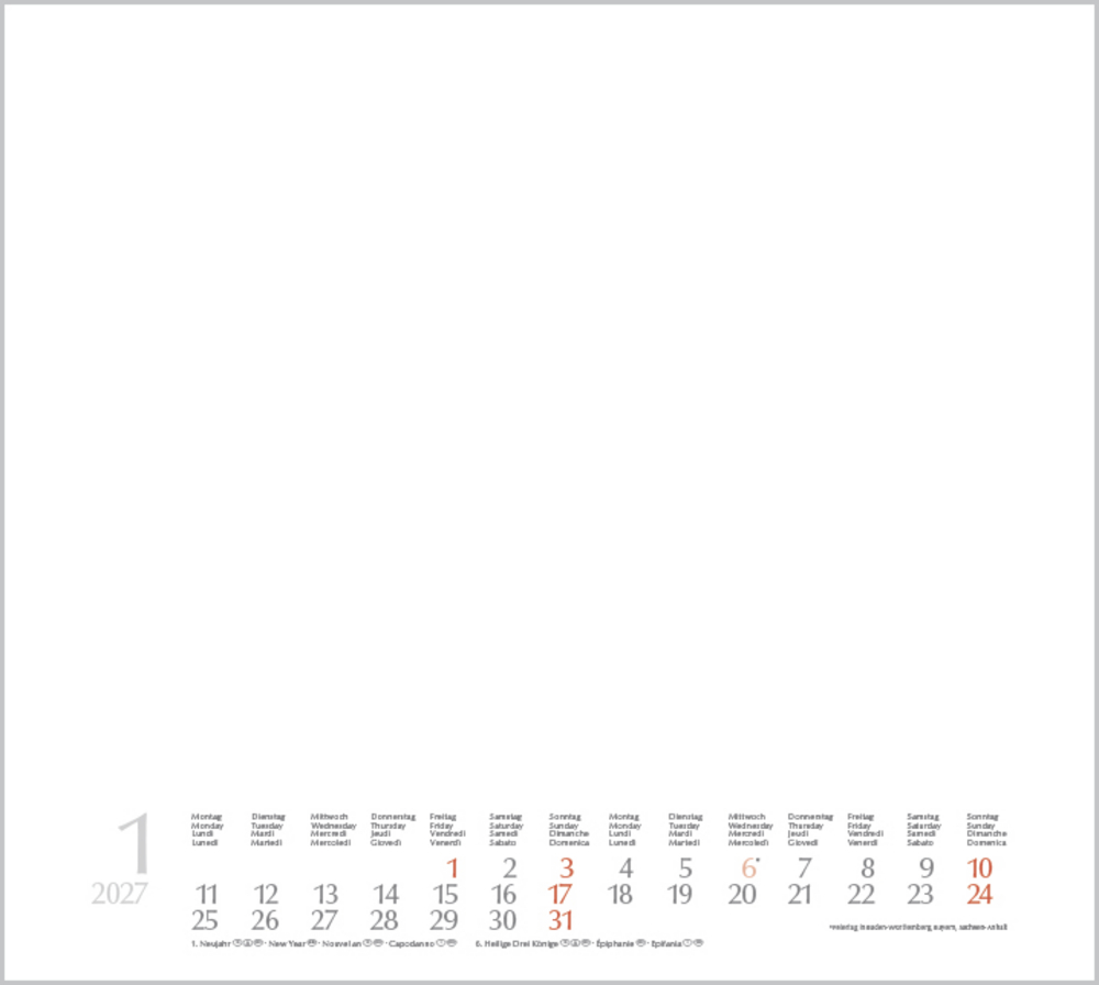 • Mehrsprachiges Kalendarium mit Feiertagen für Deutschland, Österreich und Schweiz