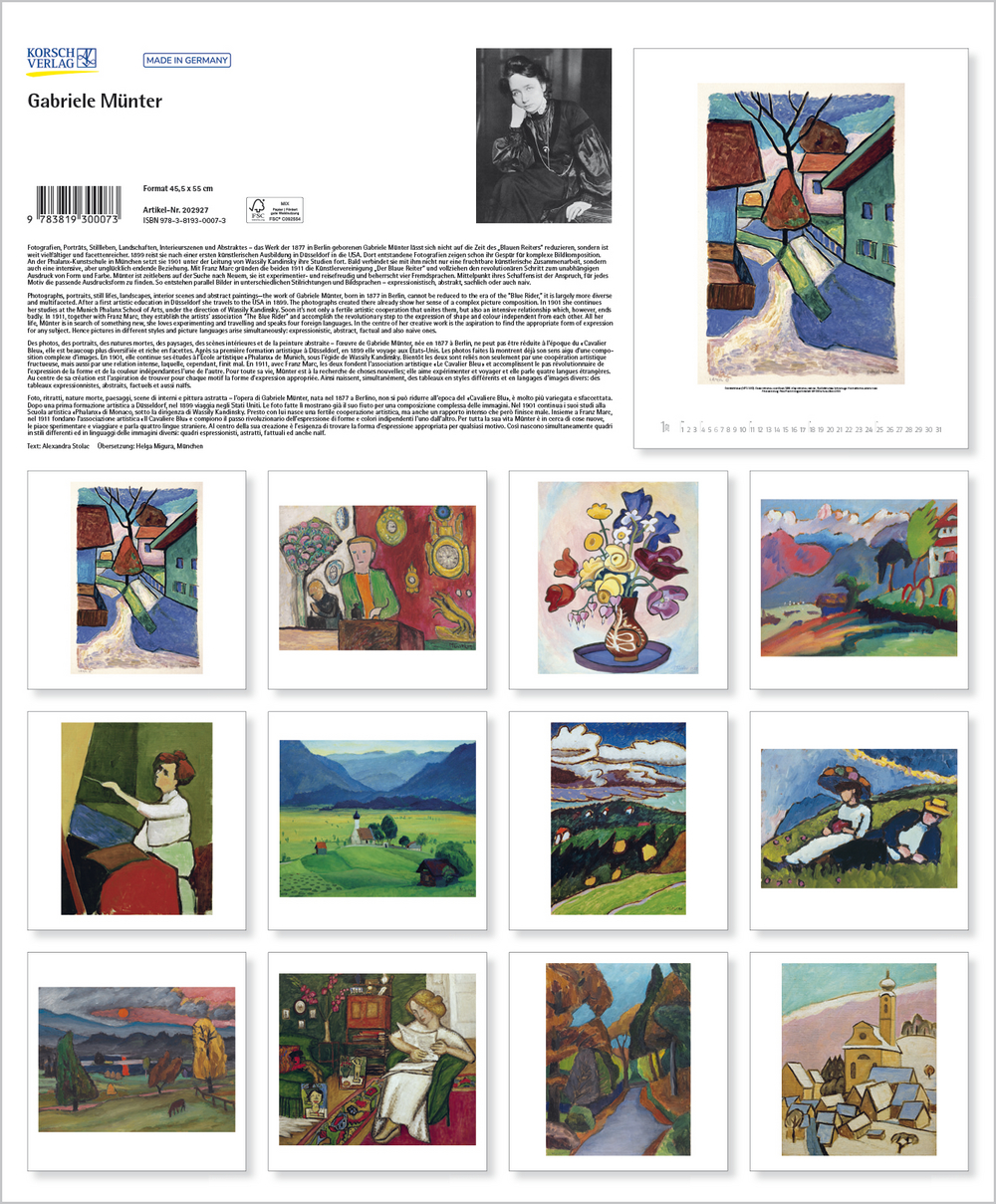 Der Name Gabriele Münter (1877-1962) ist zwar unzertrennlich mit der expressionistischen Künstlergruppe 'Der Blaue Reiter' verbunden, ihr Gesamtwerk ist aber weit vielfältiger und facettenreicher. Porträts, Stillleben, Landschaften, Interieurszenen und Abstraktes von strahlender Leuchtkraft - die Künstlerin ist experimentierfreudig, reiselustig und zeitlebens auf der Suche nach neuen Ausdrucksformen. Dieser Kalender zeigt eine hochwertige Auswahl aus Münters Werken.