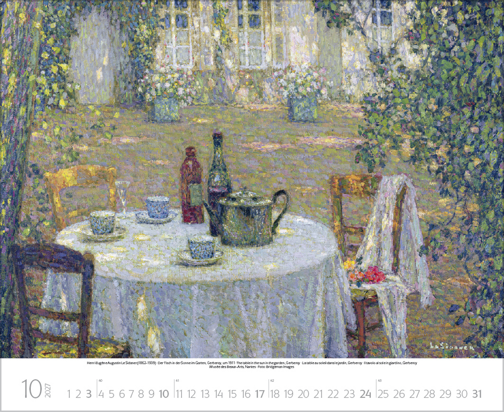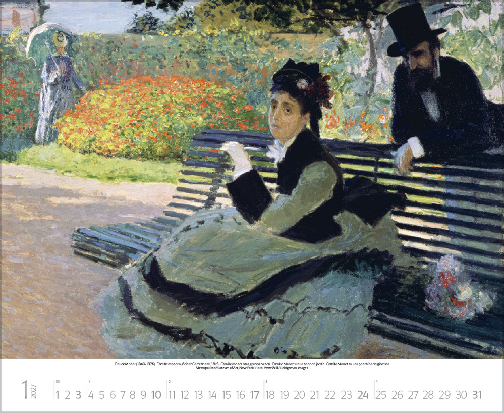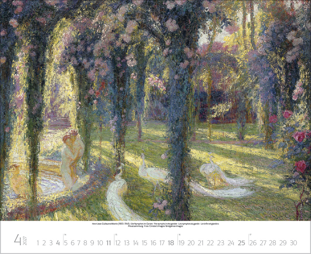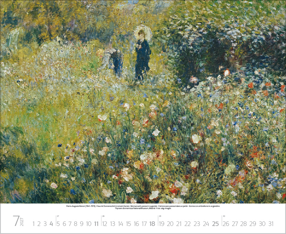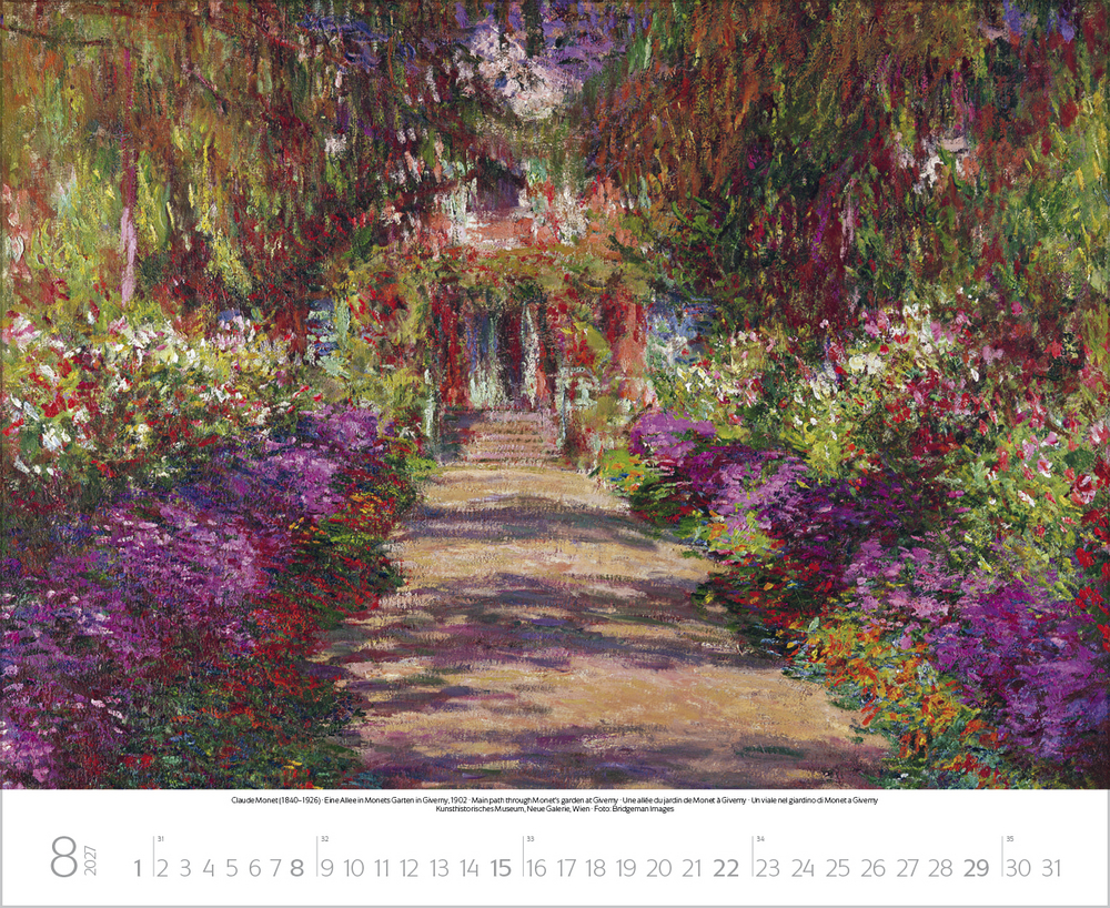 Dieser Kalender lädt ein zum malerischen Spaziergang durch idyllische Gärten der Kunst. Stimmungsvolle Meisterwerke berühmter Künstler, darunter impressionistische Werke von Claude Monet, Auguste Renoir, Camille Pissarro u.a. geben die feinen Nuancen der Gärten auf einzigartige Weise wieder. Von blühenden Wiesen, duftenden Blumenbeeten und romantischen Parkanlagen bis hin zu einladenden Sitzplätzen im Grünen – überall ist die besondere Magie der Natur zu spüren. Perfekt für Kunstliebhaber, Gartenfreunde und alle, die Natur lieben.