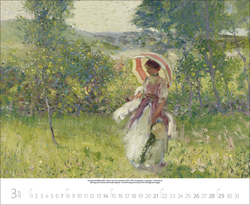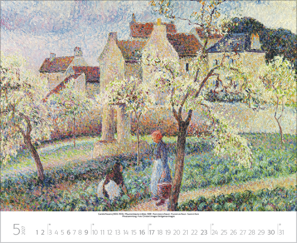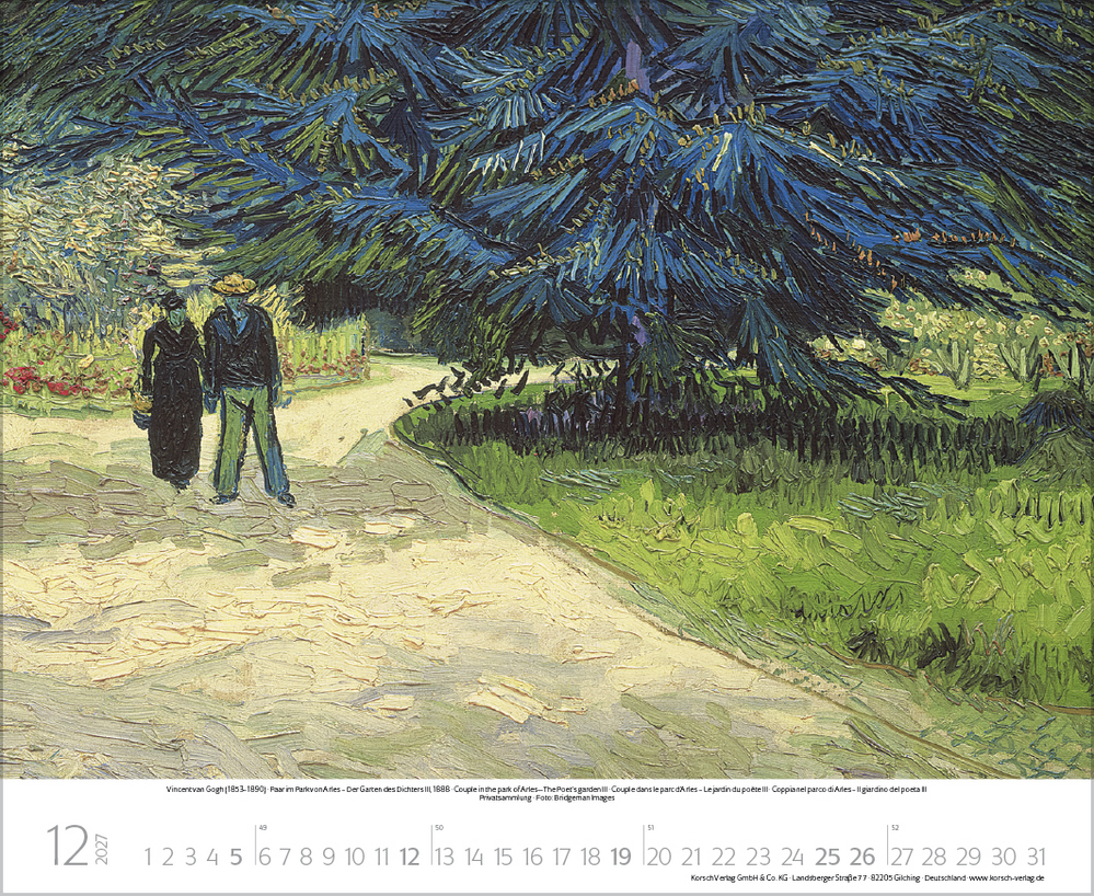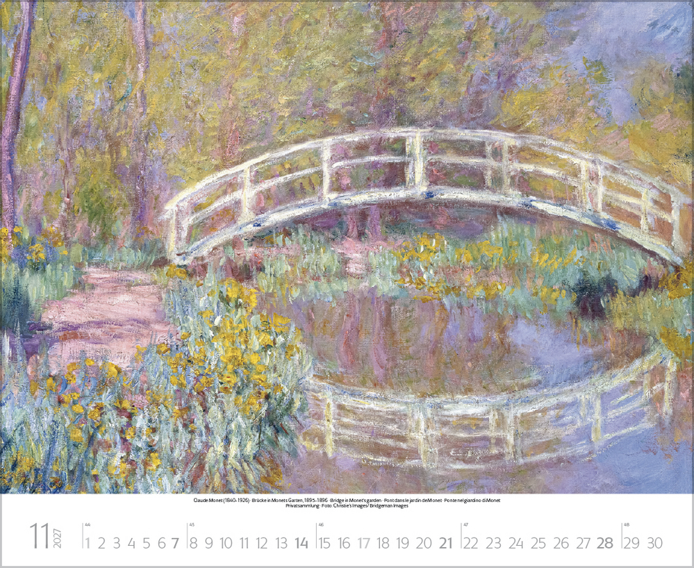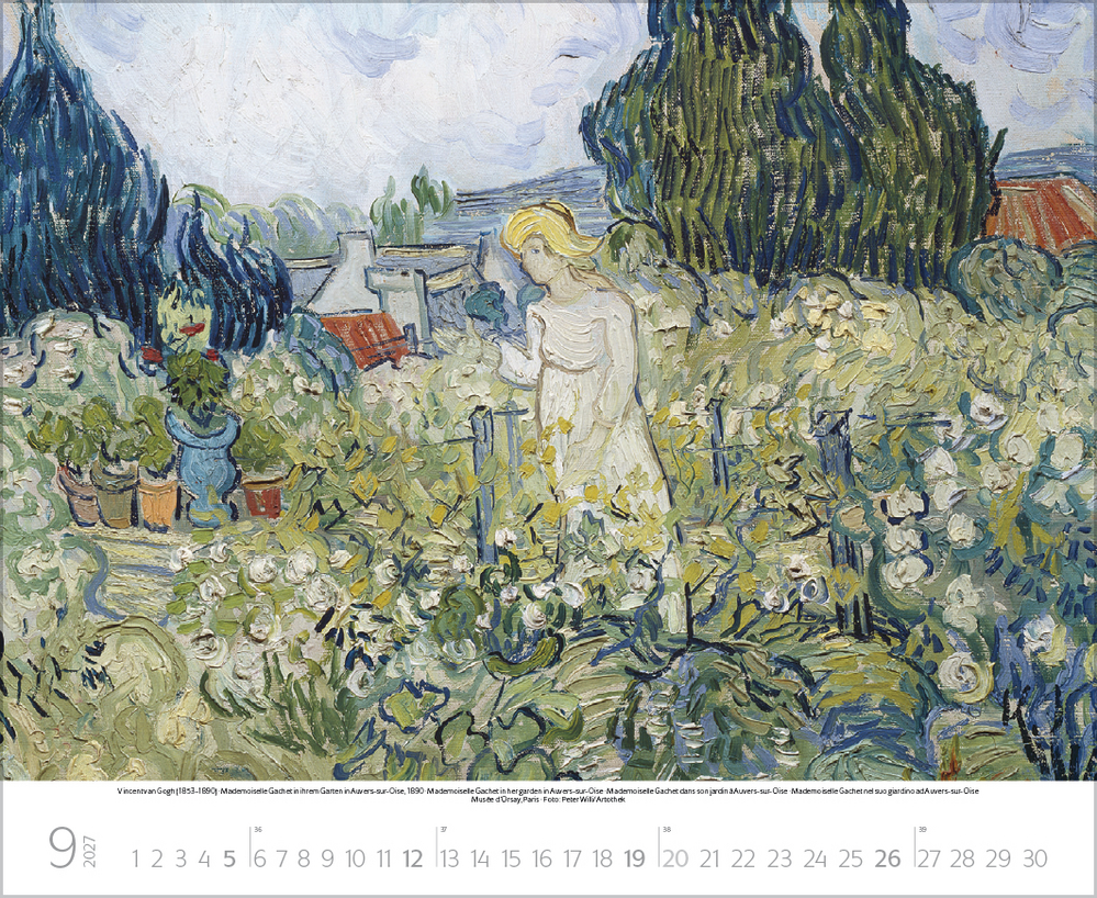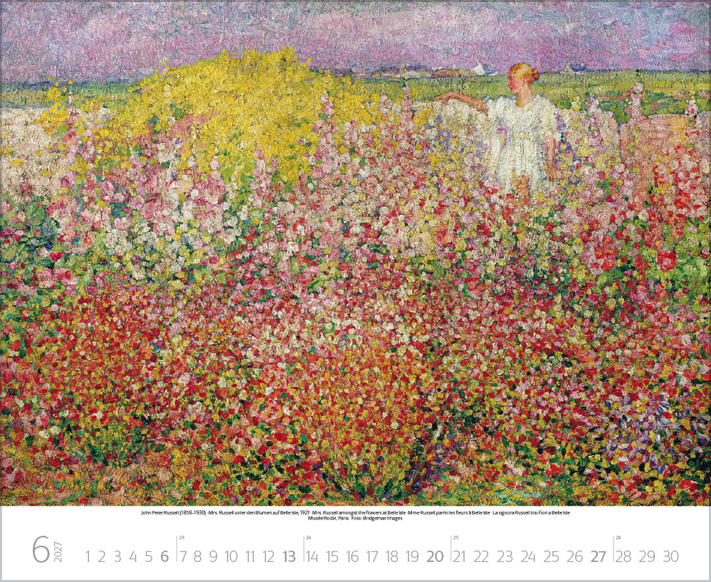Dieser Kalender lädt ein zum malerischen Spaziergang durch idyllische Gärten der Kunst. Stimmungsvolle Meisterwerke berühmter Künstler, darunter impressionistische Werke von Claude Monet, Auguste Renoir, Camille Pissarro u.a. geben die feinen Nuancen der Gärten auf einzigartige Weise wieder. Von blühenden Wiesen, duftenden Blumenbeeten und romantischen Parkanlagen bis hin zu einladenden Sitzplätzen im Grünen – überall ist die besondere Magie der Natur zu spüren. Perfekt für Kunstliebhaber, Gartenfreunde und alle, die Natur lieben.