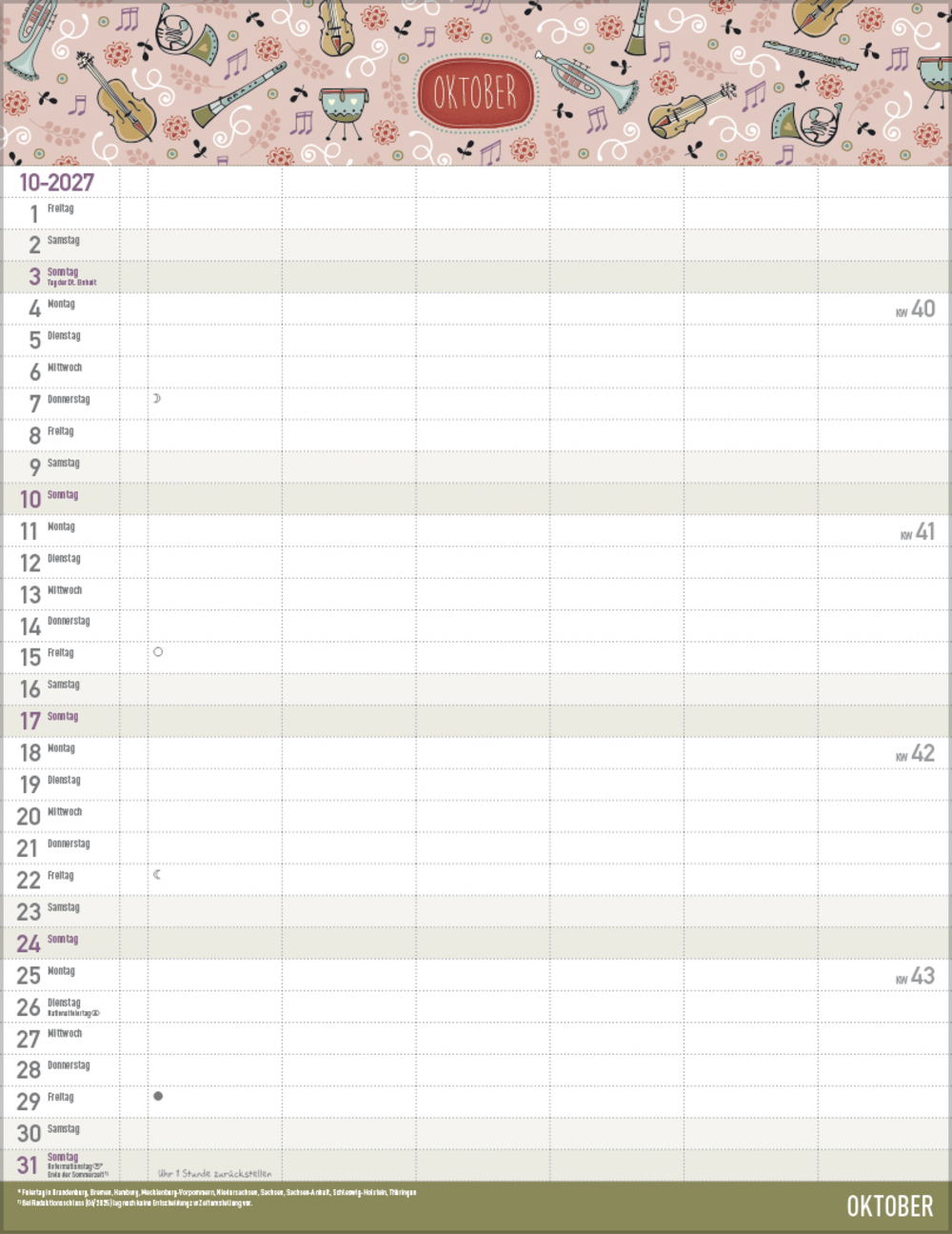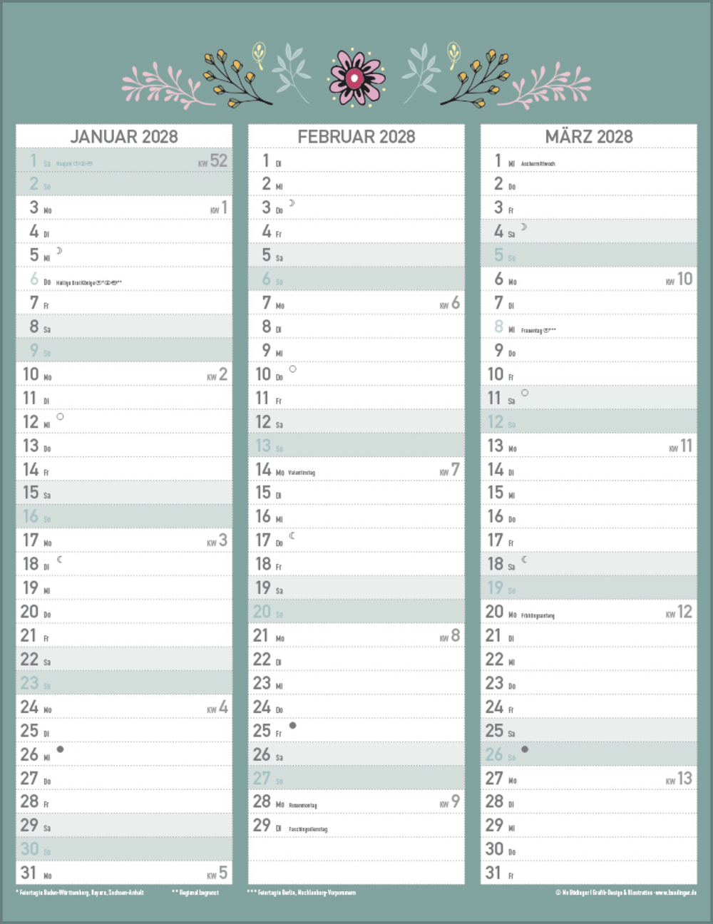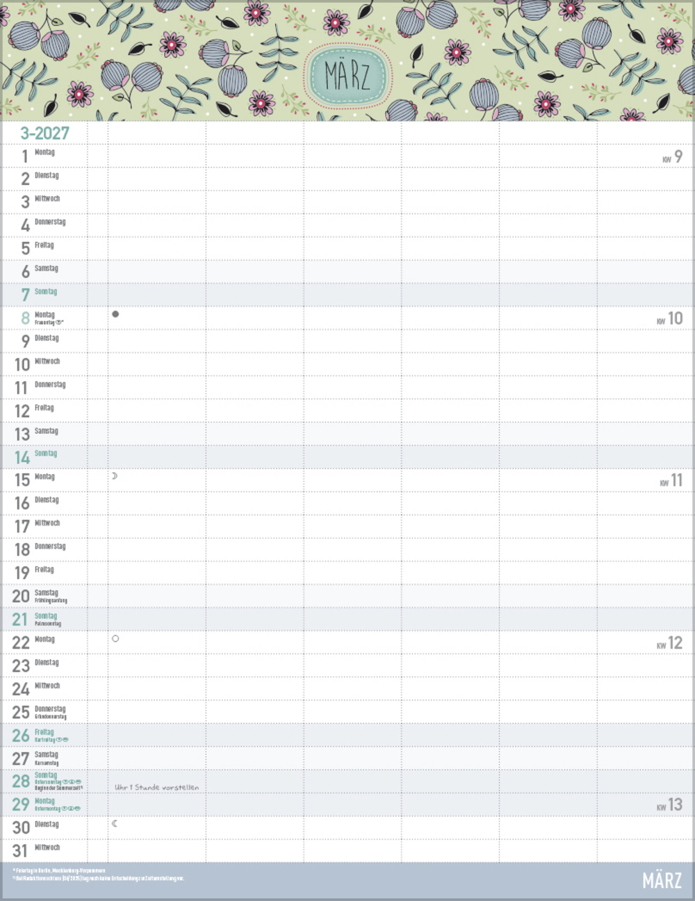 - Farblich hervorgehobene Sonn- und Feiertage sowie Anzeige der Zeitumstellung
