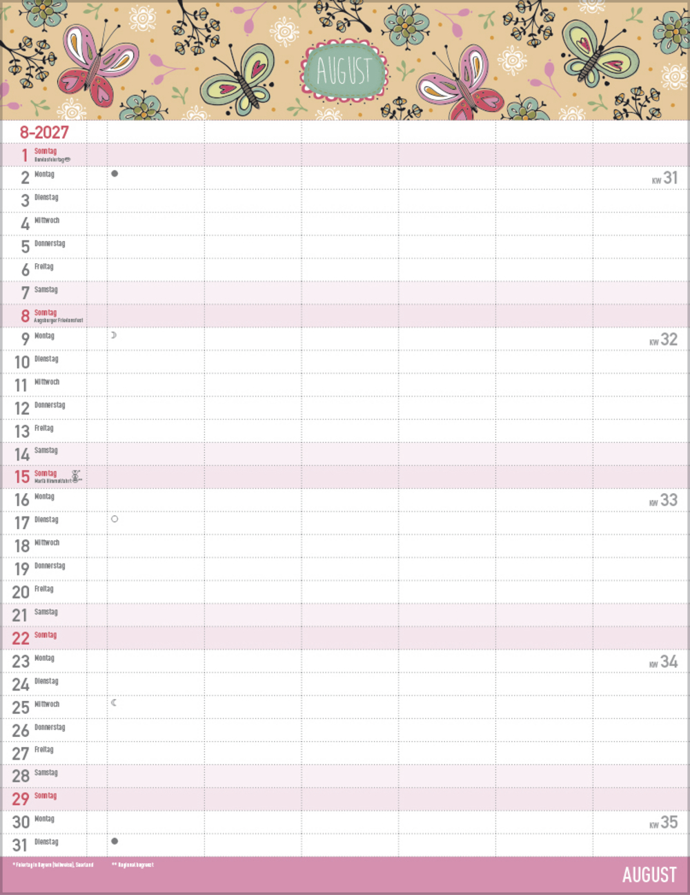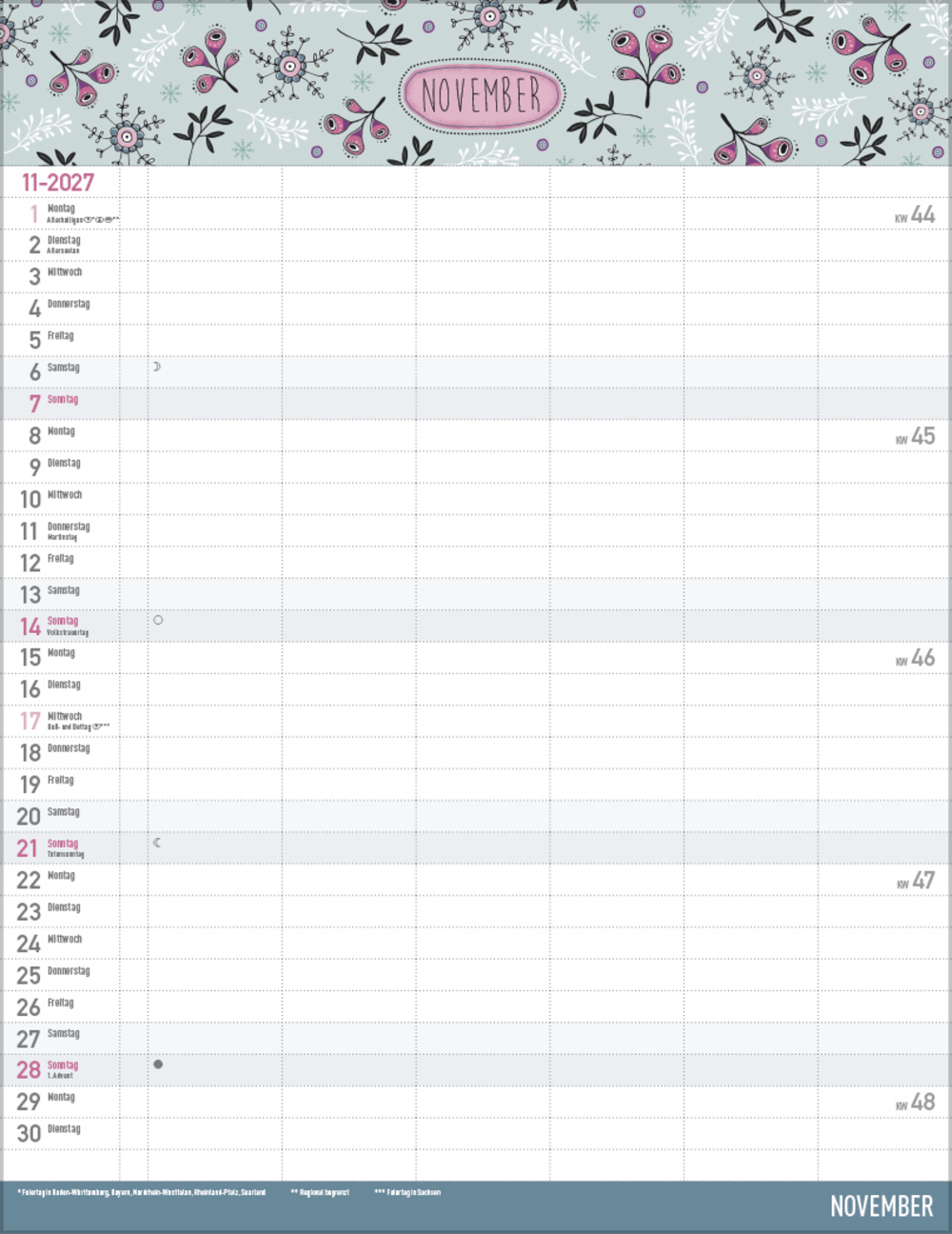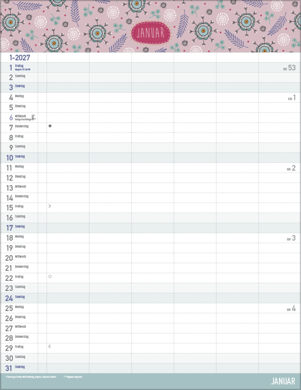 - Farblich hervorgehobene Sonn- und Feiertage sowie Anzeige der Zeitumstellung