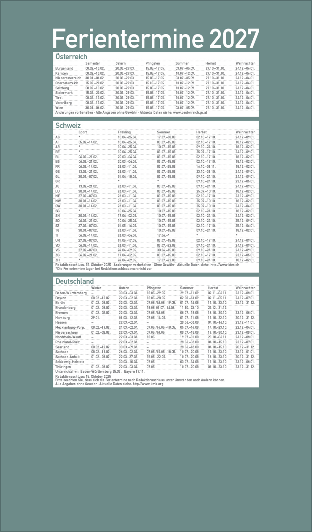 - Deutsches Kalendarium mit regionalen Feiertagen für Deutschland, Österreich und Schweiz