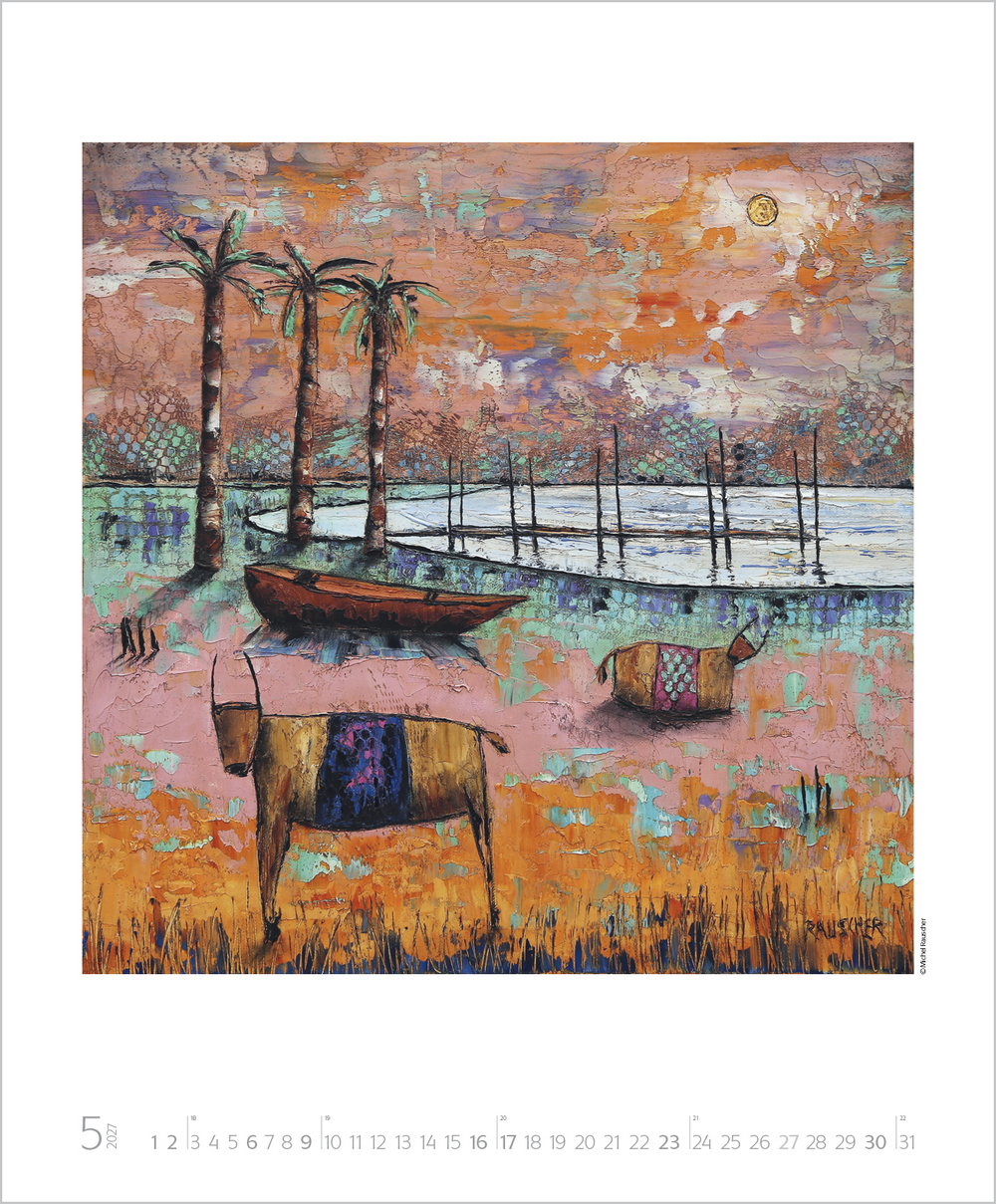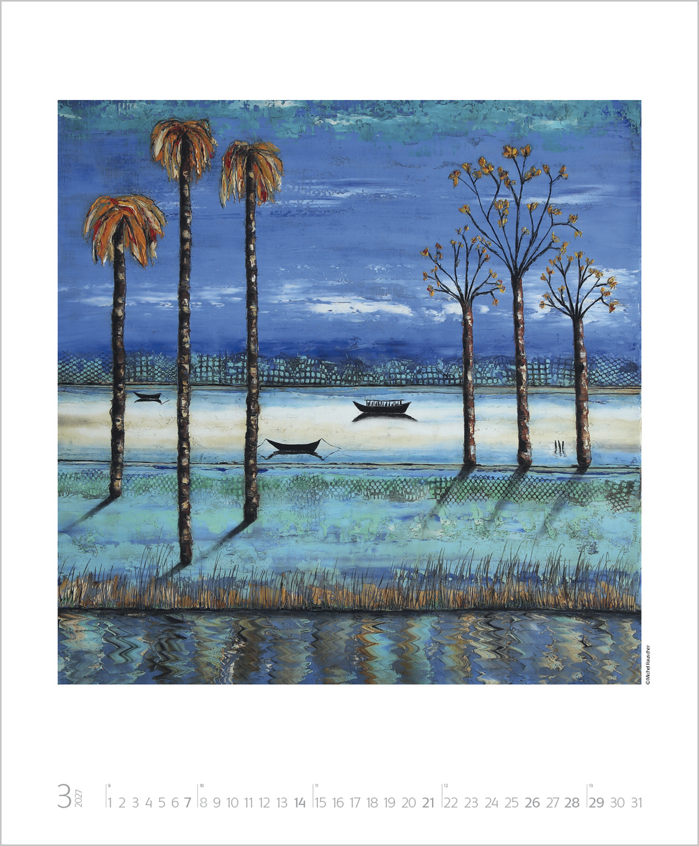 Ein Blick nur in diese Weiten und schon wird die Sehnsucht wach, einzutauchen in diese Landschaften und Farben und den fernen Horizonten entgegenzuträumen … Das Fernweh hat sich auch in die Träume und den Alltag des 1957 geborenen Malers Michel Rauscher eingeschlichen. Und so greift er zum Pinsel und arrangiert Farbtupfer wie ein Dichter seine Worte, lässt sich verführen vom Reichtum des Alltäglichen, von hellem Dunst und verschwommenen Linien. Und schafft Landschaften wie Seelenrefugien, gekleidet in Sonne, Blau, Gold und Silber.
