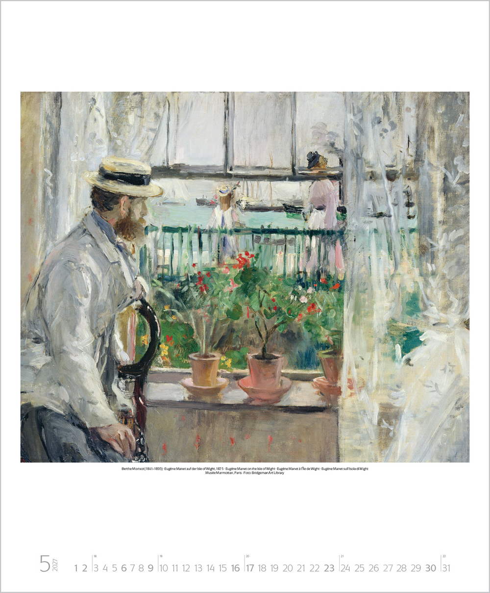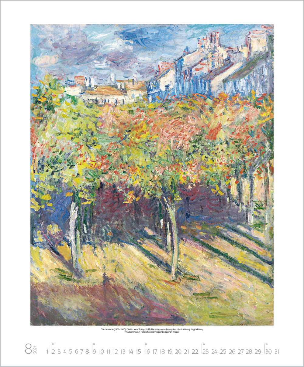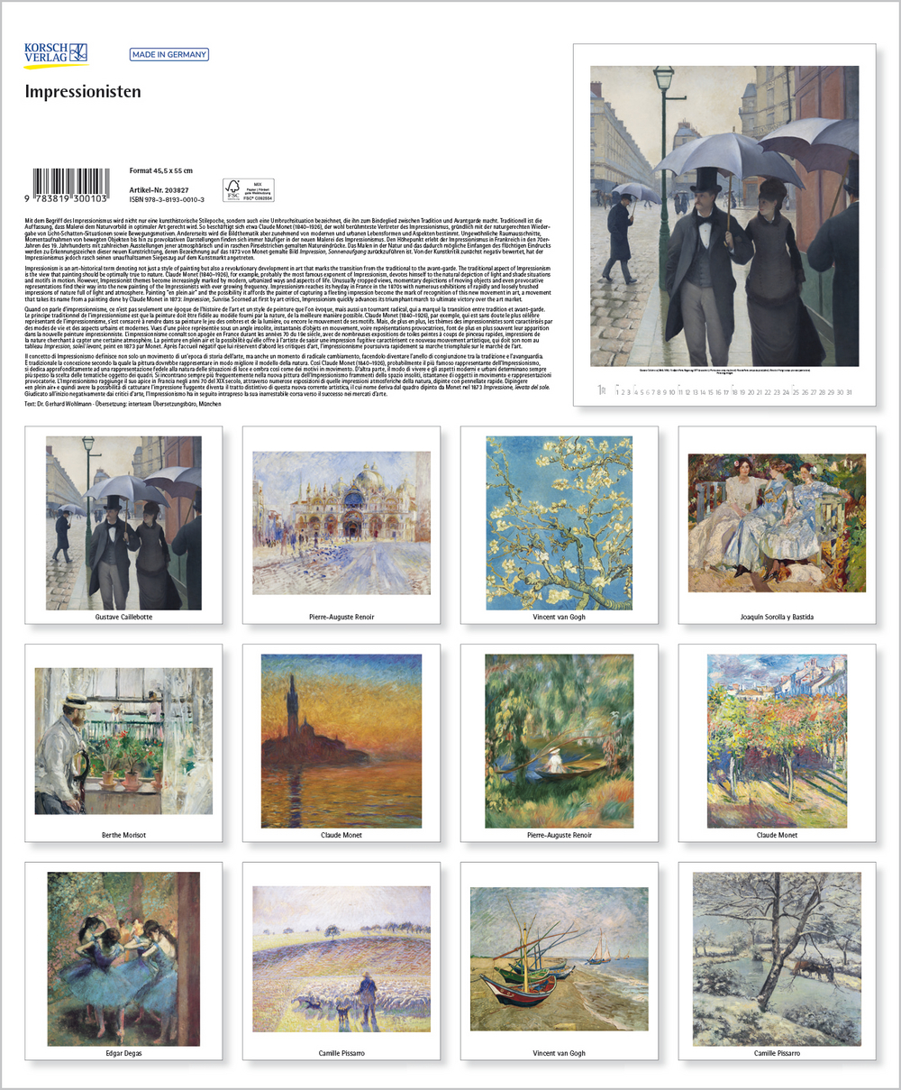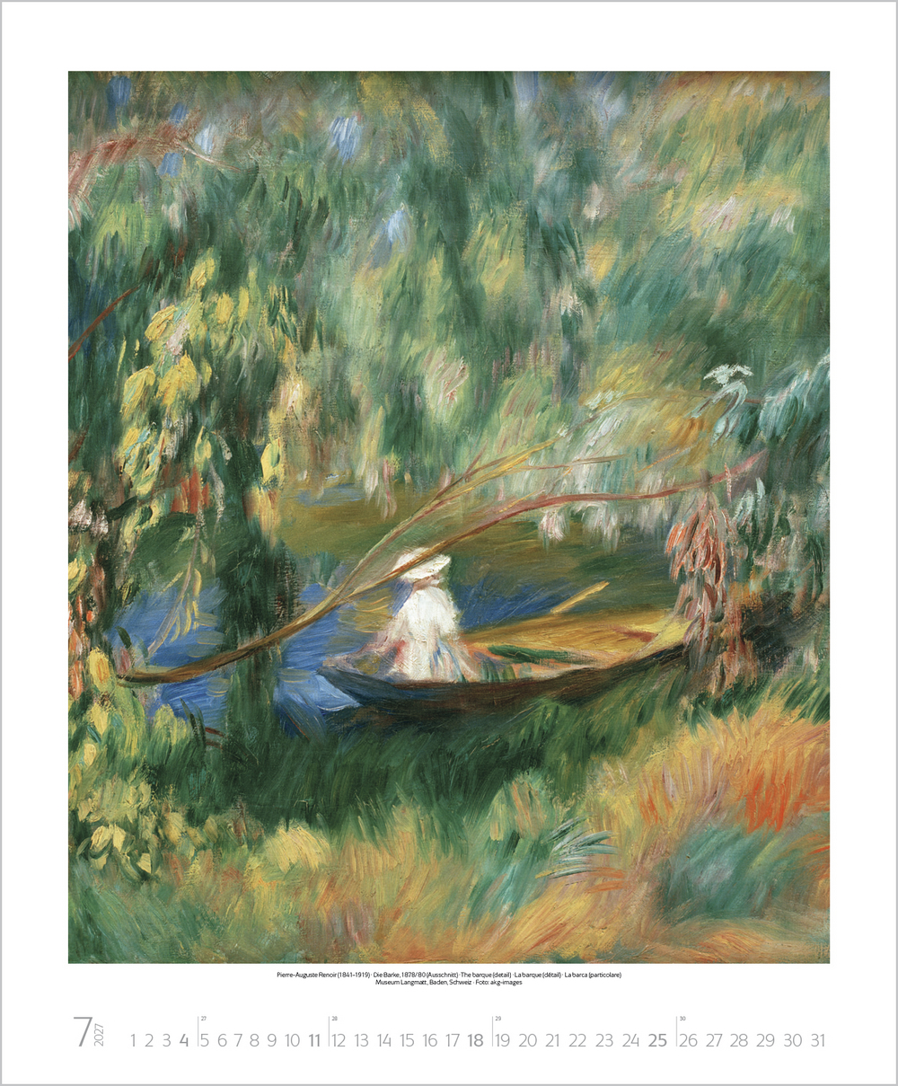 Mit der neuen Kunstbewegung des Impressionismus revolutionierten dessen Vertreter das vorherrschende Kunstverständnis von Grund auf. Plötzlich stand die Natur in ihrer farbigen Auflösung, die Licht, Sonne und Luft hervorrufen, im Mittelpunkt und man erklärte das Malen in der freien Natur zum Grundprinzip. Der Kalender zeigt u. a. Meisterwerke von Monet, Renoir, Degas, Morisot und Pissarro.