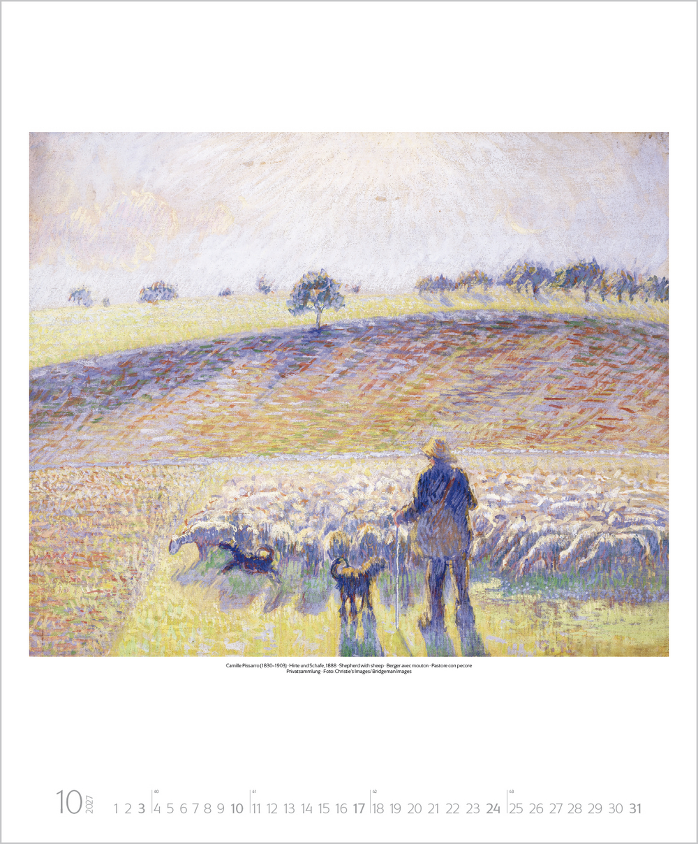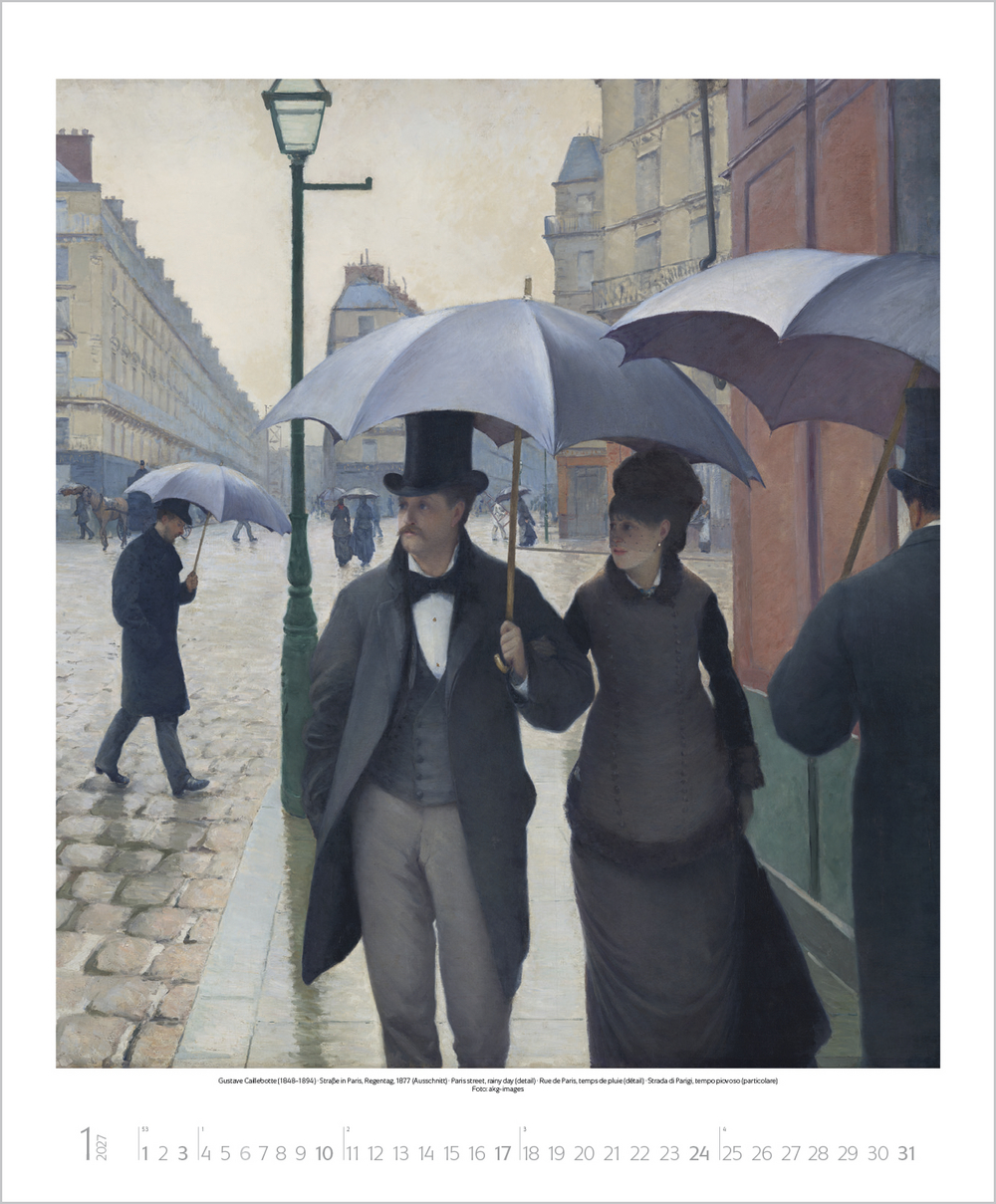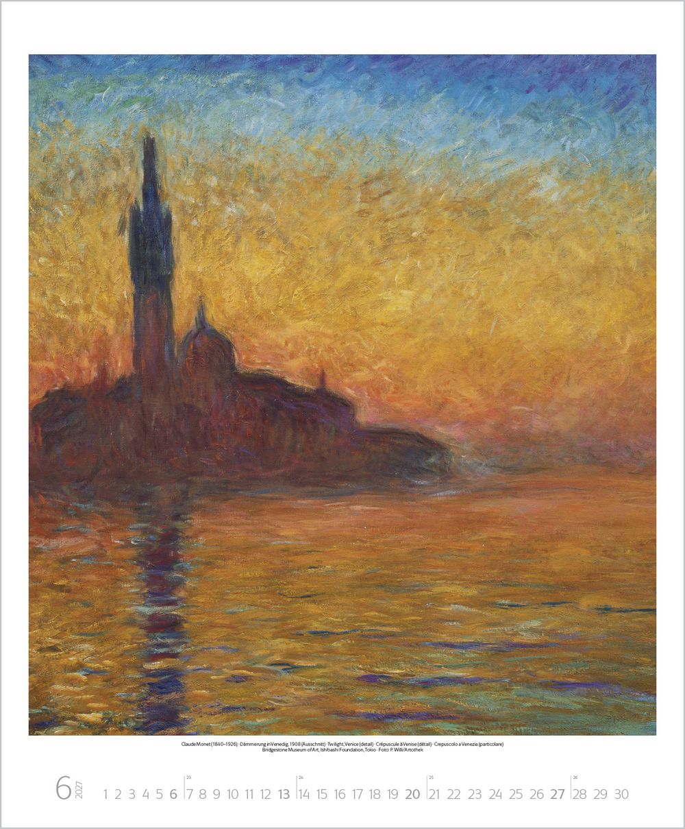 Mit der neuen Kunstbewegung des Impressionismus revolutionierten dessen Vertreter das vorherrschende Kunstverständnis von Grund auf. Plötzlich stand die Natur in ihrer farbigen Auflösung, die Licht, Sonne und Luft hervorrufen, im Mittelpunkt und man erklärte das Malen in der freien Natur zum Grundprinzip. Der Kalender zeigt u. a. Meisterwerke von Monet, Renoir, Degas, Morisot und Pissarro.