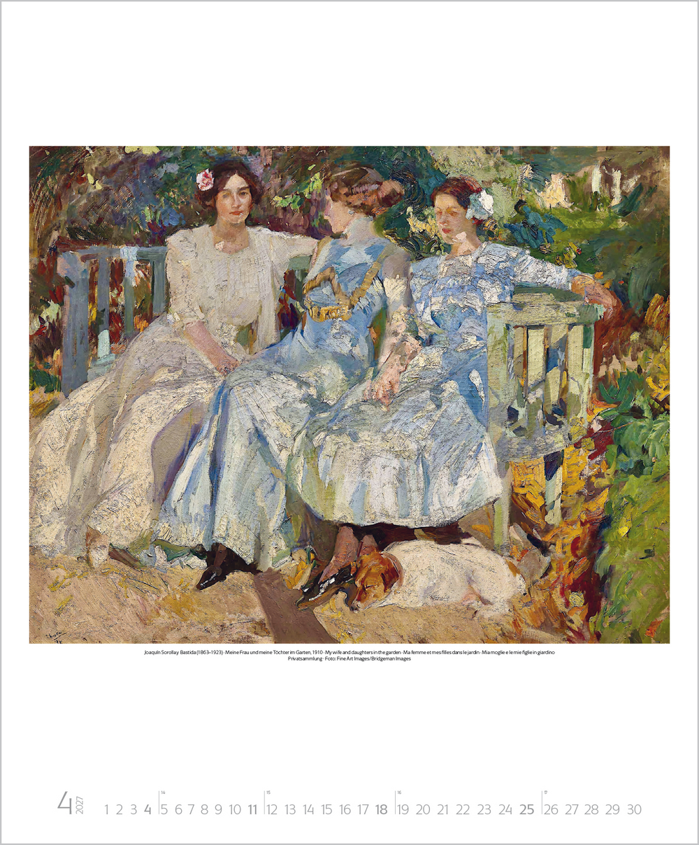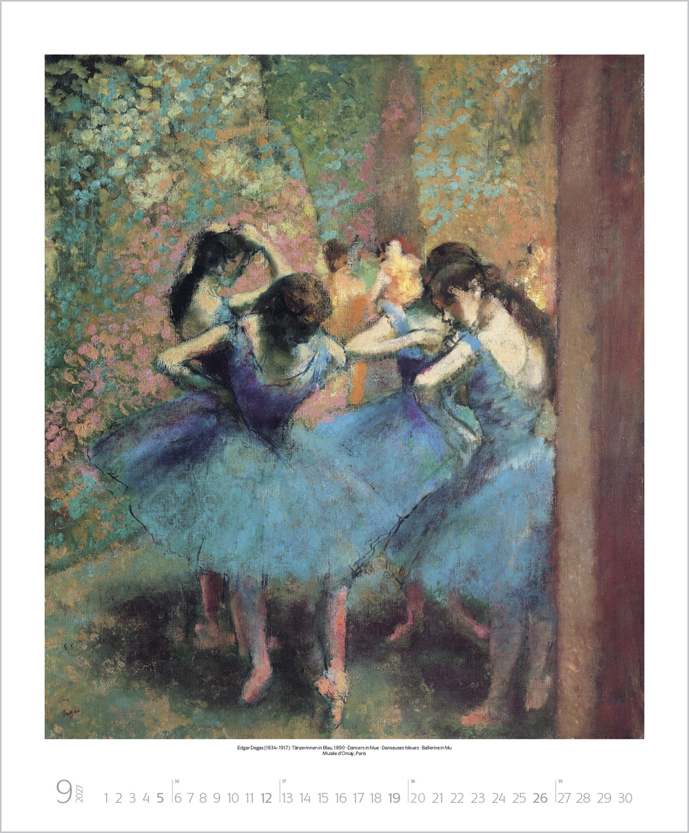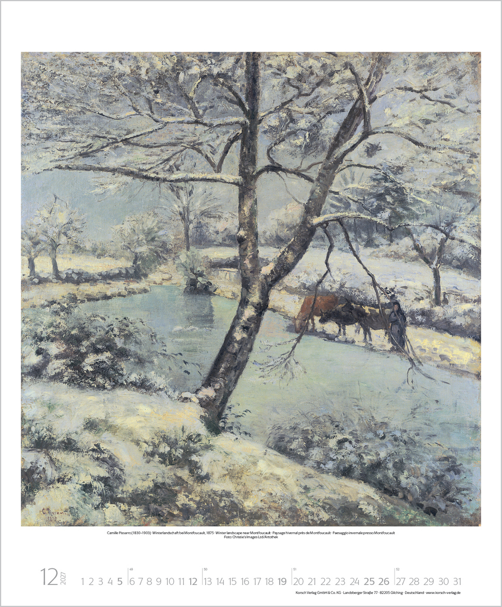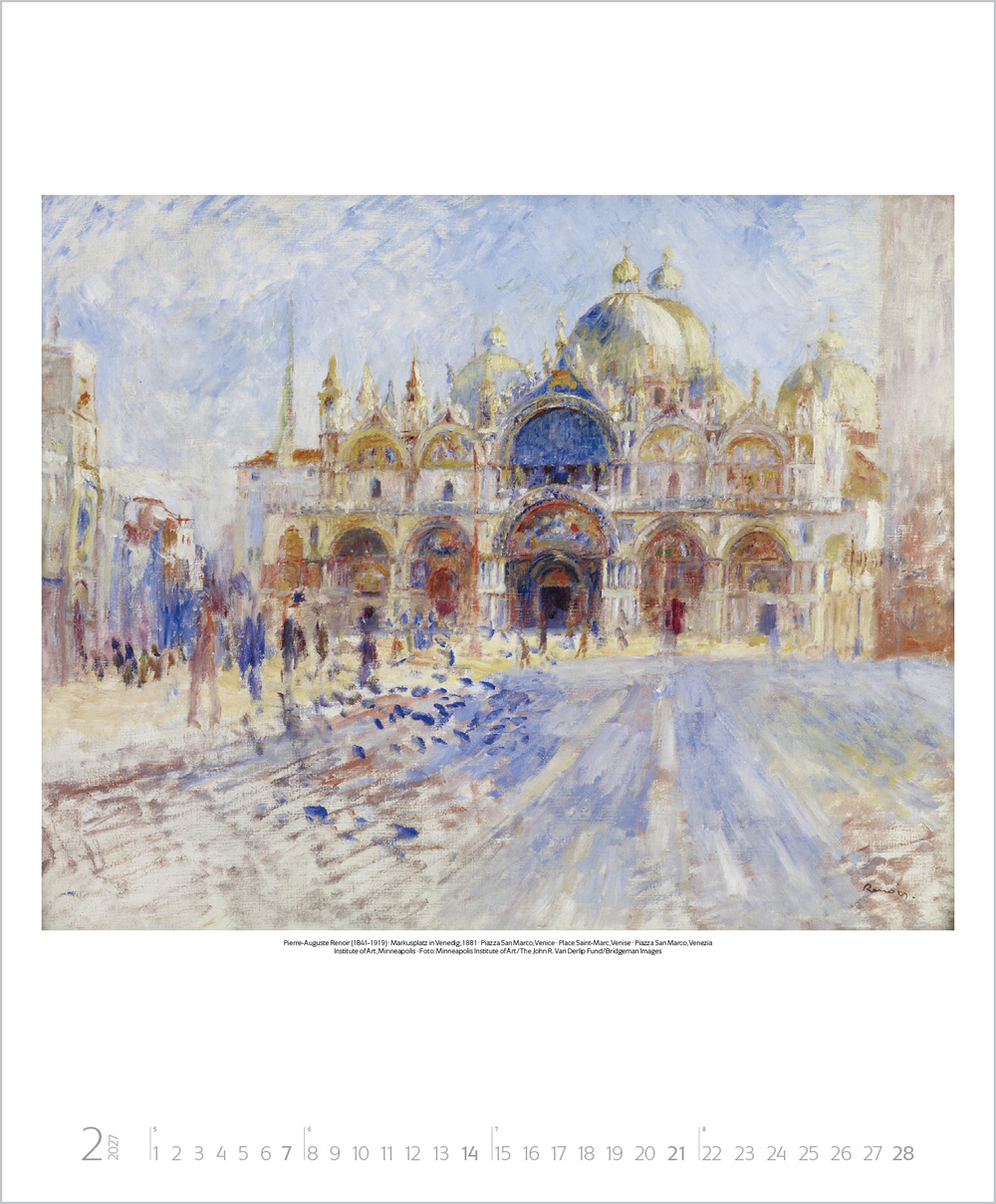 Mit der neuen Kunstbewegung des Impressionismus revolutionierten dessen Vertreter das vorherrschende Kunstverständnis von Grund auf. Plötzlich stand die Natur in ihrer farbigen Auflösung, die Licht, Sonne und Luft hervorrufen, im Mittelpunkt und man erklärte das Malen in der freien Natur zum Grundprinzip. Der Kalender zeigt u. a. Meisterwerke von Monet, Renoir, Degas, Morisot und Pissarro.