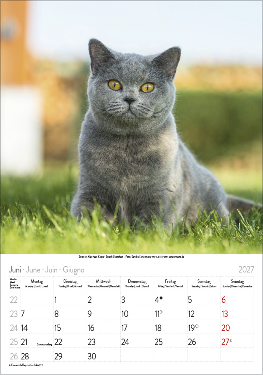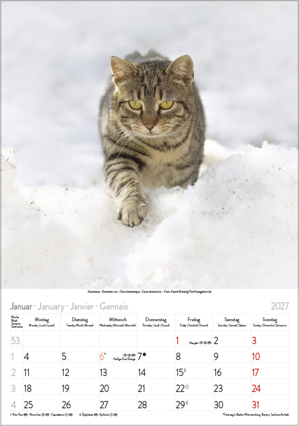 Katzen, Stubentiger mit Charakter, sanften Pfoten und eigenem Kopf, sind die beliebtesten Haustiere überhaupt. Sie faszinieren uns mit süßen Posen, Anschmiegsamkeit und leichtfüßiger Eleganz. All dies spiegelt dieser wunderschöne Kalender perfekt wider.