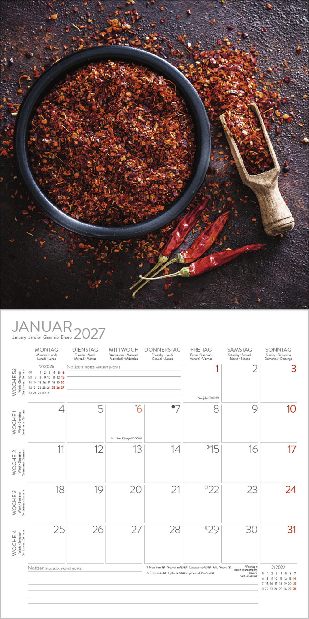 - Jede Kalenderseite mit großem Bild und viel Platz im Kalendarium für Notizen und Termine