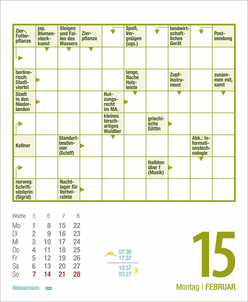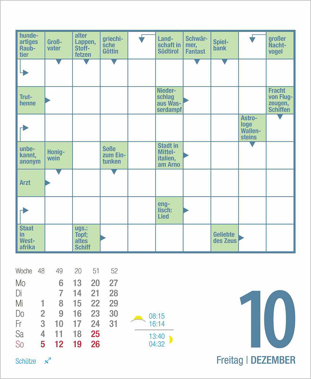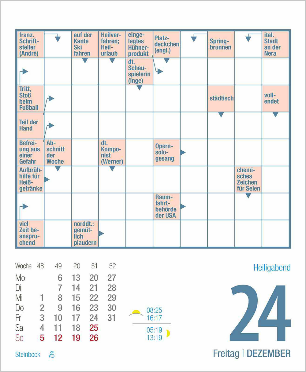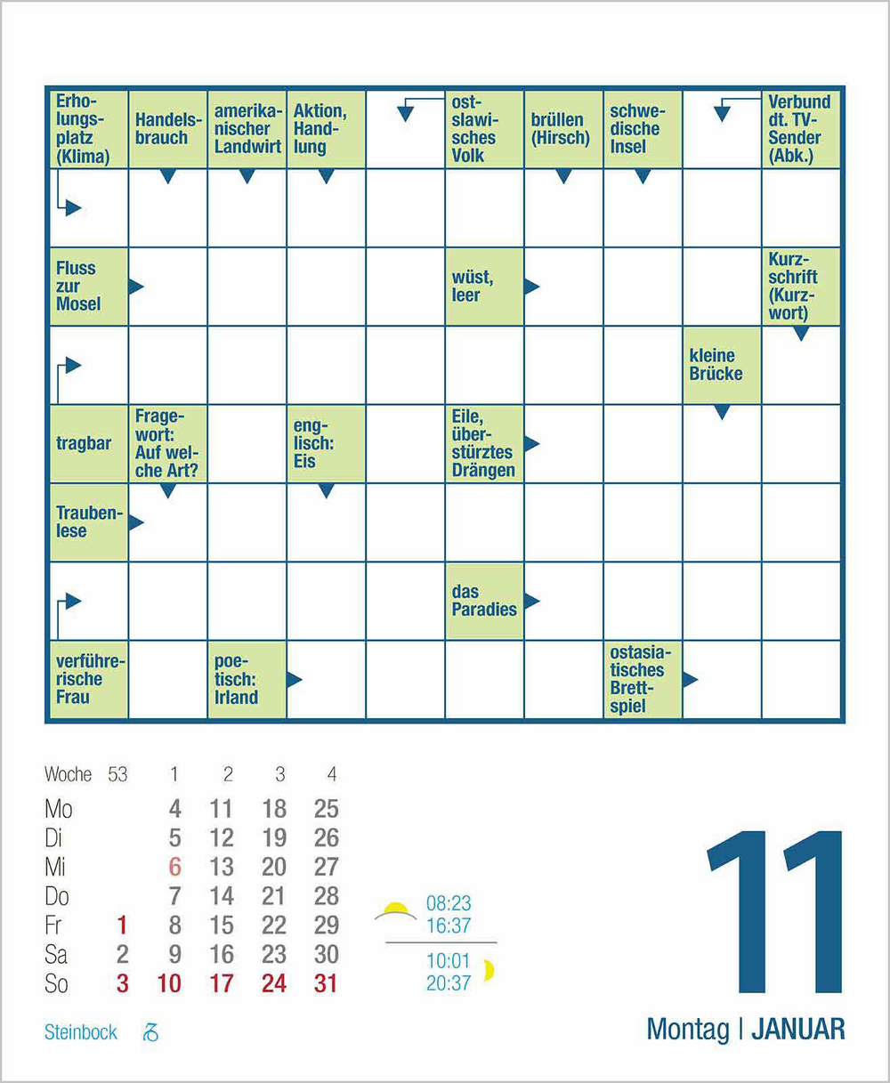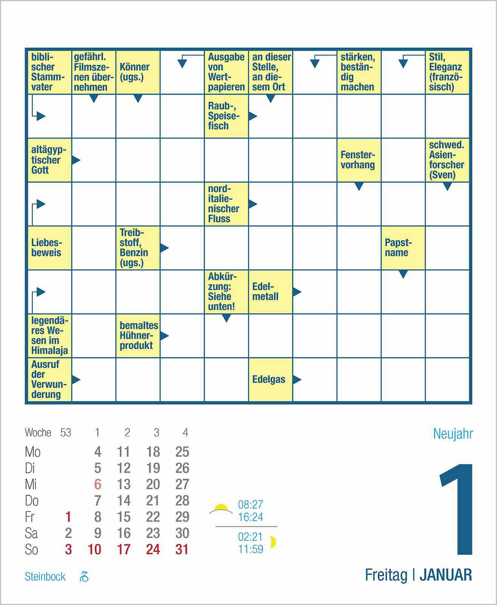 Mit diesem Kalender trainieren Sie täglich Ihre Gehirnzellen und werden mit spannenden Kreuzworträtseln bestens unterhalten. Und wenn Sie mal nicht weiterwissen: Auf der Rückseite finden Sie die Lösung.