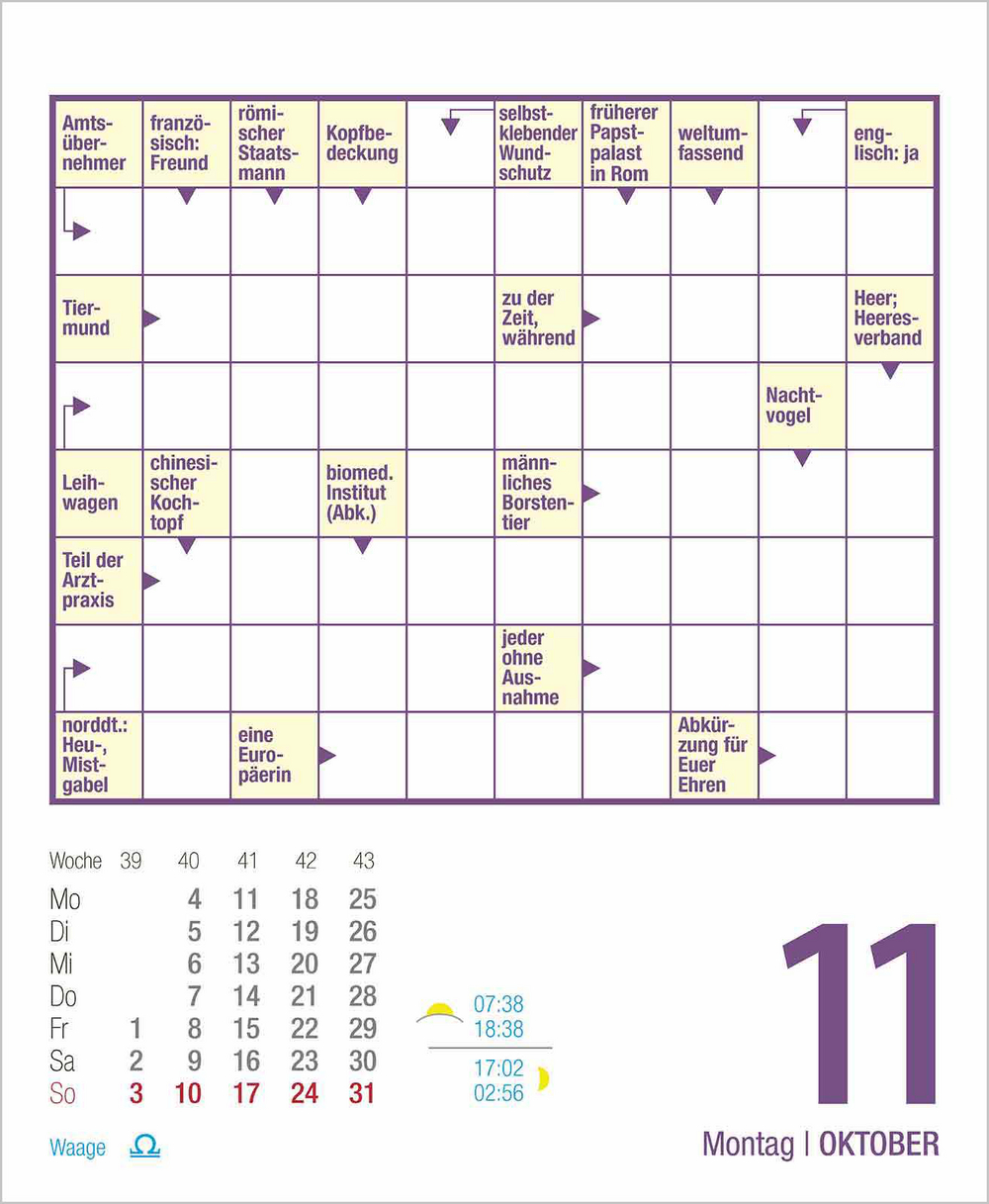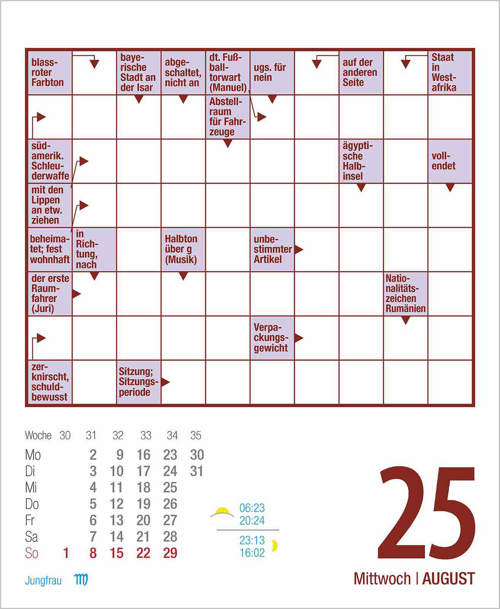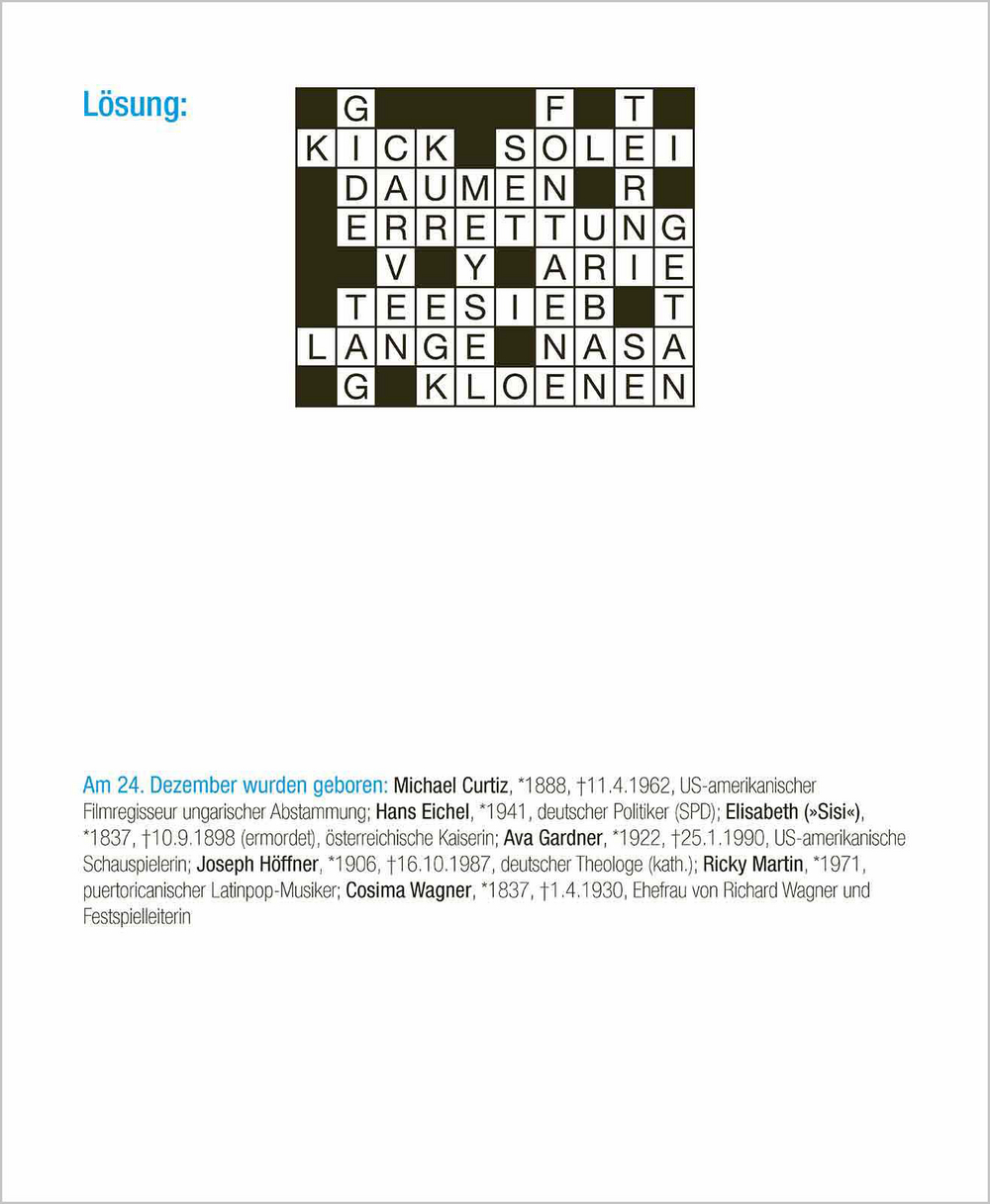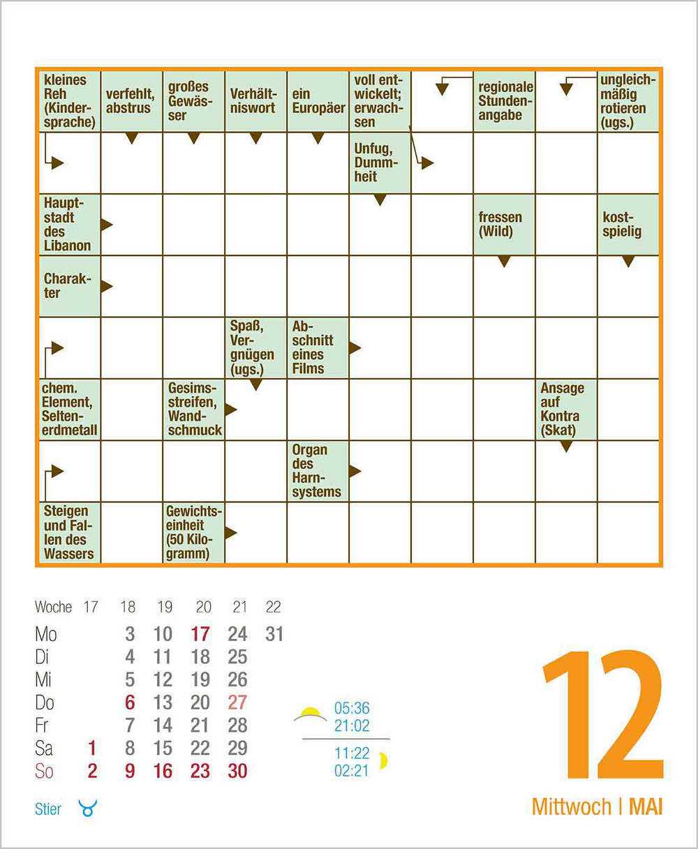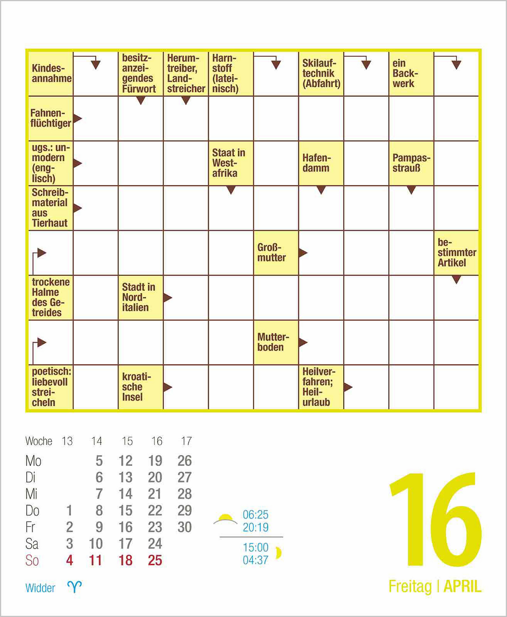 Mit diesem Kalender trainieren Sie täglich Ihre Gehirnzellen und werden mit spannenden Kreuzworträtseln bestens unterhalten. Und wenn Sie mal nicht weiterwissen: Auf der Rückseite finden Sie die Lösung.