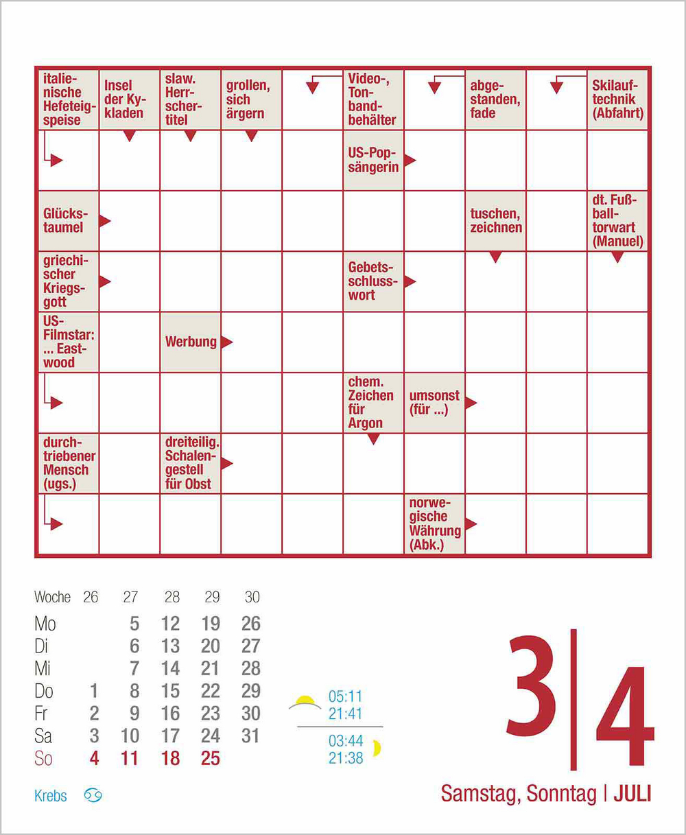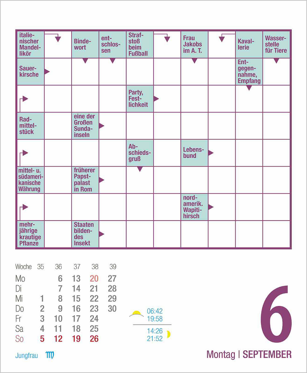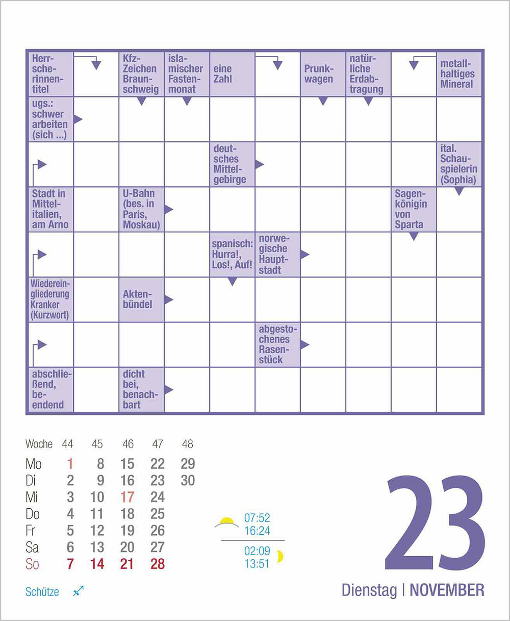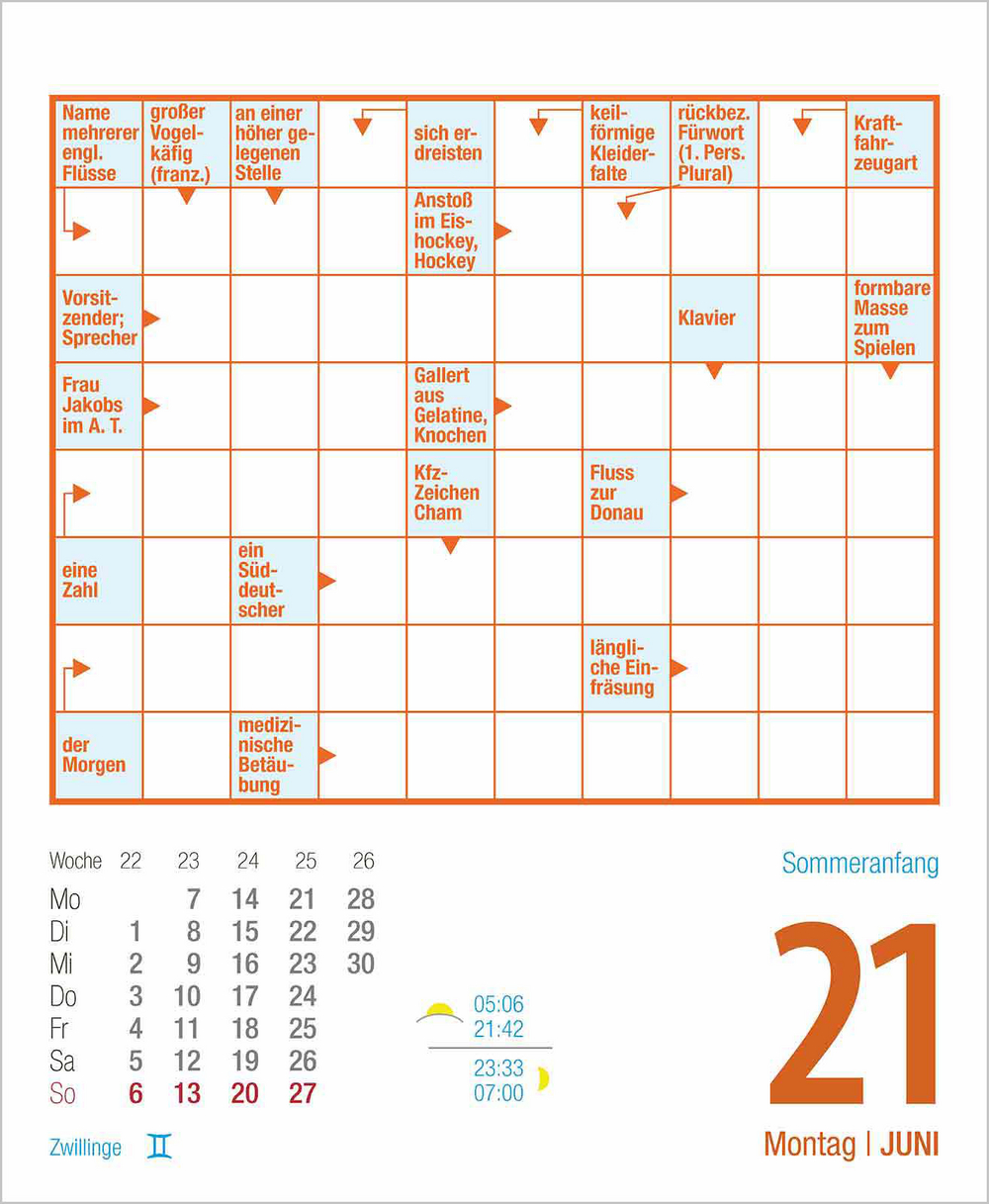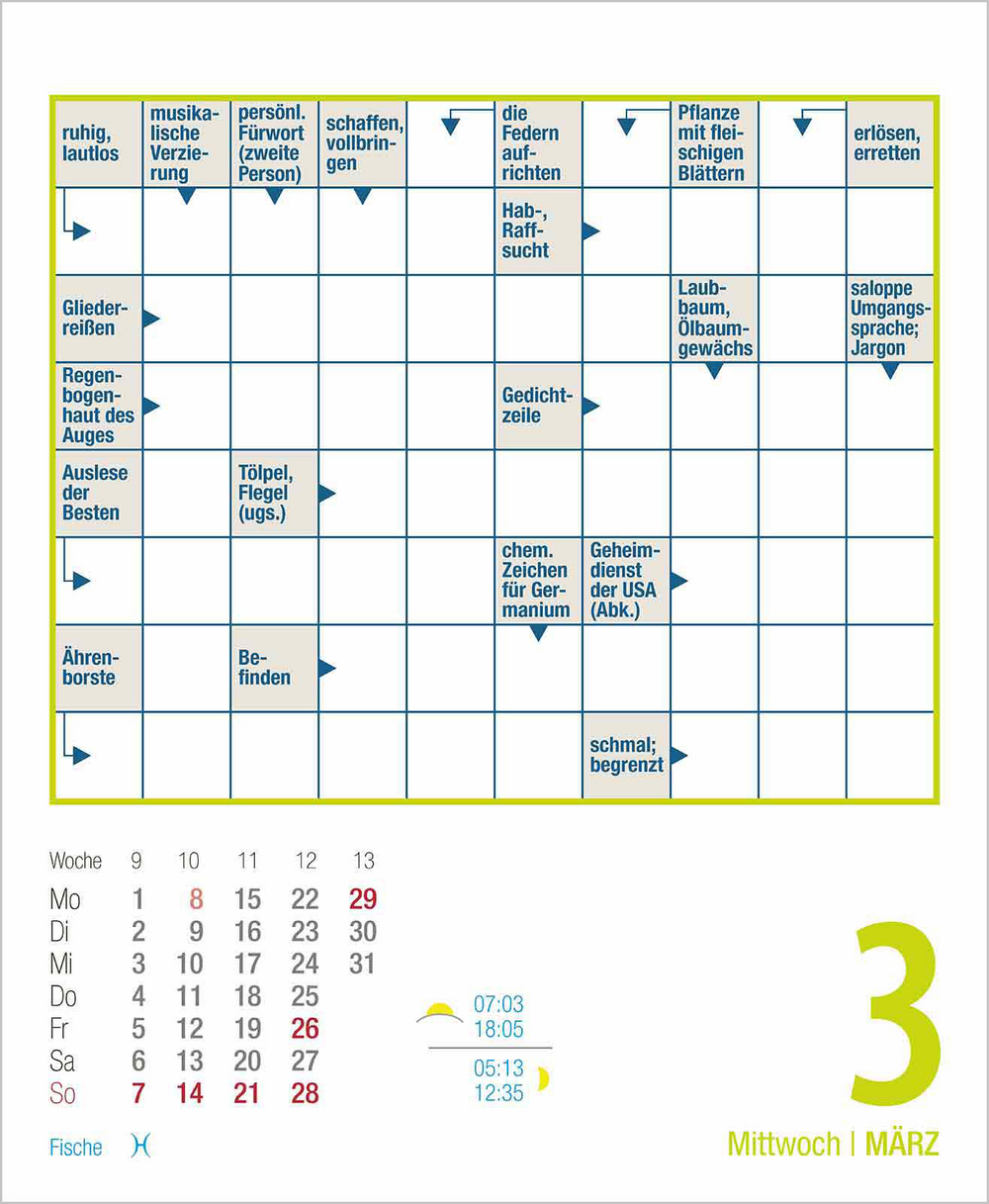 Mit diesem Kalender trainieren Sie täglich Ihre Gehirnzellen und werden mit spannenden Kreuzworträtseln bestens unterhalten. Und wenn Sie mal nicht weiterwissen: Auf der Rückseite finden Sie die Lösung.