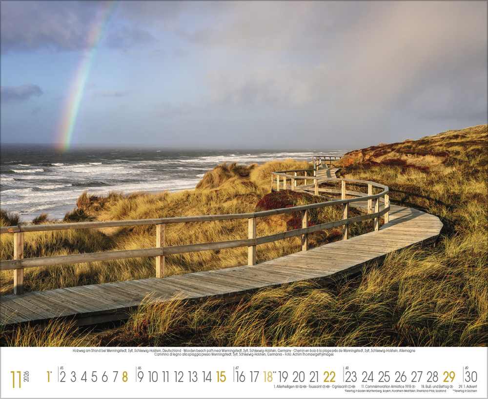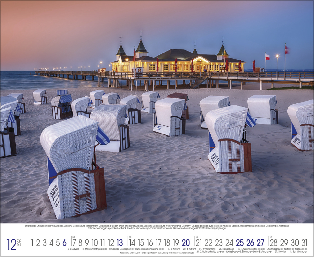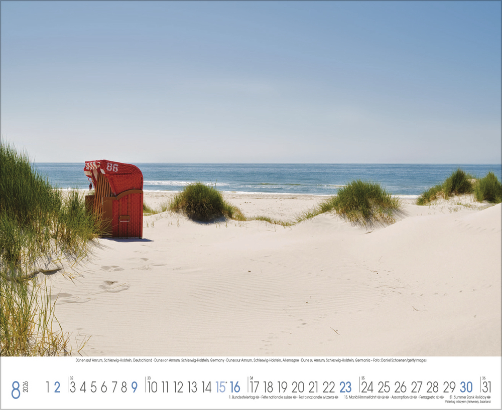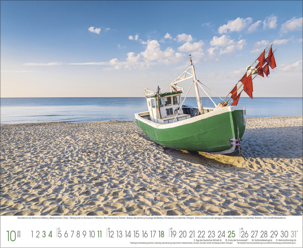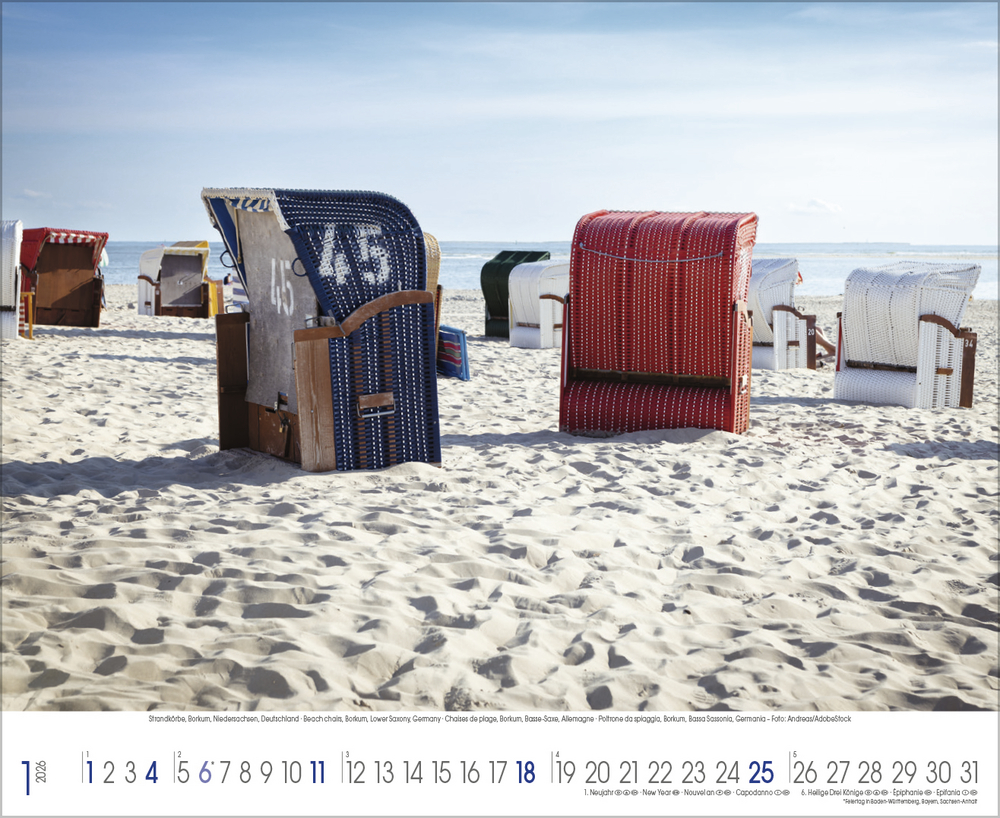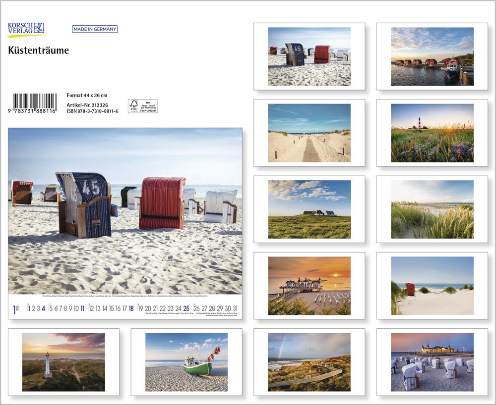 Der Kalender Küstenträume präsentiert eine Sammlung stimmungsvoller Fotografien, die die raue Schönheit der Nordsee und die sanften Wellen der Ostsee eindrucksvoll einfangen. Jede Aufnahme zeigt die Vielfalt und den Charakter dieser einzigartigen Küstenregionen von windgepeitschten Dünen und endlosen Sandstränden bis hin zu romantischen Sonnenuntergängen und dramatischen Wolkenformationen. Perfekt für alle, die das Meer lieben und sich ein Stück Urlaubsfeeling in den Alltag holen möchten.
