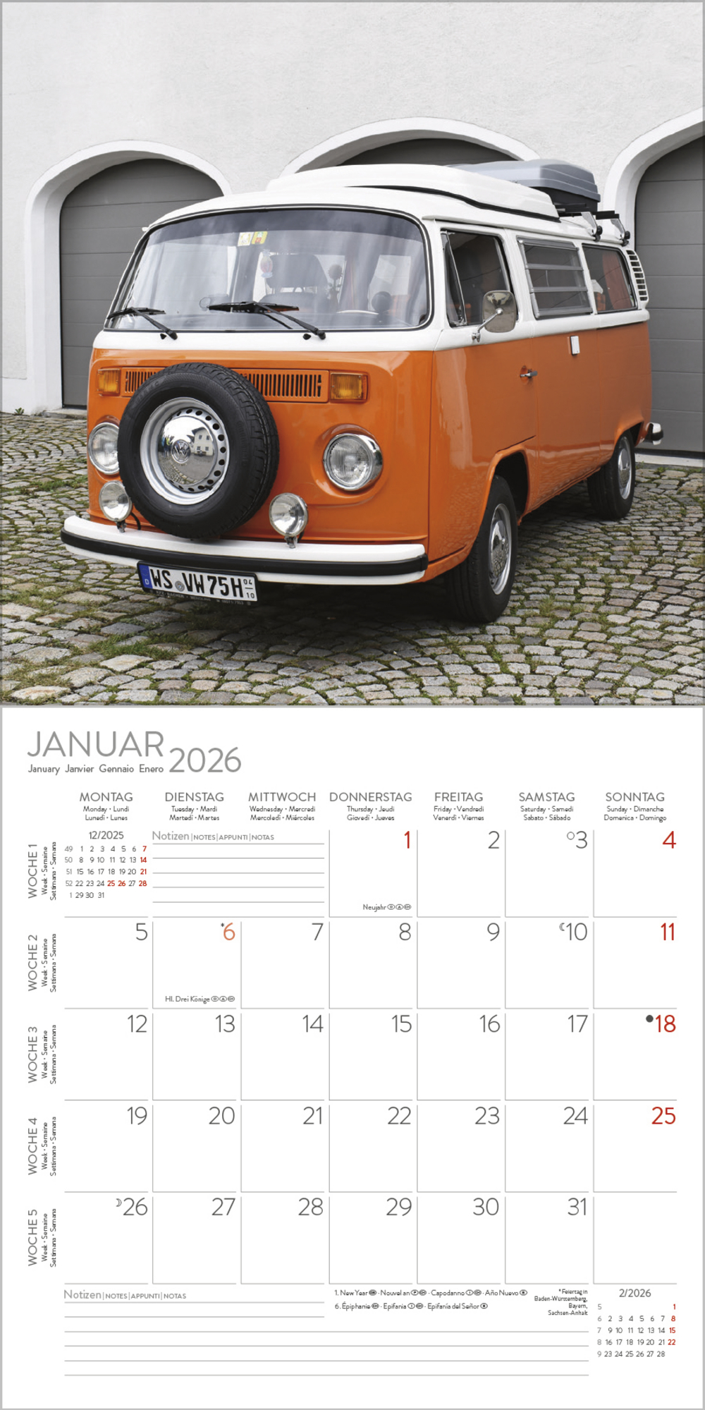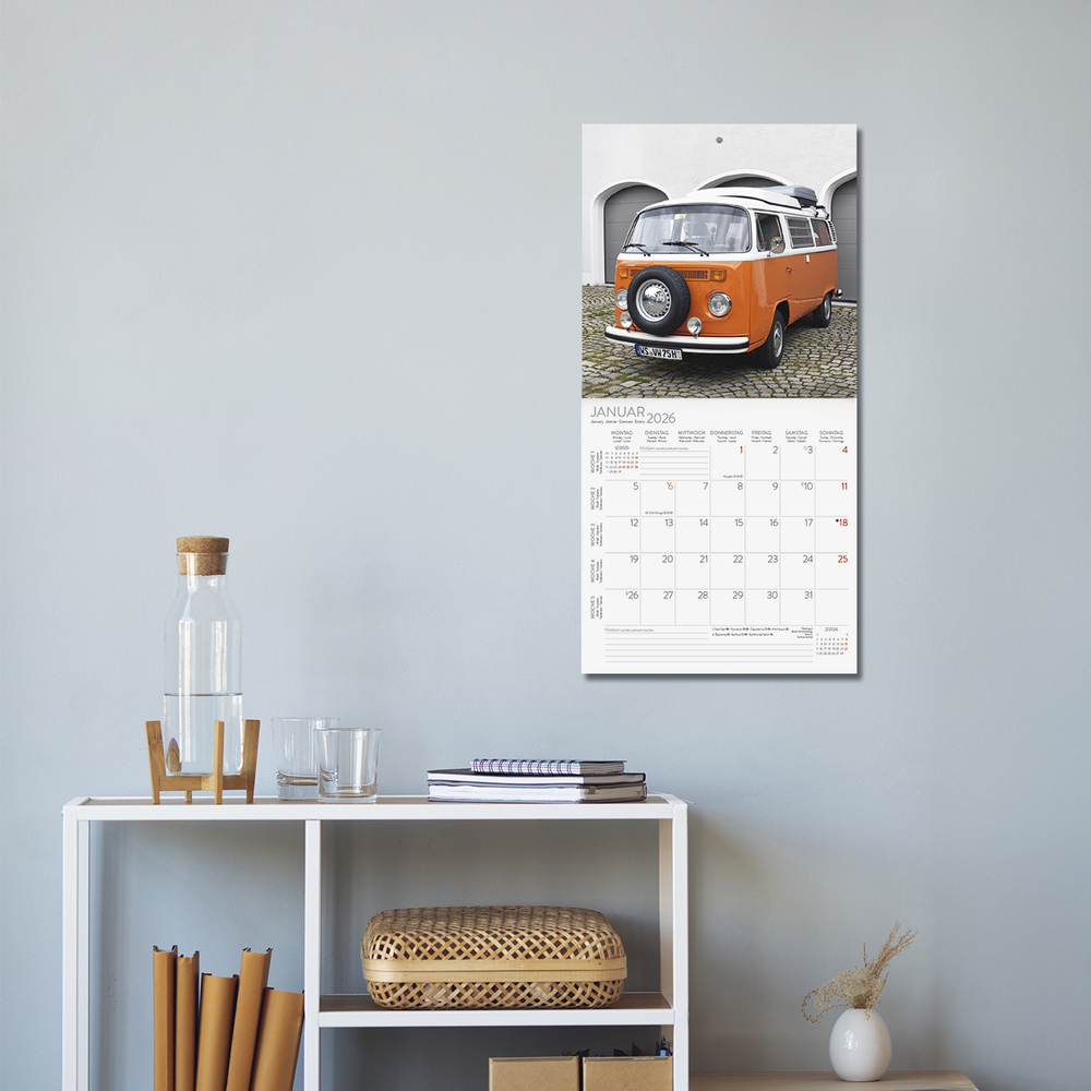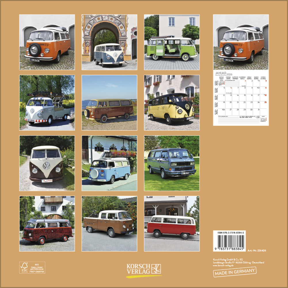 Ob als Wohnmobil, Familienfahrzeug, Transporter oder begehrtes Sammlerobjekt, eine gelungene Auswahl an Kult-Transportern ziert diesen praktischen Kalender.