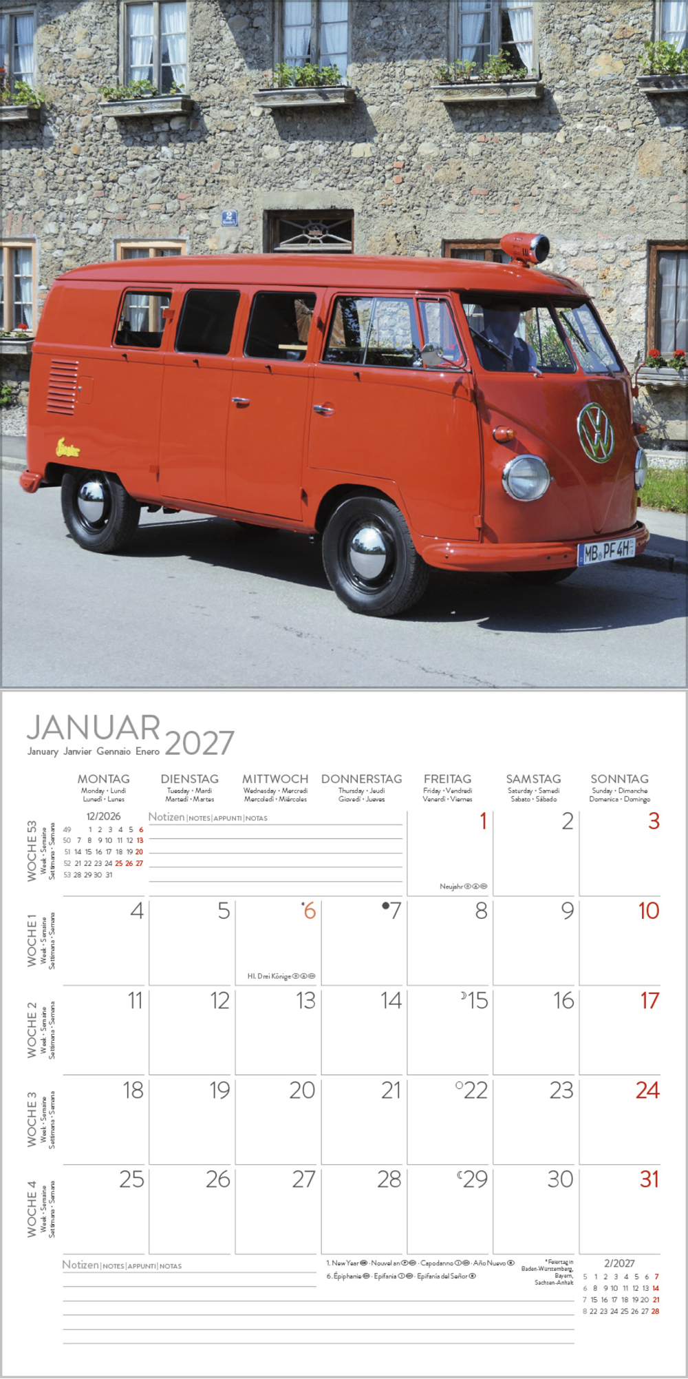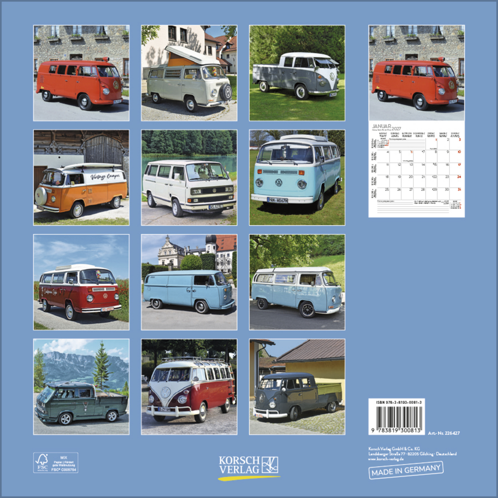 Ob als Wohnmobil, Familienfahrzeug, Transporter oder begehrtes Sammlerobjekt, eine gelungene Auswahl an Kult-Transportern ziert diesen praktischen Kalender.