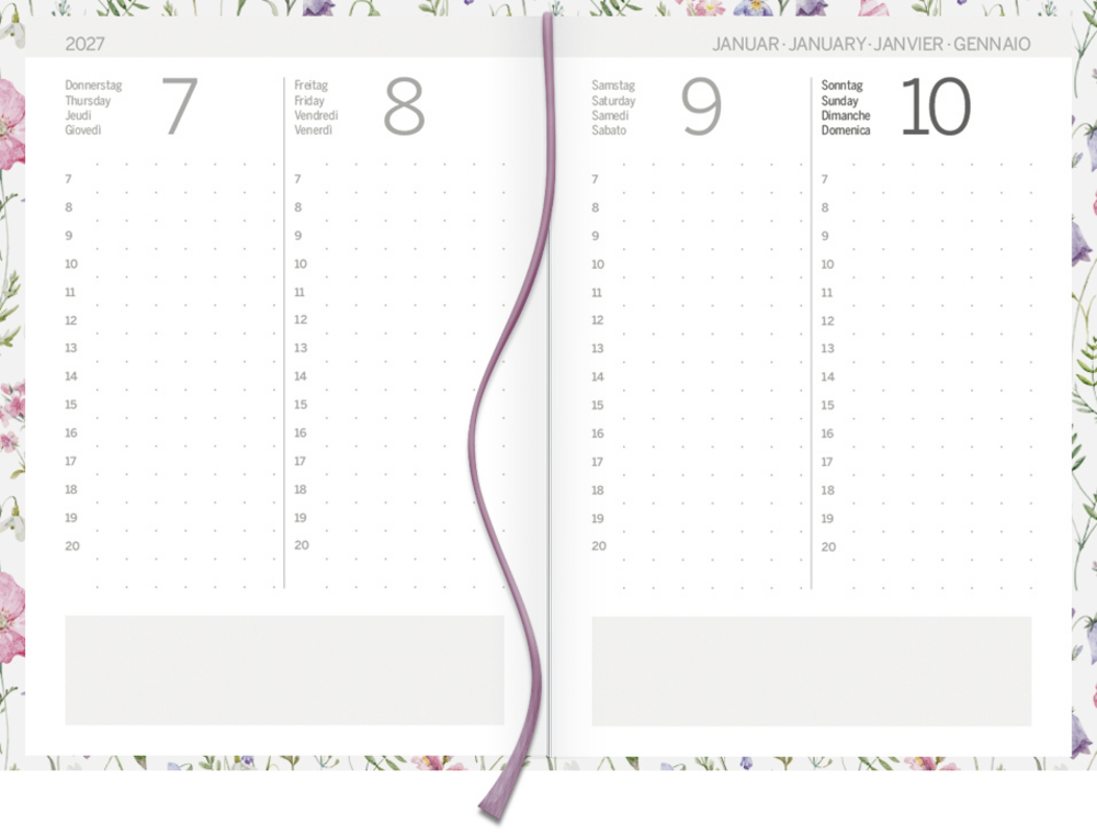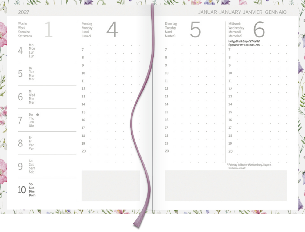 Der praktische Taschenplaner für die moderne Frau mit 4 Seiten pro Woche zum Eintragen und hochwertigem Einband mit einem floralen Motiv.