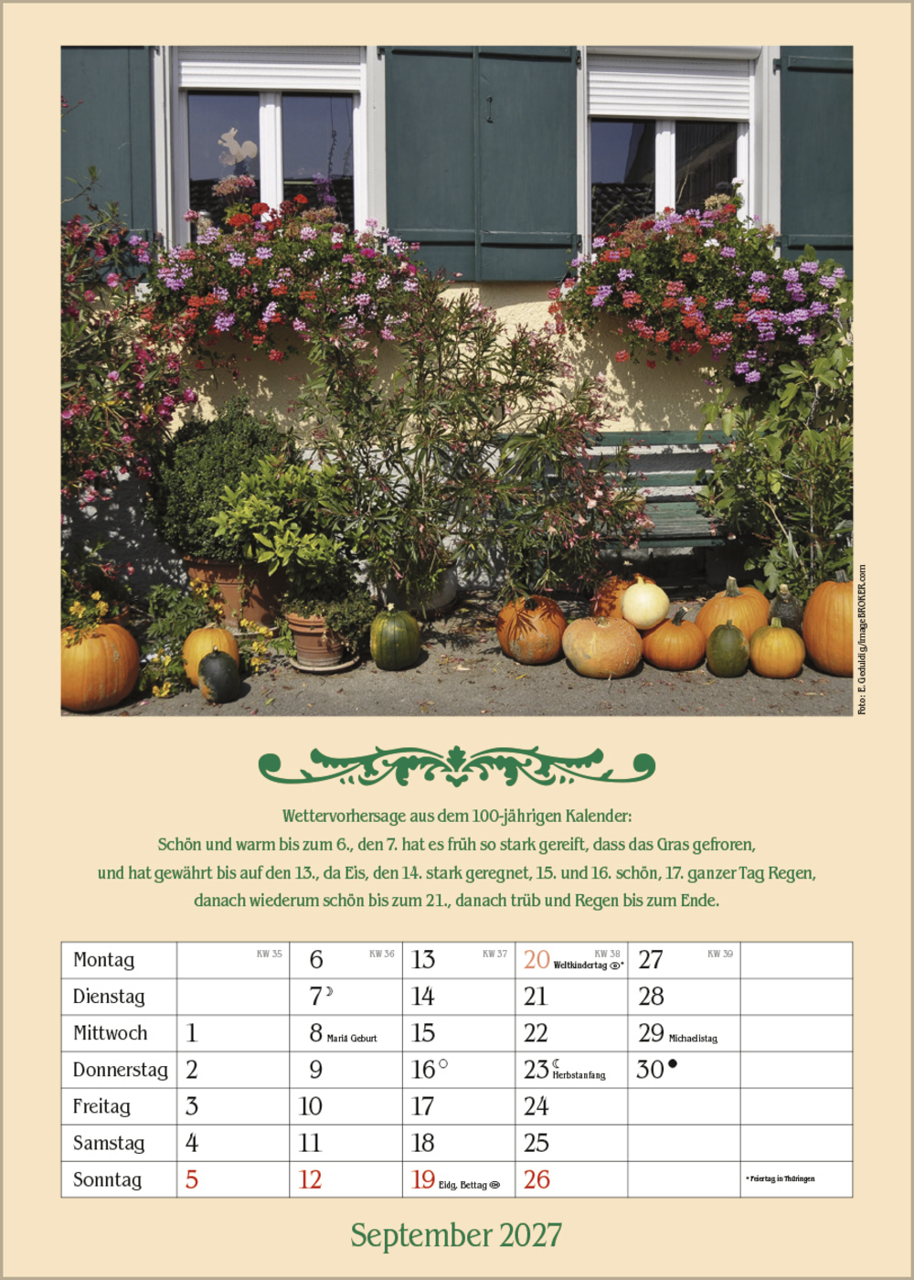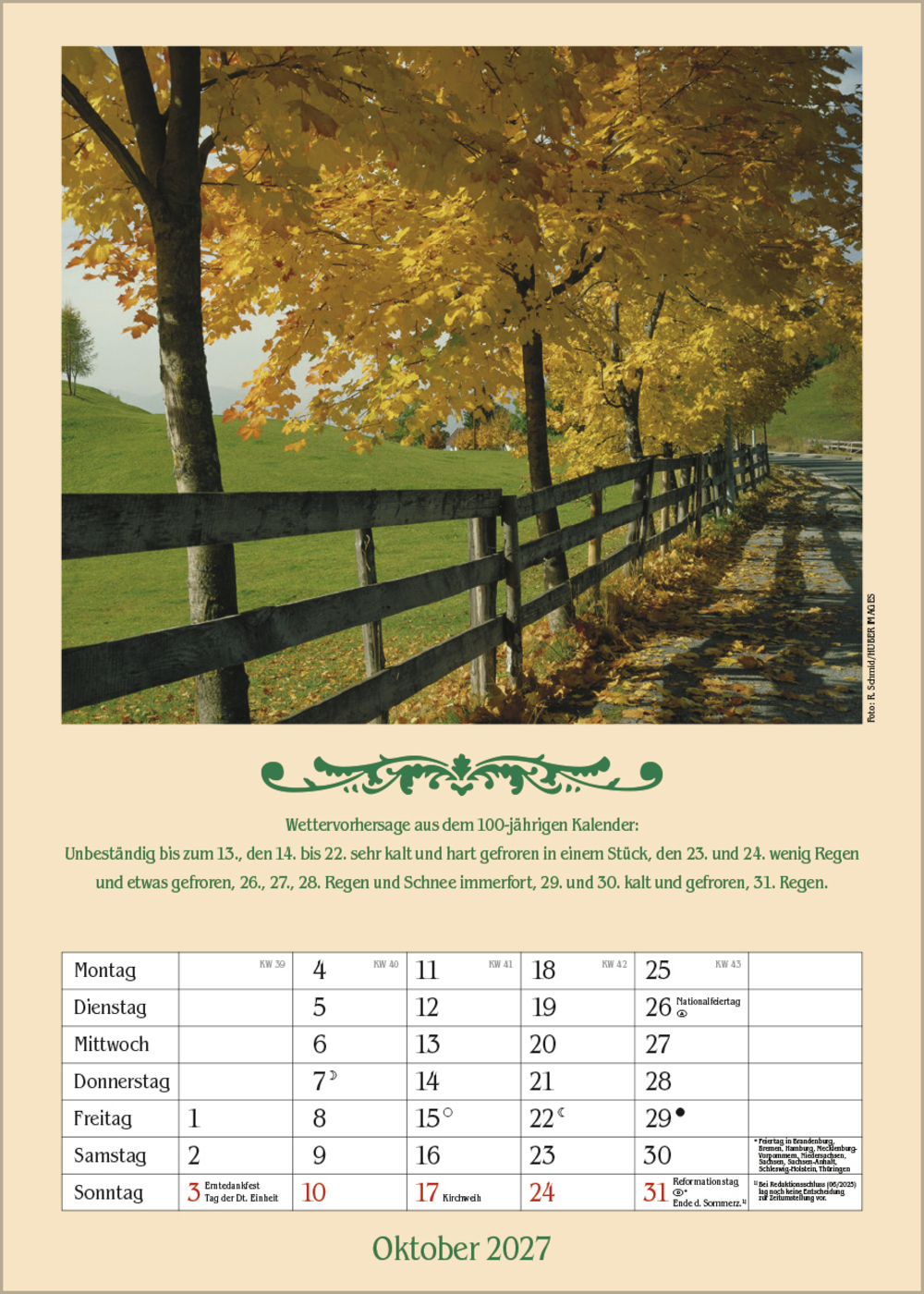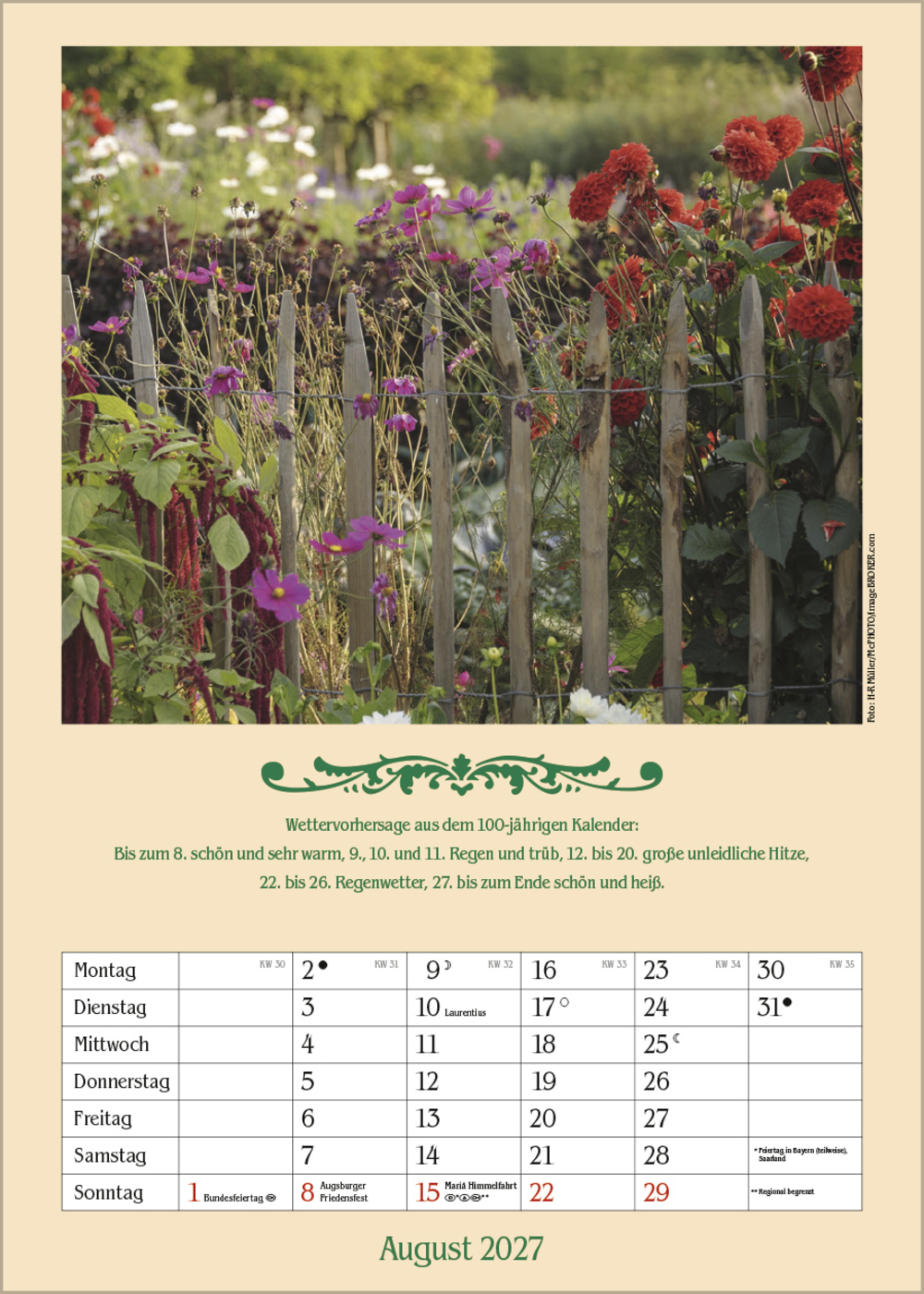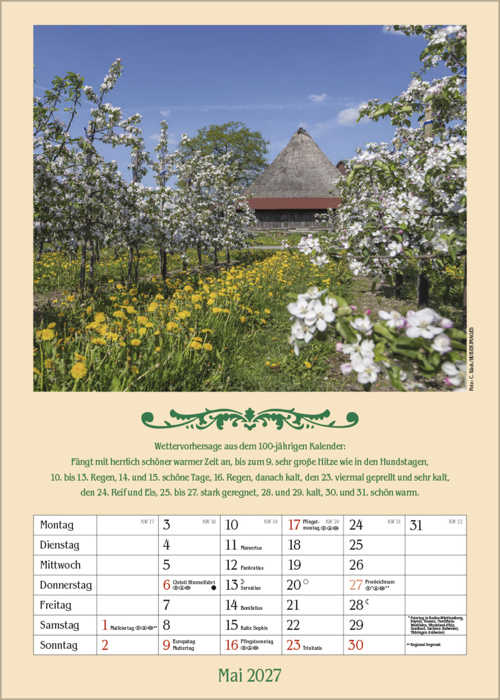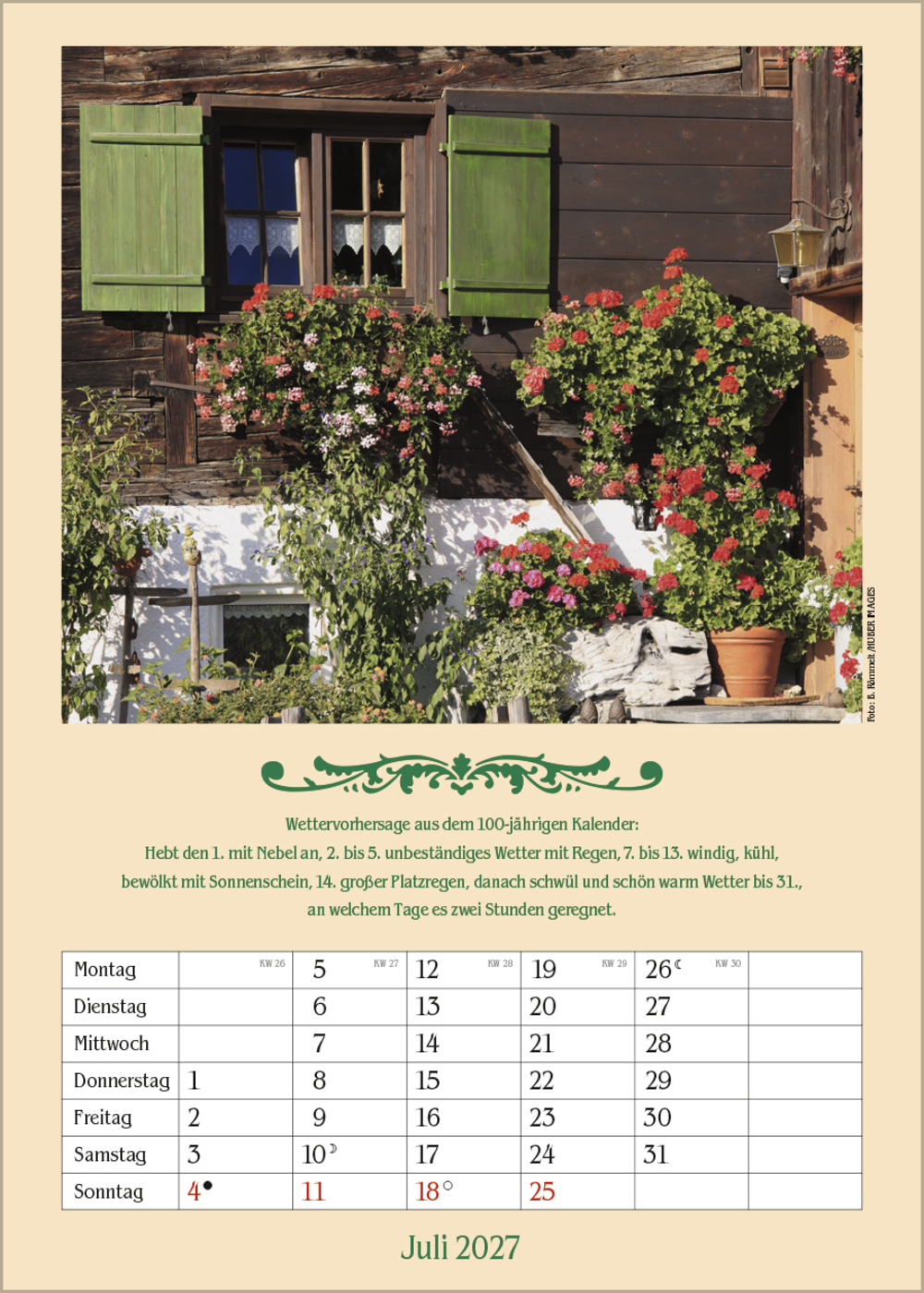 Ein romantischer Kalender mit schönen Fotos ländlicher Idyllen, Prophezeiungen aus dem Hundertjährigen Kalender und Platz für Eintragungen.
