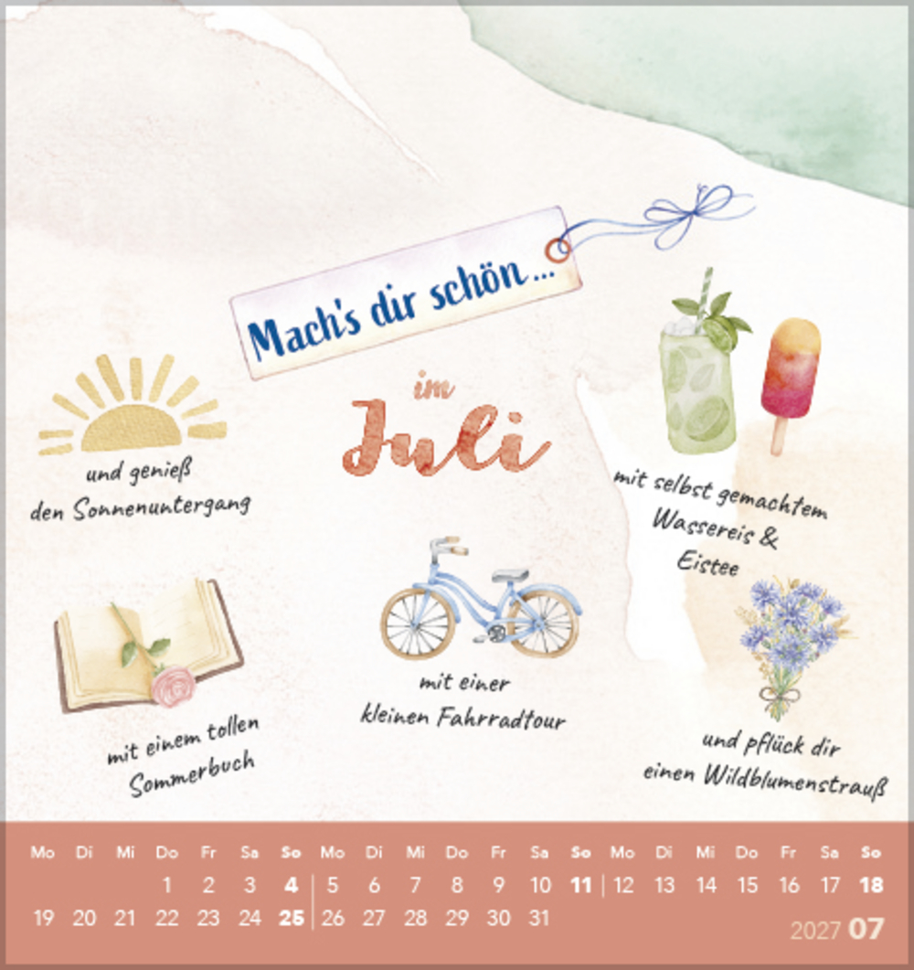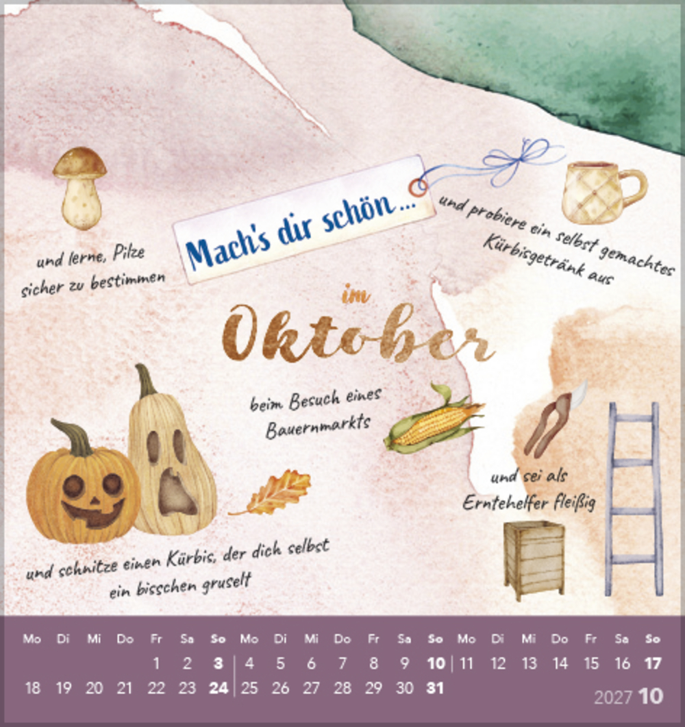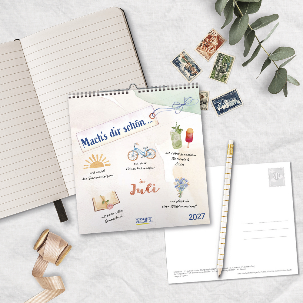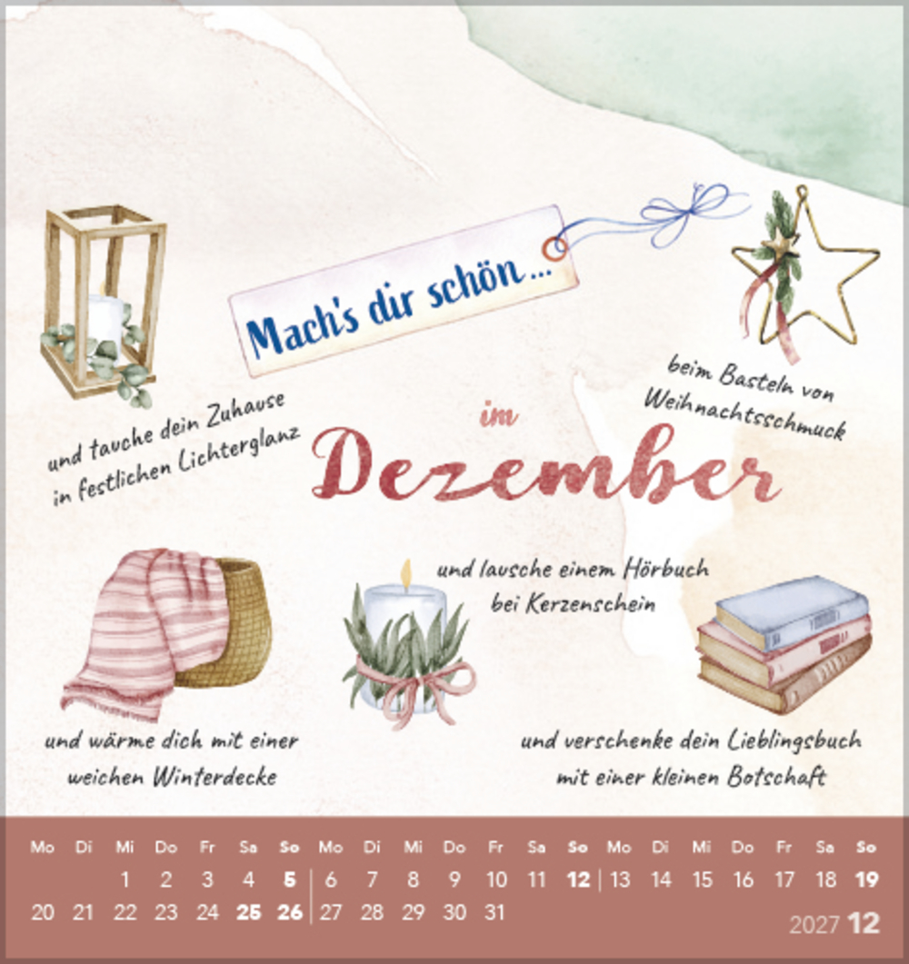 Ob ein Buch, ein Sonnenuntergang oder ein kleiner selbst gemachter Genuss – dieser Postkartenkalender erinnert Monat für Monat daran, sich im Alltag bewusst kleine Wohlfühlmomente zu gönnen. Liebevolle Illustrationen und warm formulierte Impulse machen jede Seite zu einem sanften Begleiter durch das Jahr. Ein dekorativer Aufsteller, der den Blick auf das Schöne lenkt und immer wieder ein kleines Innehalten schenkt.