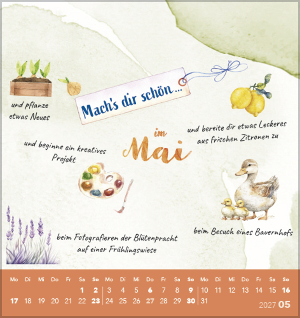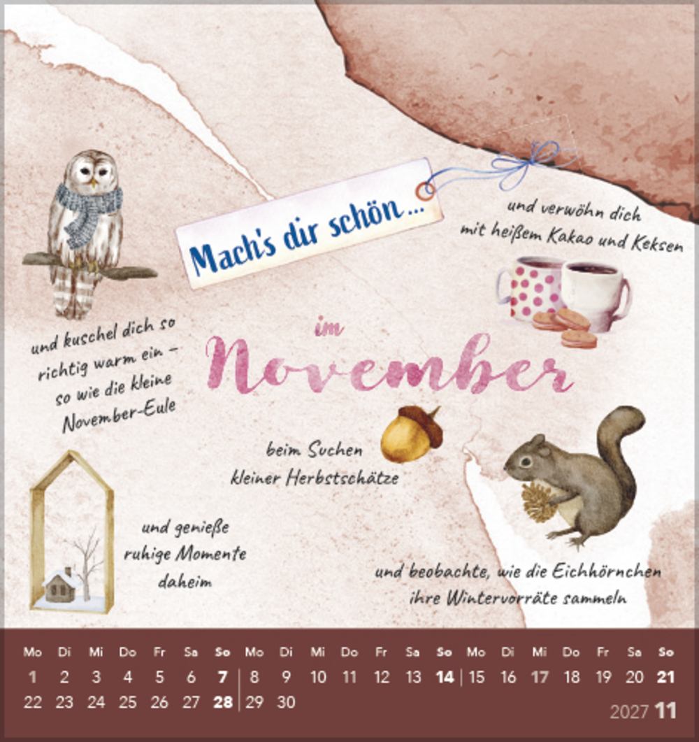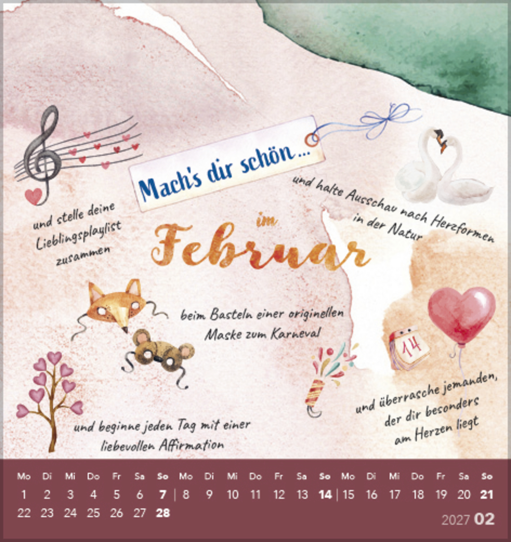 Ob ein Buch, ein Sonnenuntergang oder ein kleiner selbst gemachter Genuss – dieser Postkartenkalender erinnert Monat für Monat daran, sich im Alltag bewusst kleine Wohlfühlmomente zu gönnen. Liebevolle Illustrationen und warm formulierte Impulse machen jede Seite zu einem sanften Begleiter durch das Jahr. Ein dekorativer Aufsteller, der den Blick auf das Schöne lenkt und immer wieder ein kleines Innehalten schenkt.