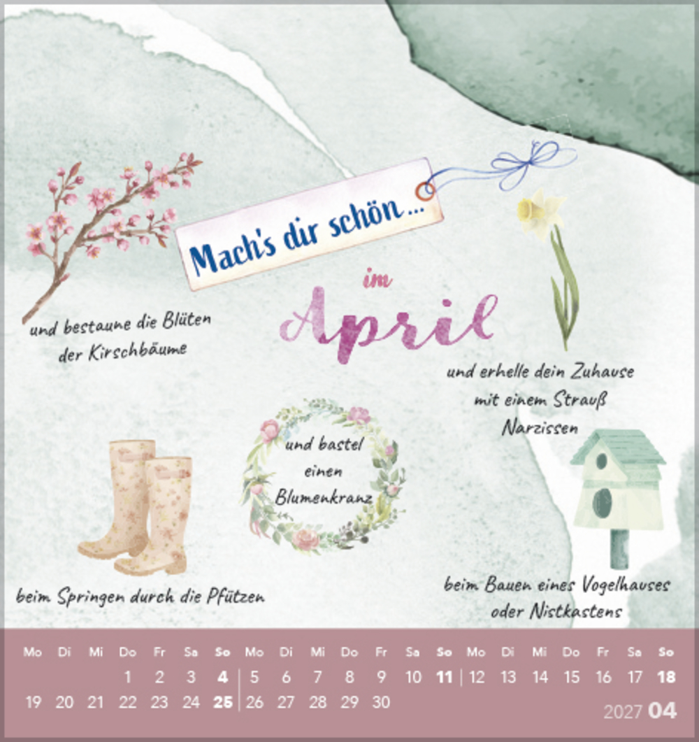 Jedes Kalenderblatt ist so gestaltet, dass es einfach abzutrennen ist. Somit können Sie jeden Monat eine Postkarte mit einem schönen Spruch versenden oder verschenken.