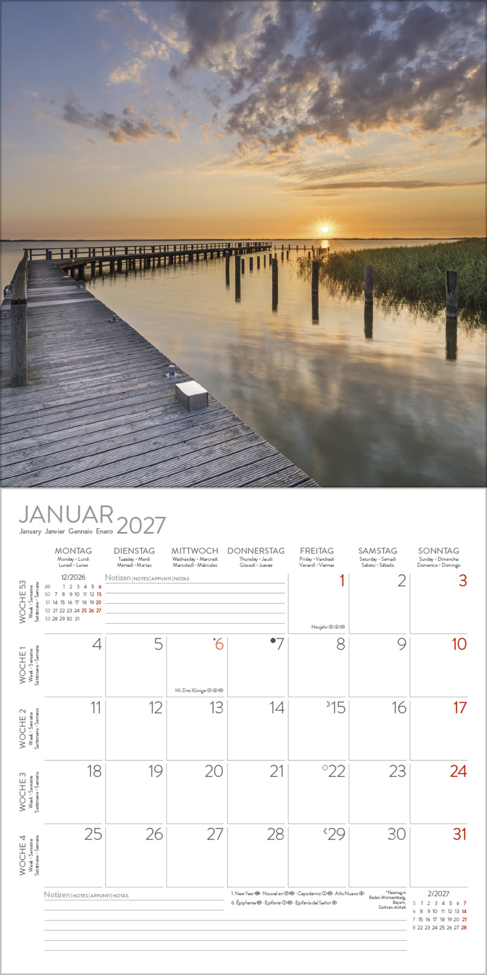 - Jede Kalenderseite mit großem Bild und viel Platz im Kalendarium für Notizen und Termine