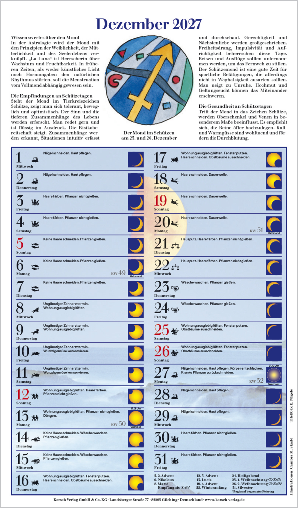 Großformatiger Mondkalender für die praktische Tagesplanung im Zeichen des Mondes. Mit ausführlichen Zusatzinformationen zu Wissenswertem, Empfindungen und Gesundheit in den einzelnen Tierkreiszeichen.