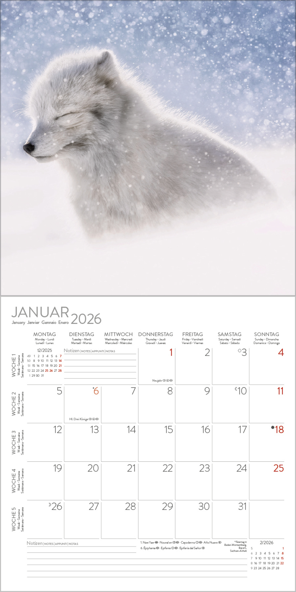 Hochwertig und ohne Plastikfolie präsentiert dieser Kalender einzigartige und stimmungsvolle Tierfotografien, die faszinierende Augenblicke der Tierwelt einfangen. Ein Muss für alle, die die Kunst der Tierfotografie schätzen. Mit Platz für Eintragungen im Kalendarium, Jahresübersicht und Ferienterminen.