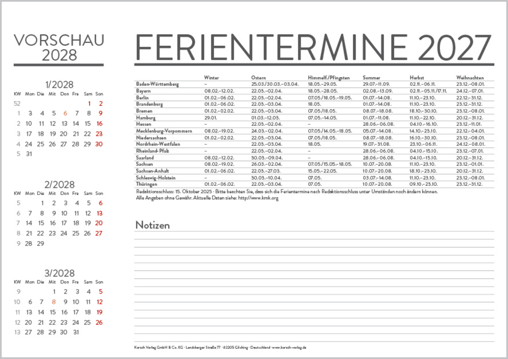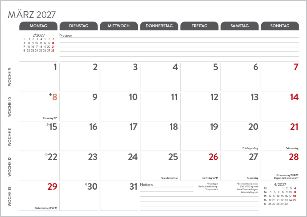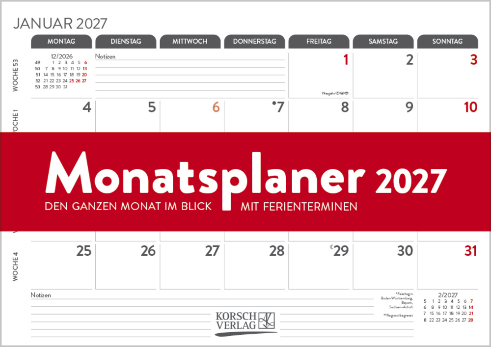 Praktischer Wandplaner im zweifarbigen Design mit viel Platz zum Eintragen. Inklusive Ferienterminen und Vorschau bis März des Folgejahres. Kalendarium in Deutsch.