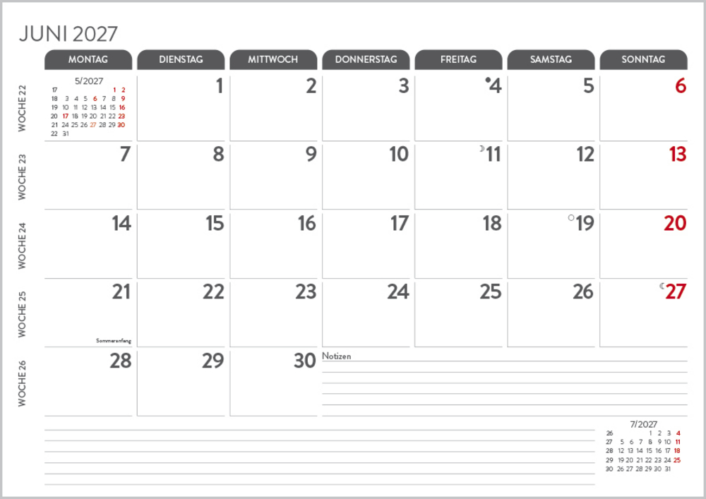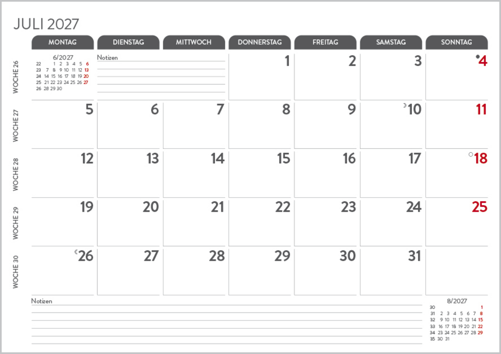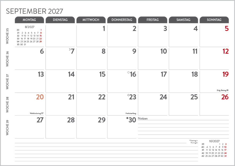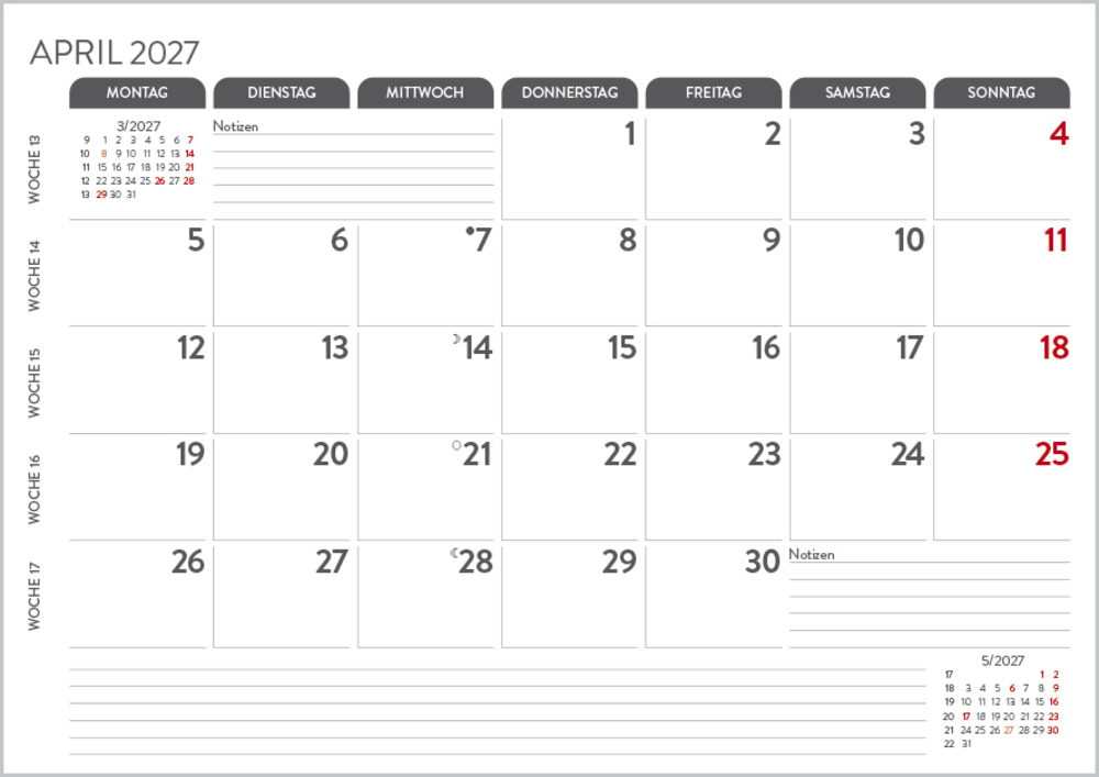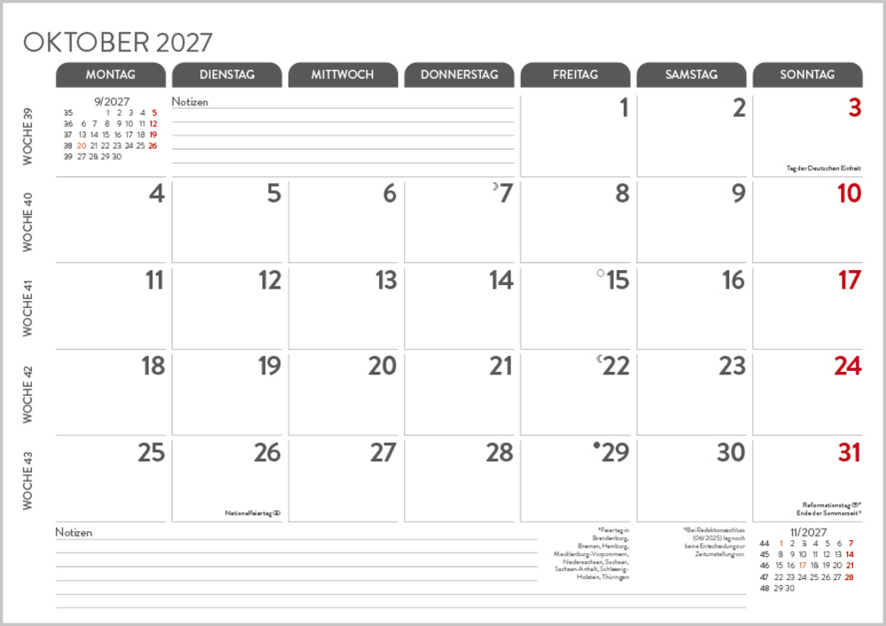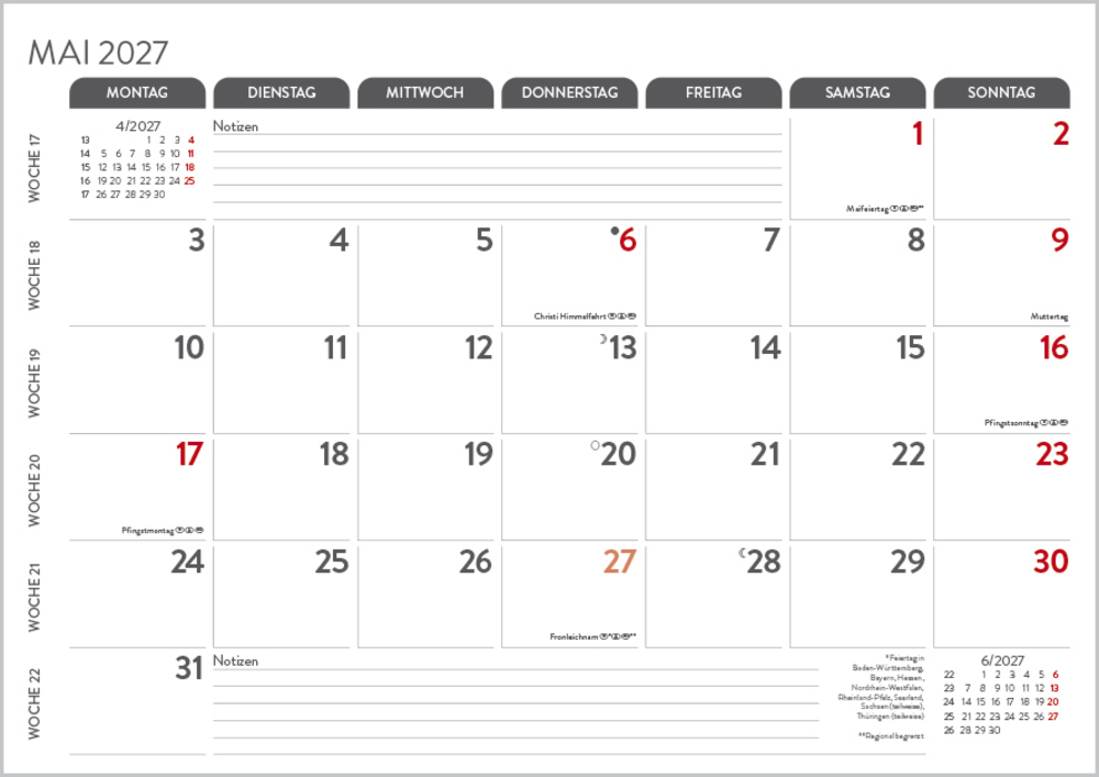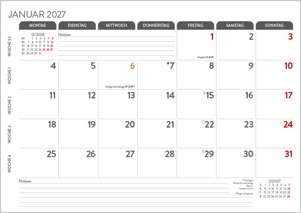 - Kalendarium auf Deutsch mit hervorgehobenen Sonn– und Feiertagen für D, A und CH