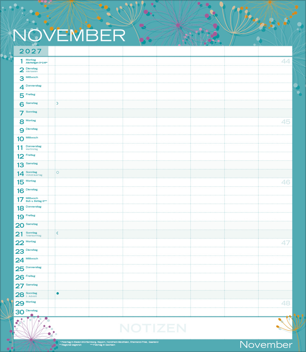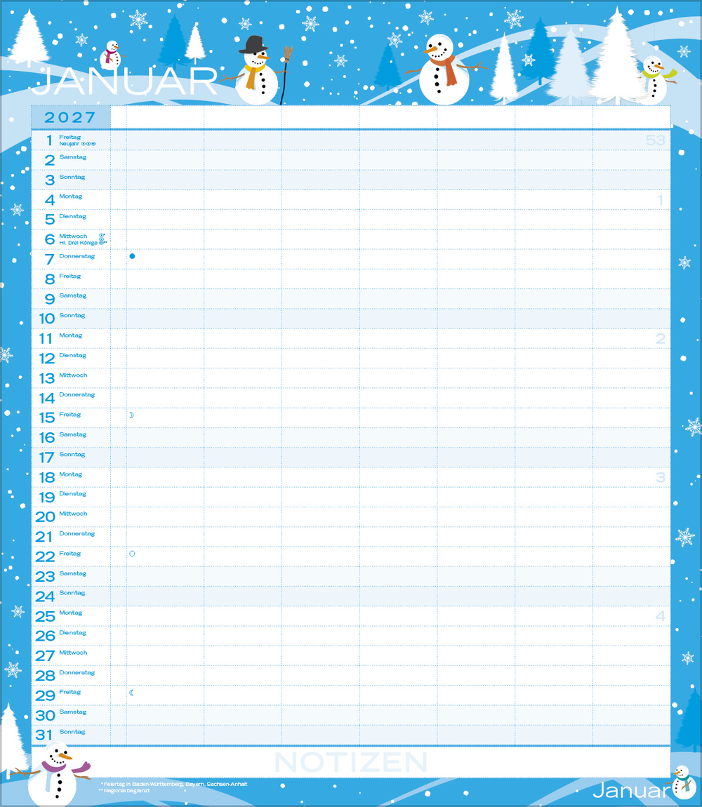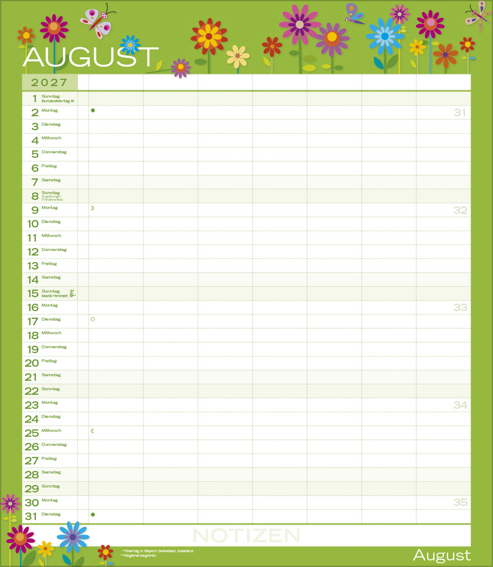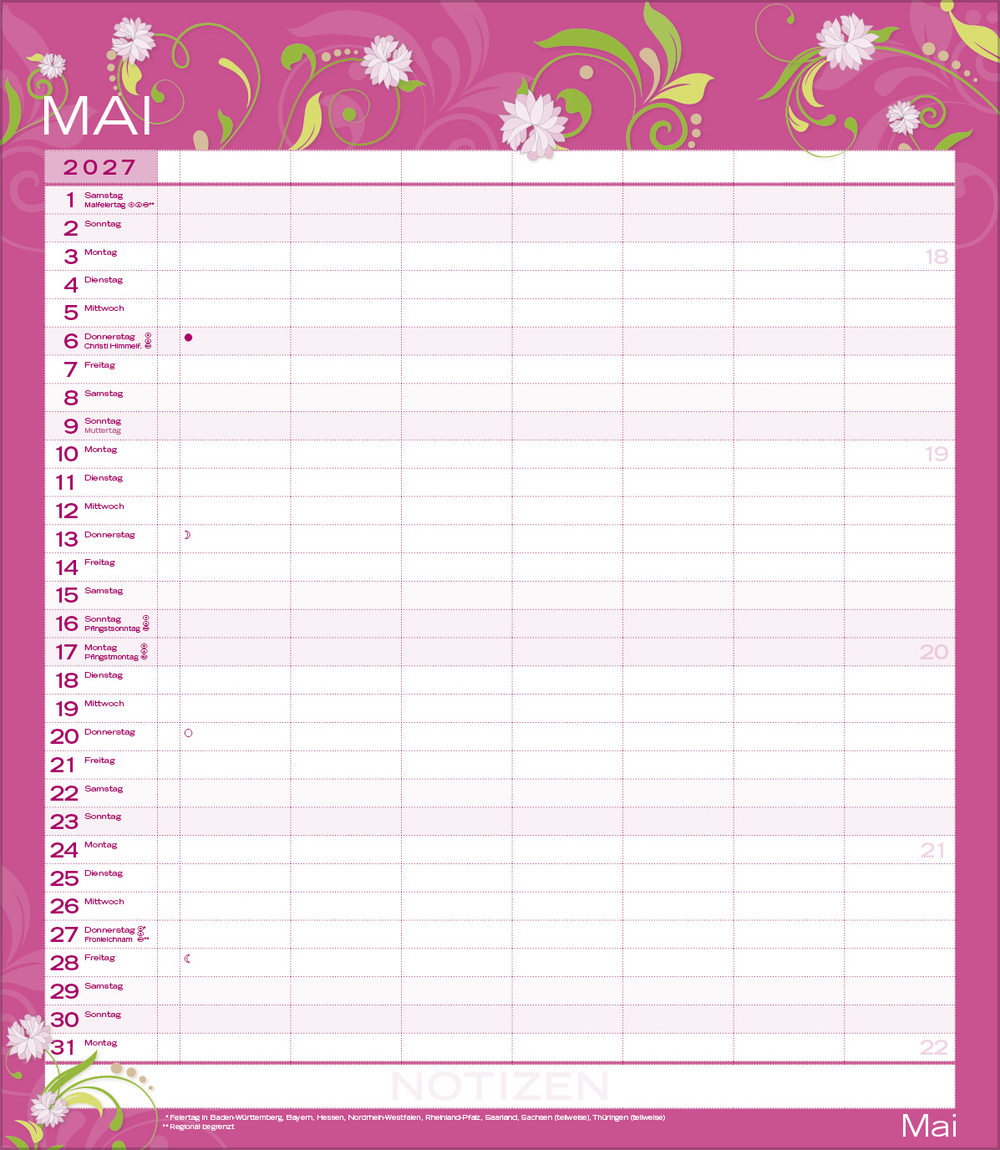 Weitere Informationen wie Mondphasen, Ferientermine und Feiertage (auch regionale) sowie deutlich lesbare Kalenderwochen runden den Kalender ab und sorgen für einen vollständigen Überblick Ihres Jahres.