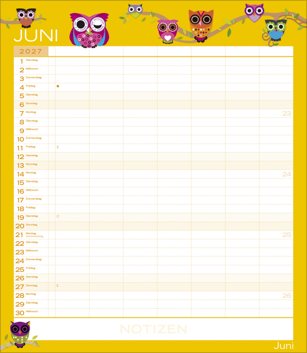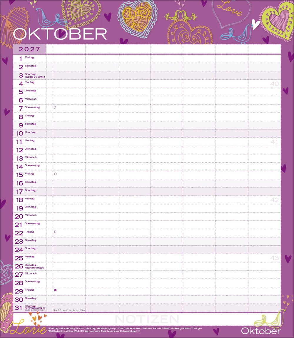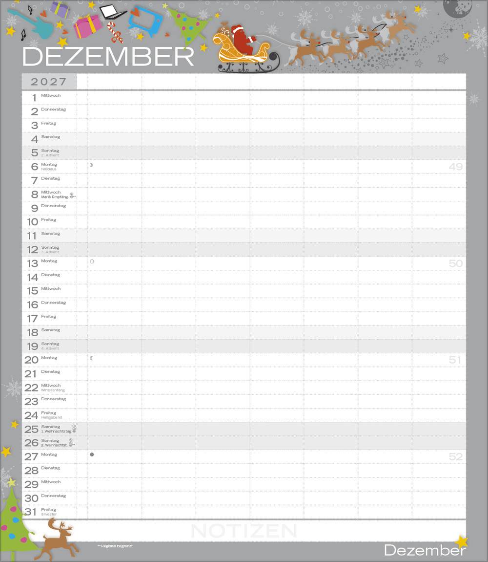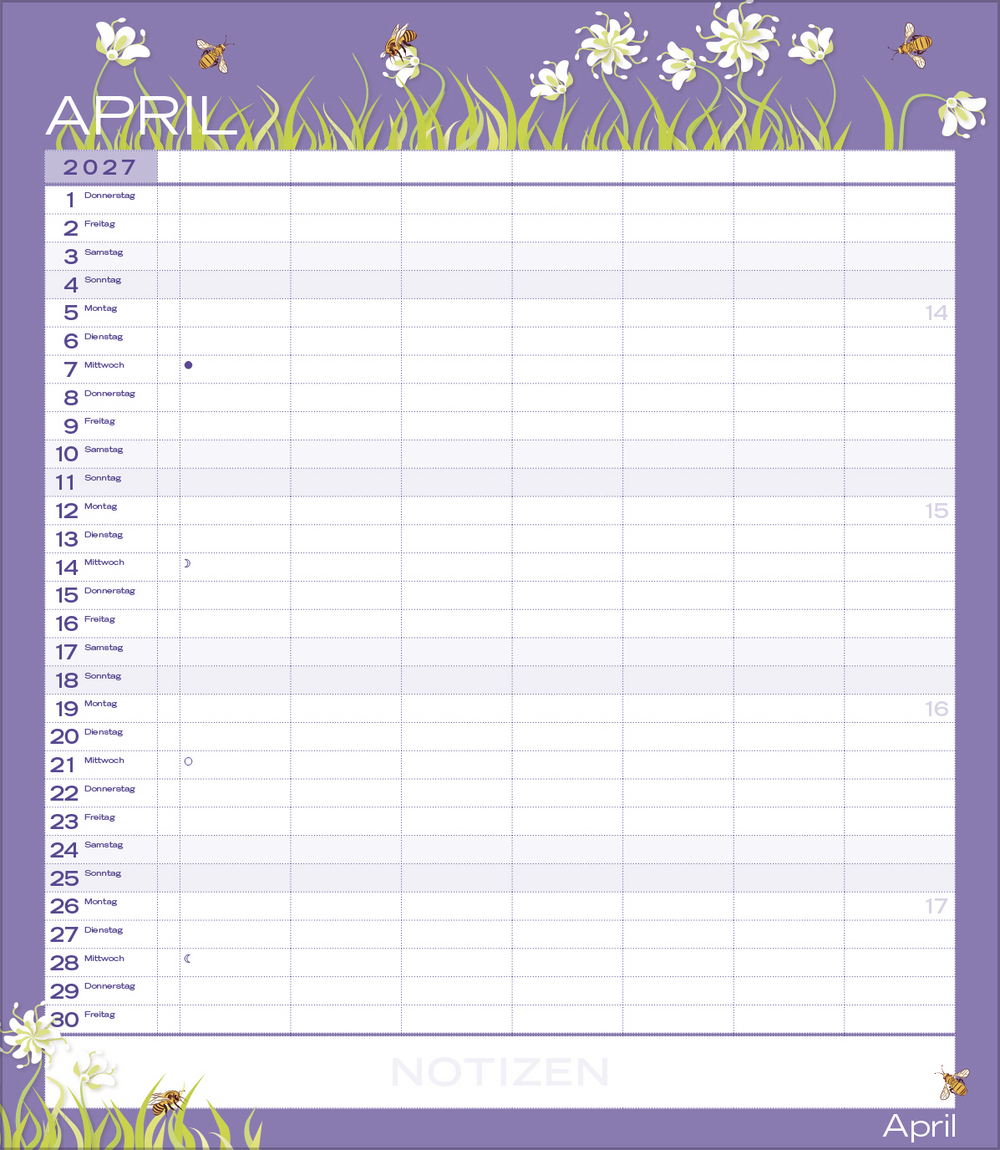 Weitere Informationen wie Mondphasen, Ferientermine und Feiertage (auch regionale) sowie deutlich lesbare Kalenderwochen runden den Kalender ab und sorgen für einen vollständigen Überblick Ihres Jahres.